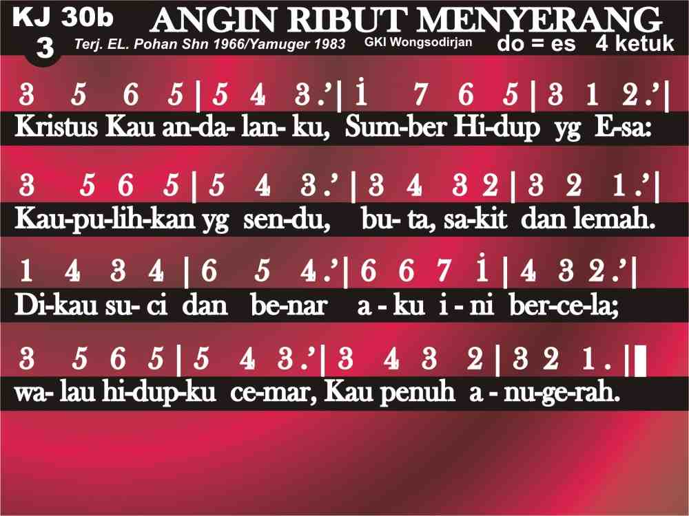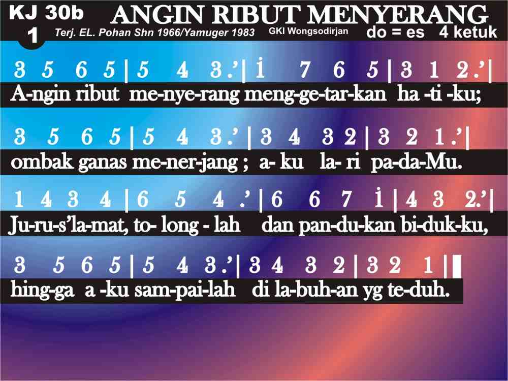 KJ. 30b ANGIN RIBUT MENYERANG Angin ribut menyerang menggetarkan hatiku; Ombak ganas menerjang; aku lari padaMu. Juruslamat, tolonglah dan pandukan bidukku, Hingga aku sampailah di labuhan yang teduh.
