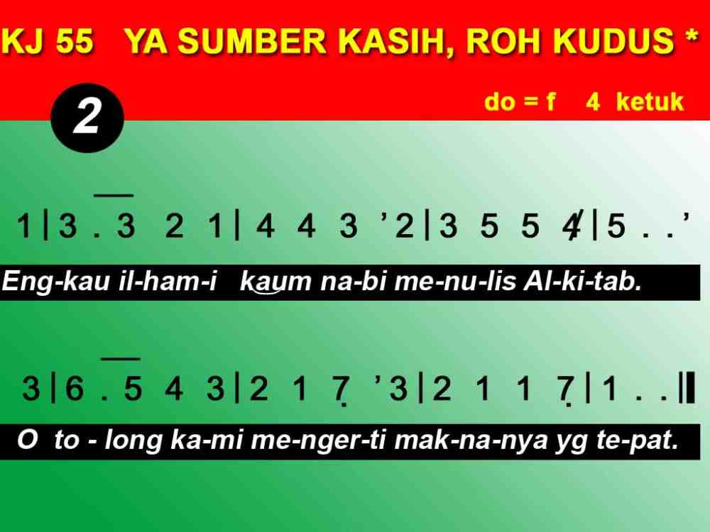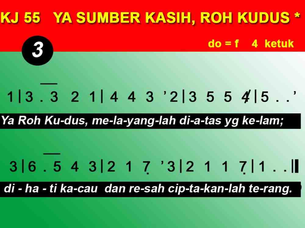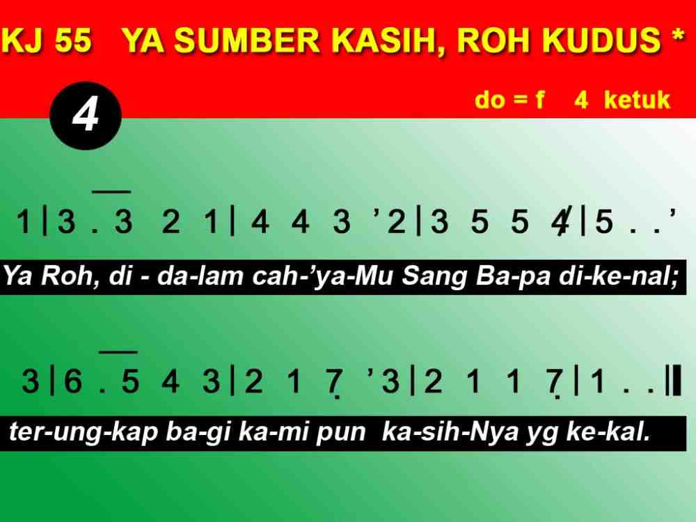 KJ. 55 YA SUMBER KASIH, ROH KUDUS 1. Ya Sumber Kasih, Roh Kudus, pancarkan apiMu, sehingga hati kami pun penuh semangatMu! 2. Engkau ilhami kaum nabi menulis Alkitab. O tolong kami mengerti maknanya yang tepat. 3. Ya Roh Kudus, melayanglah di atas yang kelam; di hati kacau dan resah ciptakanlah terang. 4. Ya Roh di dalam cah'yaMu Sang Bapa dikenal; terungkap bagi kami pun kasihNya yang kekal.