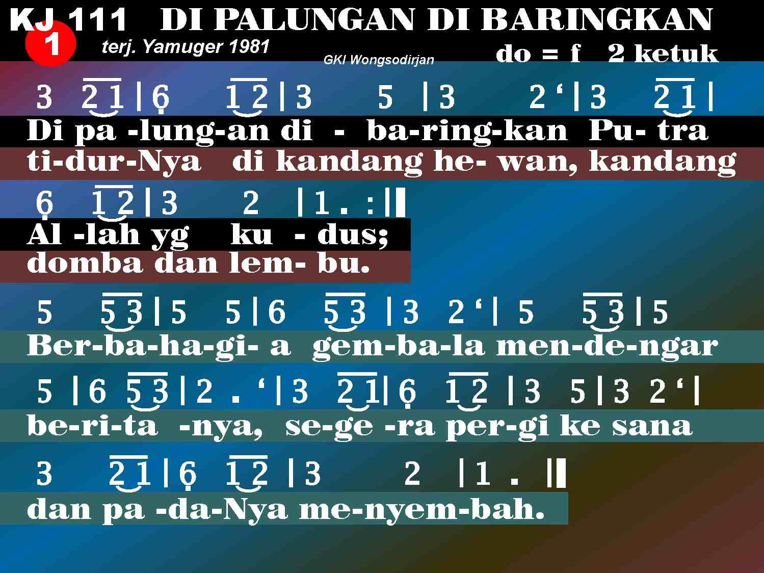 KJ. 111 DI PALUNGAN DIBARINGKAN 1. Di palungan dibaringkan Putra Allah yang kudus; tidurNya di kandang hewan, kandang domba dan lembu. Berbahagia gembala mendengar beritanya, Segera pergi ke sana dan padaNya menyembah. 2. Berbahagia semua yang mendapat kabarnya, apalagi yang menyambut Dia dalam hatinya. Anak suci, Jurus'lamat, kandang hewan rumahMu, Sudilah, ya Yesus turun juga dalam hatiku. 3. Hatiku Engkau dapati bagai kandang tak bersih; maukah Tuhan mendiami hati hina dan keji? Tuhan Yesus, mari masuk, buat Natal bagiku, Hatiku jadikan sorga oleh kehadiranMu. 4. Dan kepada tiap orang yang hatinya membeku, kar'na tidak menghayati arti kelairanMu, b'rilah, Tuhan, dari sorga sukacita yang kudus, agar ikut merayakan Hari Lahir Penebus!