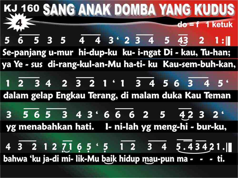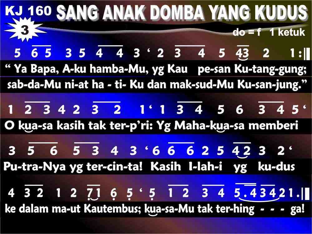 KJ. 160 SANG ANAKDOMBA YANG KUDUS 1. Sang Anakdomba yang kudus memikul dosa dunia, rela dan sabar menebus hutang besar manusia. Lihatlah Dia menempuh jalan sengsara dan keluh, Menurut dan setia. Ia dihina, disesah, mati di salib Golgota, Berkata: "Ku sedia." 2. Dialah Jurus'lamatku, Kawan yang tak bertara, Pembawa damai yang penuh, disuruh Allah Bapa: "Pergilah Kau, hai anakKu, terimalah di pundakMu akibat dosa dunia; bebaskanlah manusia dari hukuman dan cela: Engkaulah Penebusnya." 3. "Ya Bapa, Aku HambaMu, yang Kau pesan Kutanggung; sabdaMu niat hatiKu dan maksudMu Kusanjung." O kuasa kasih tak terp'ri Yang Mahakuasa memberi PutraNya yang tercinta! Kasih Ilahi yang kudus, Ke dalam maut kau tembus: kuasamu tak terhingga! 4. Sepanjang umur hidupku kuingat Dikau, Tuhan; ya Yesus, di rangkulanMu hatiku Kausembuhkan. Dalam gelap Engkau Terang, di malam duka Kau Teman Yang menabahkan hati. Inilah yang menghiburku, Bahwa 'ku jadi milikMu baik hidup maupun mati. 5. Kau, Anakdomba yang lembut, kupuji siang-malam dan diriku dengan syukur padaMu kuserahkan. Biarlah daya hidupku melimpah-ruah bagiMu Mengungkap t'rimakasih, hingga pahala karyaMu Yang Kauperoleh bagiku kuingat tiap hari. 6. Hendak kuminum cawanMu dalam KerajaanMu; darahMu kemegahanku dan pembersih jubahku. Mahkota hidup yang baka akan kupakai menyembah menghadap takhta Bapa. Kaulah kekal Pengantinku: tak bercela di sisiMu 'ku masuk rumah Allah.