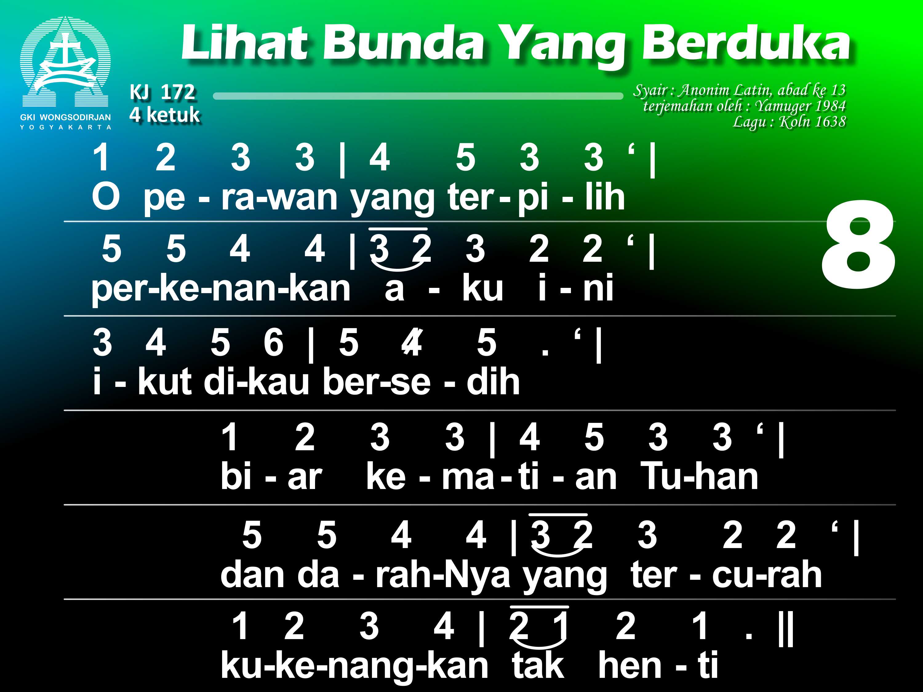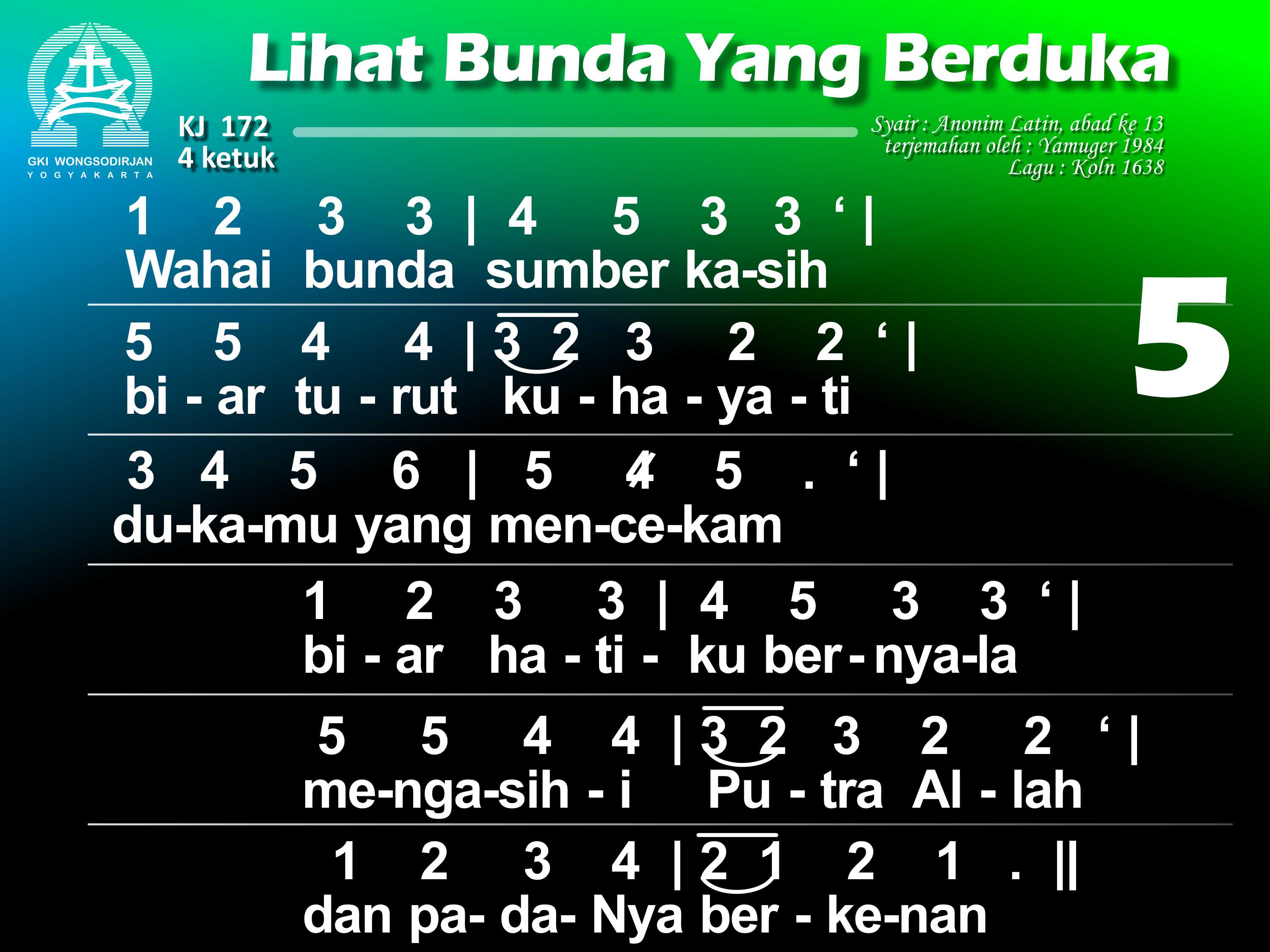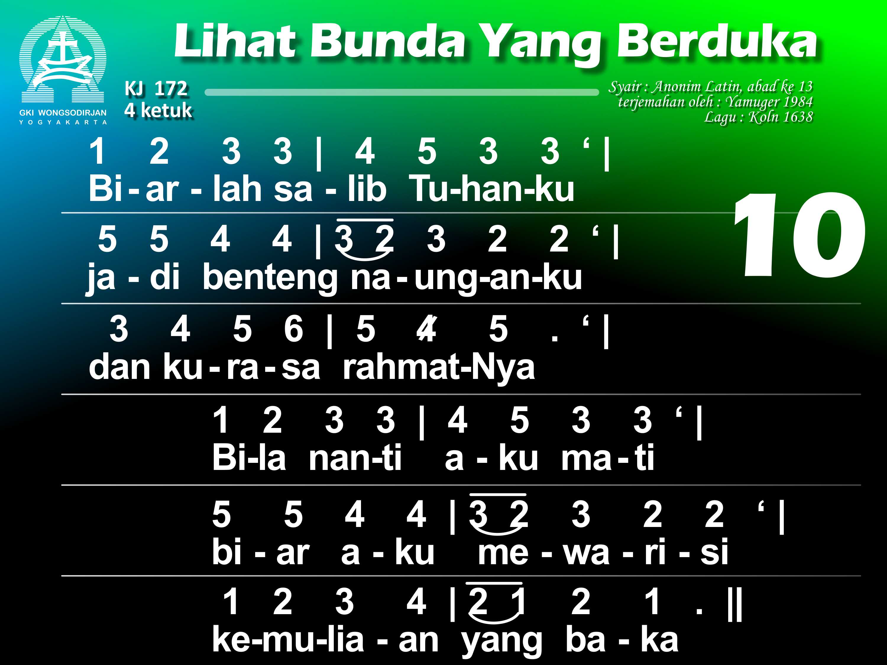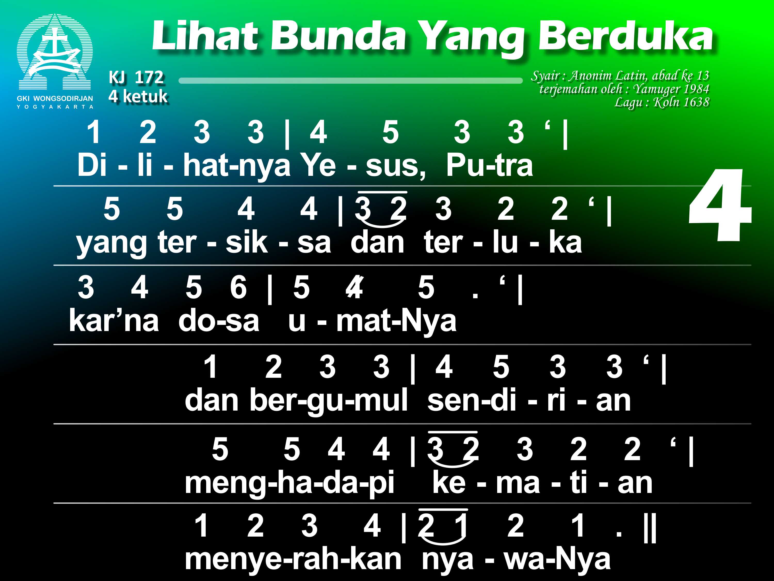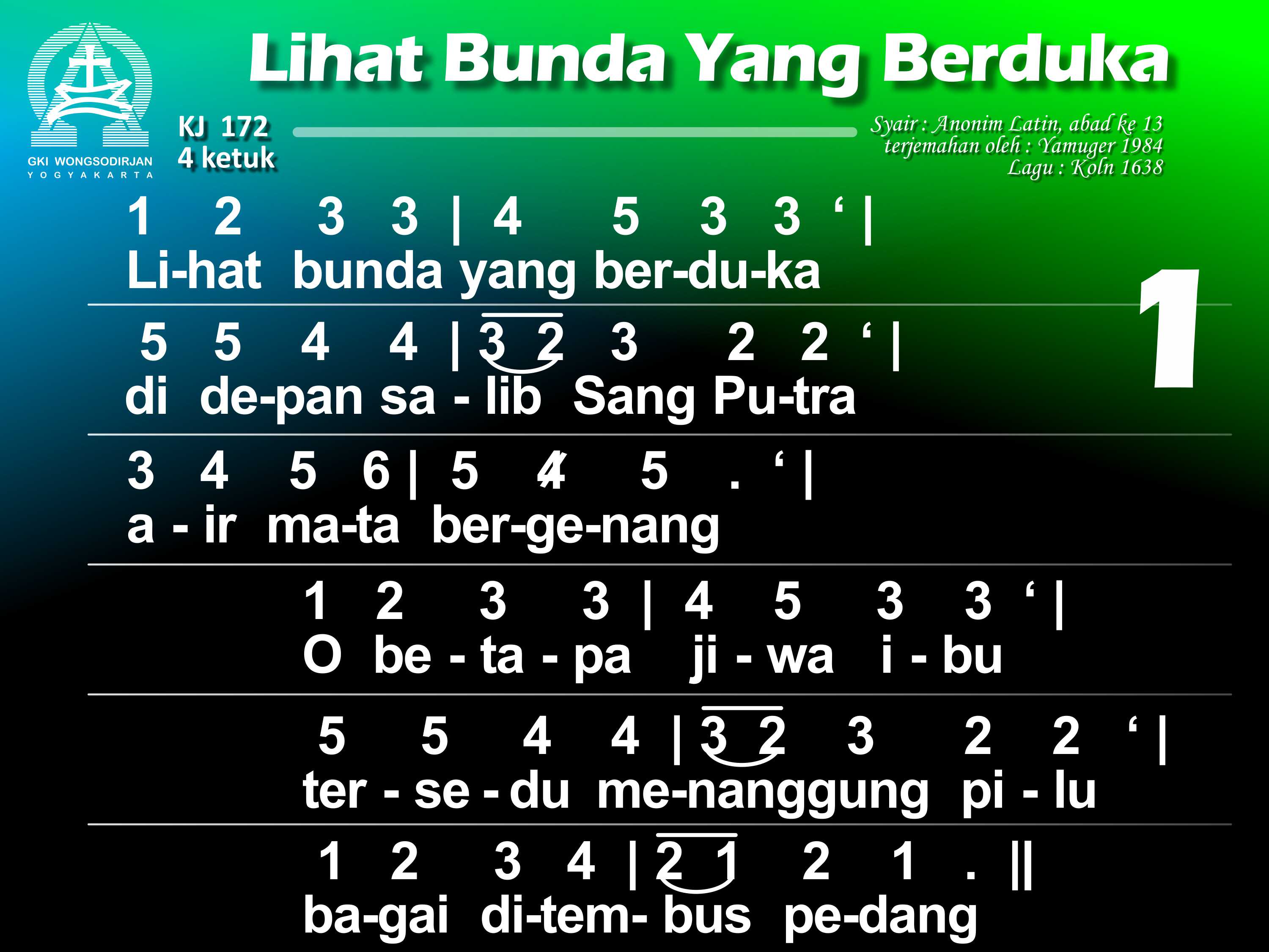 KJ. 172 LIHAT BUNDA YANG BERDUKA 1. Lihat bunda yang berduka di depan salib Sang Put'ra; air mata bergenang. O betapa jiwa ibu tersedu menanggung pilu, bagai ditembus pedang. 2. Bunda Put'ra Tunggal Allah disebut "yang berbahagia" kini sangat bersedih. Hatinya dirundung duka, kar'na Put'ra yang termulia bersengsara di salib. 3. O siapa tidak pilu menyaksikan bunda Kristus menangisi Put'ranya? Dan siapa tak tergugah menyelami duka bunda Dalam siksa Anaknya? 4. Dilihatnya Yesus, Put'ra, yang tersiksa dan terluka kar'na dosa umatNya dan bergumul sendirian menghadapi kematian menyerahkan nyawaNya. 5. Wahai bunda, sumber kasih, biar turut kuhayati dukamu yang mencekam; biar hatiku bernyala mengasihi Put'ra Allahdan padaNya berkenan. 6. Biarlah sengsara aib dari Dia yang tersalib tersemat di hatiku; yang ditanggungNya bagiku kudekap bersamamu. 7. Biar aku disampingmu pilu kar'na wafat Kristus di sepanjang hidupku; inilah keinginanku: di dekat salib Put'ramu besertamu tersedu. 8. O perawan yang terpilih, perkenankan aku ini ikut dikau bersedih; biar kematian Tuhan dan darahNya yang tercurah kukenangkan tak henti. 9. Biar aku pun terluka, menghayati salib Tuhan, digerakkan kasihNya. Hatiku engkau kobarkan; biar aku dibebaskan dalam penghakimanNya. 10. Biarlah salib Tuhanku jadi benteng naunganku dan kurasa rahmatNya. Bila nanti aku mati, biar aku mewarisi kemuliaan yang baka.