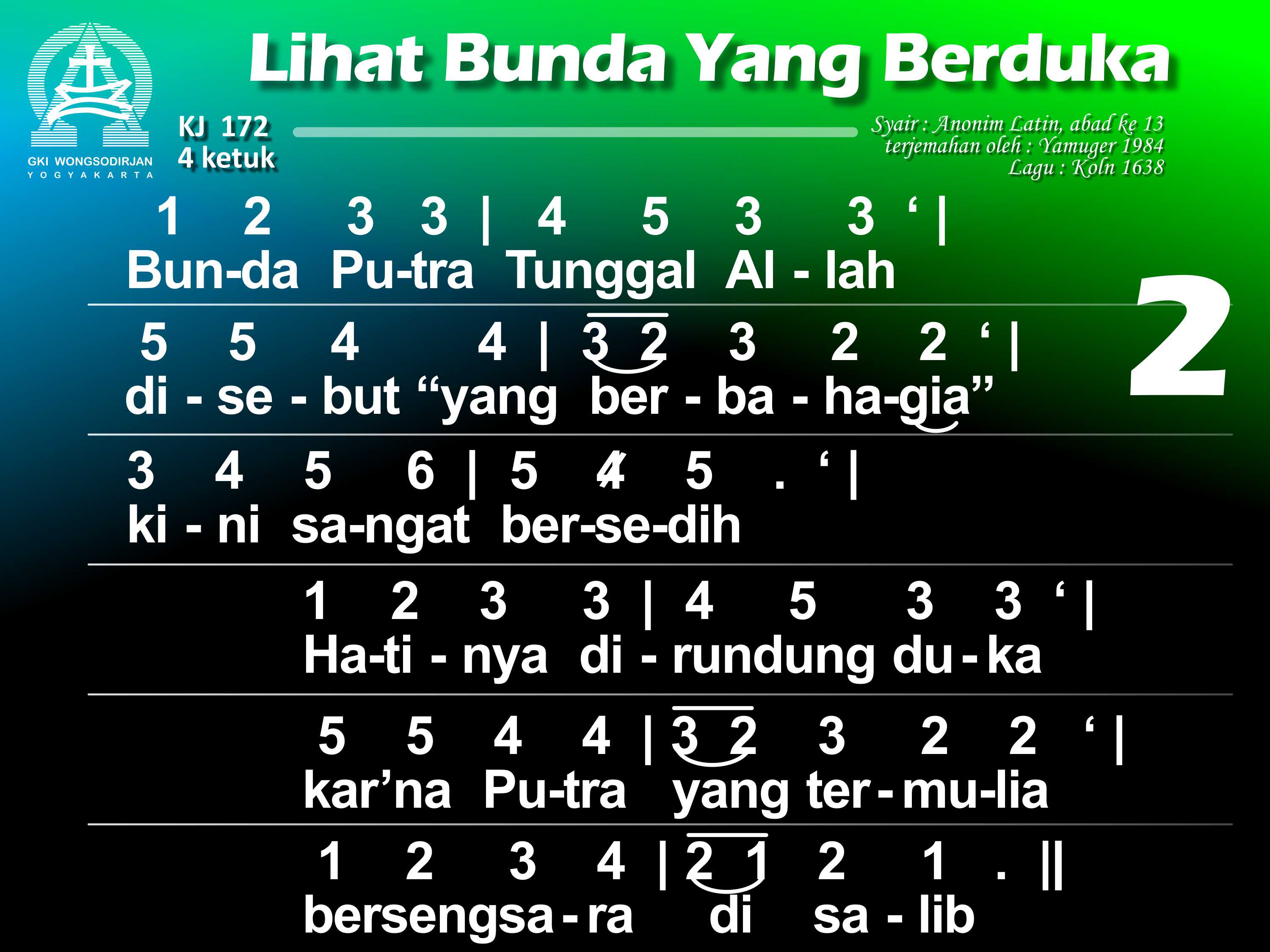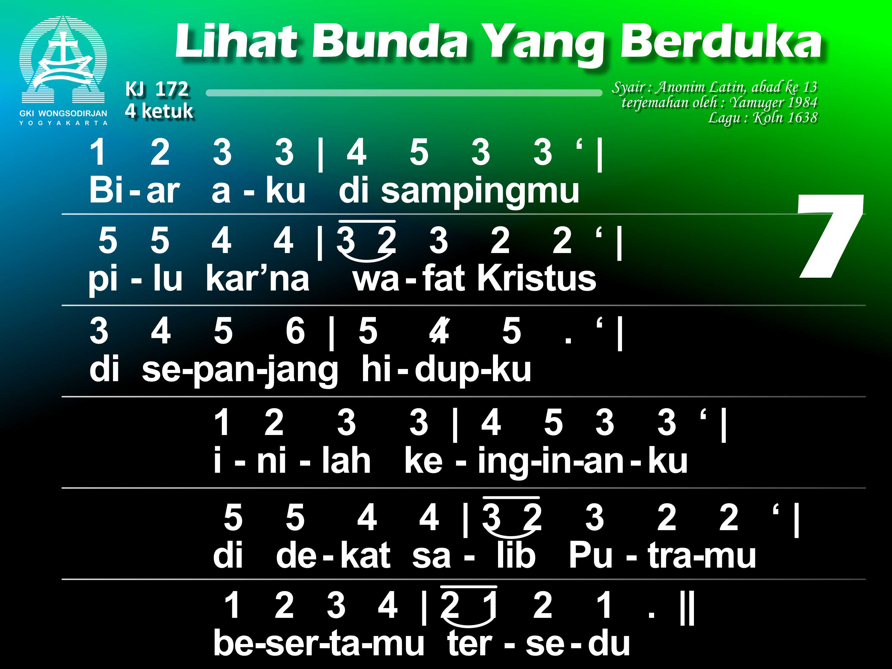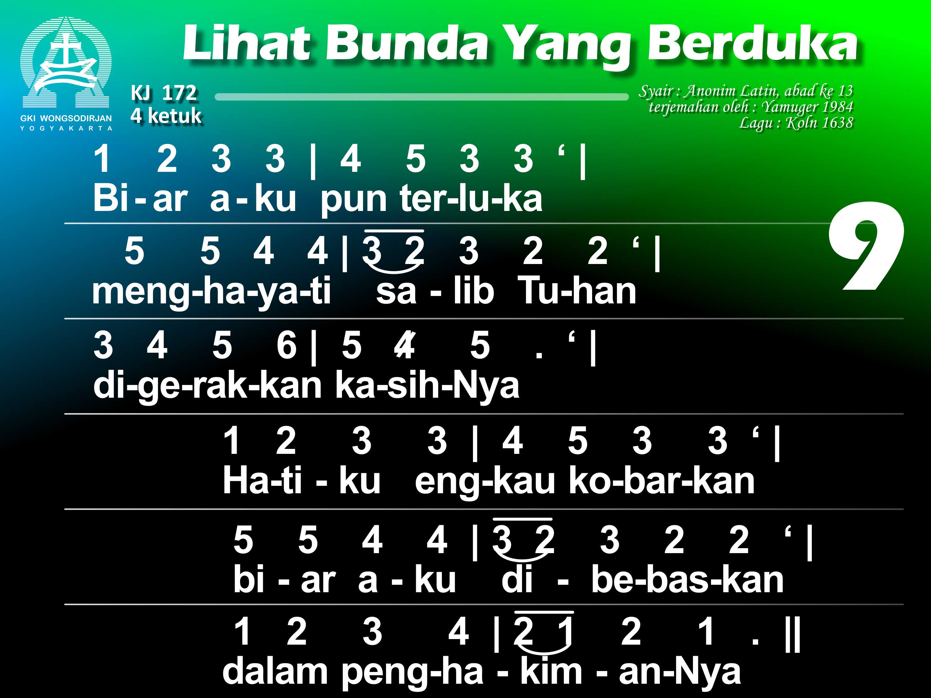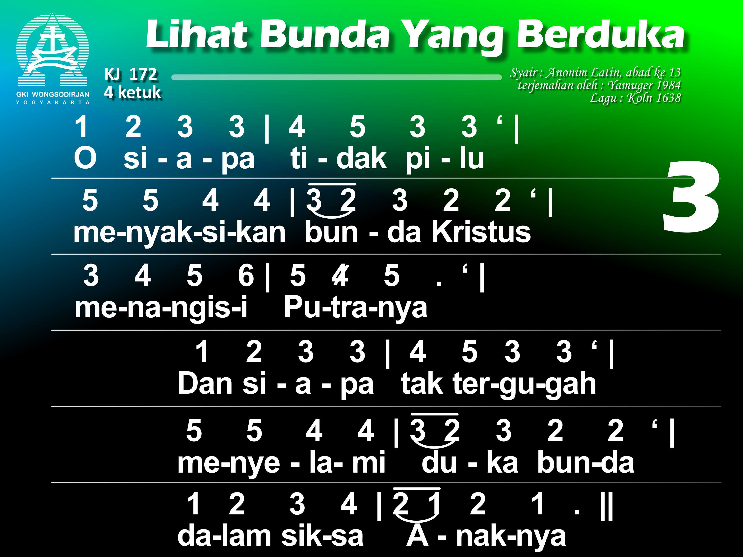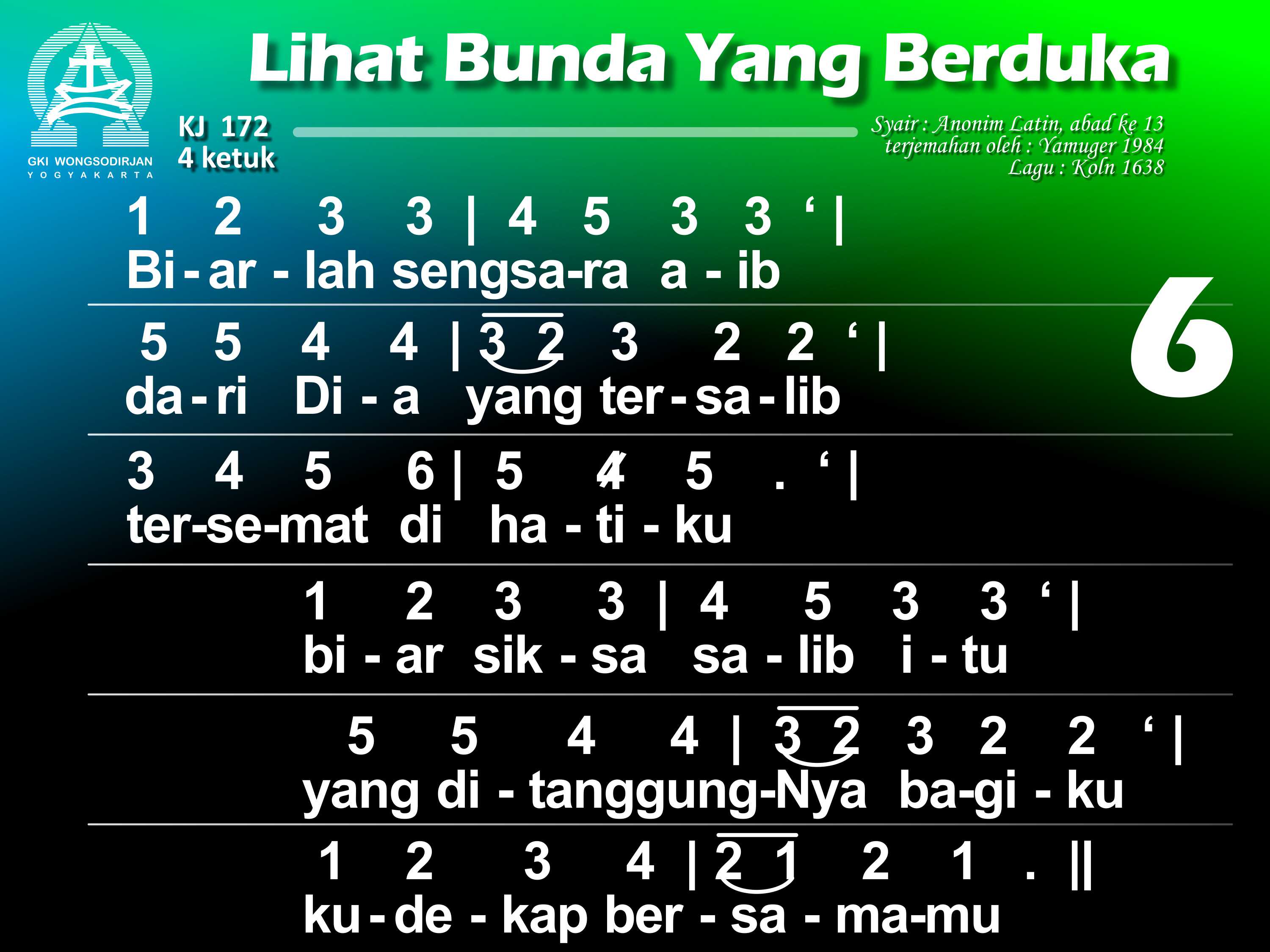 KJ. 172 LIHAT BUNDA YANG BERDUKA 1. Lihat bunda yang berduka di depan salib Sang Put'ra; air mata bergenang. O betapa jiwa ibu tersedu menanggung pilu, bagai ditembus pedang. 2. Bunda Put'ra Tunggal Allah disebut "yang berbahagia" kini sangat bersedih. Hatinya dirundung duka, kar'na Put'ra yang termulia bersengsara di salib. 3. O siapa tidak pilu menyaksikan bunda Kristus menangisi Put'ranya? Dan siapa tak tergugah menyelami duka bunda Dalam siksa Anaknya? 4. Dilihatnya Yesus, Put'ra, yang tersiksa dan terluka kar'na dosa umatNya dan bergumul sendirian menghadapi kematian menyerahkan nyawaNya. 5. Wahai bunda, sumber kasih, biar turut kuhayati dukamu yang mencekam; biar hatiku bernyala mengasihi Put'ra Allahdan padaNya berkenan. 6. Biarlah sengsara aib dari Dia yang tersalib tersemat di hatiku; yang ditanggungNya bagiku kudekap bersamamu. 7. Biar aku disampingmu pilu kar'na wafat Kristus di sepanjang hidupku; inilah keinginanku: di dekat salib Put'ramu besertamu tersedu. 8. O perawan yang terpilih, perkenankan aku ini ikut dikau bersedih; biar kematian Tuhan dan darahNya yang tercurah kukenangkan tak henti. 9. Biar aku pun terluka, menghayati salib Tuhan, digerakkan kasihNya. Hatiku engkau kobarkan; biar aku dibebaskan dalam penghakimanNya. 10. Biarlah salib Tuhanku jadi benteng naunganku dan kurasa rahmatNya. Bila nanti aku mati, biar aku mewarisi kemuliaan yang baka.