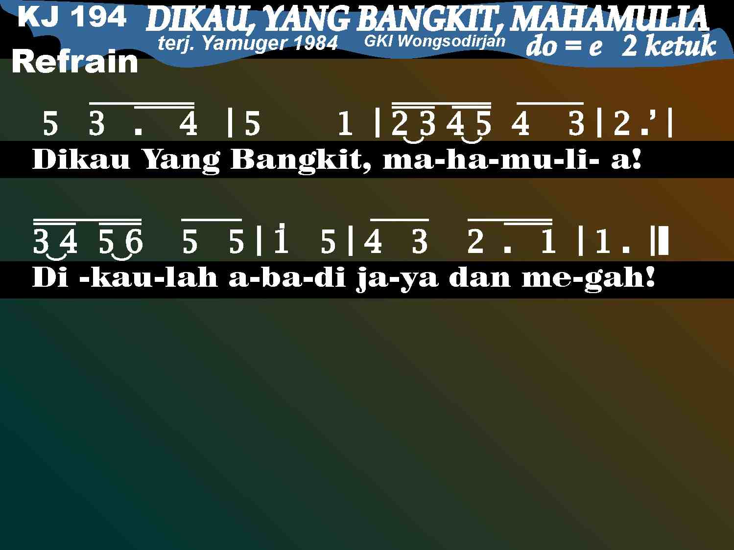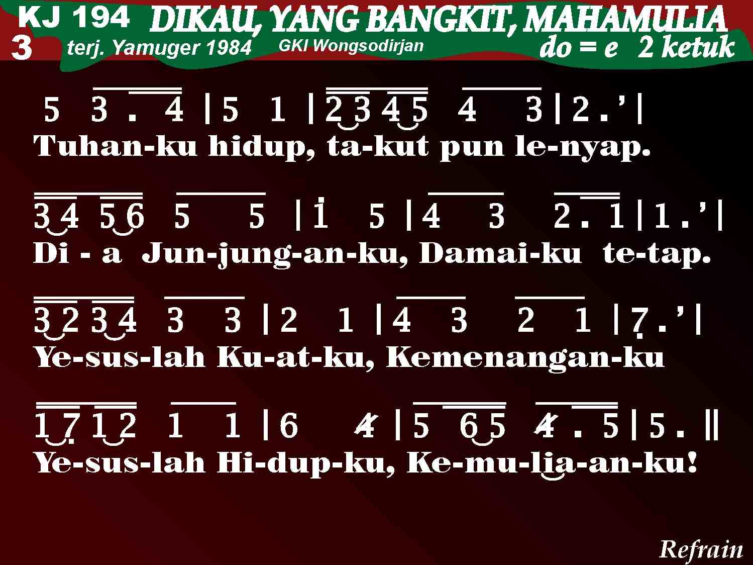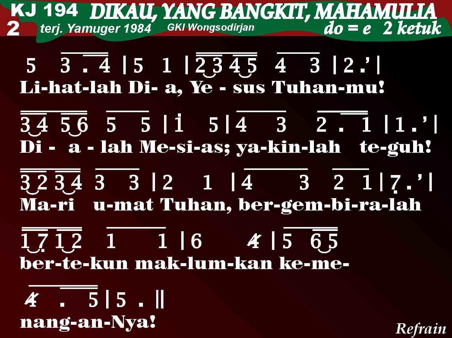 KJ. 194 DIKAU, YANG BANGKIT, MAHAMULIA 1. Dikau, Yang Bangkit, mahamulia! Dikaulah abadi jaya dan megah! Turun malak sorga putih cemerlang; kubur ia buka, tanda Kau menang. Dikau, Yang Bangkit, mahamulia! Dikaulah abadi jaya dan megah! 2. Lihatlah Dia, Yesus, Tuhanmu! Dialah Mesias; yakinlah teguh! Mari, umat Tuhan, bergembiralah! Bertekun maklumkan kemenanganNya! Dikau, Yang Bangkit, mahamulia! Dikaulah abadi jaya dan megah! 3. Tuhanku hidup takut pun lenyap. Dia Junjunganku, Damaiku tetap. Yesuslah Kuatku, Kemenanganku, Yesus Hidupku, Kemuliaanku! Dikau, Yang Bangkit, mahamulia! Dikaulah abadi jaya dan megah!