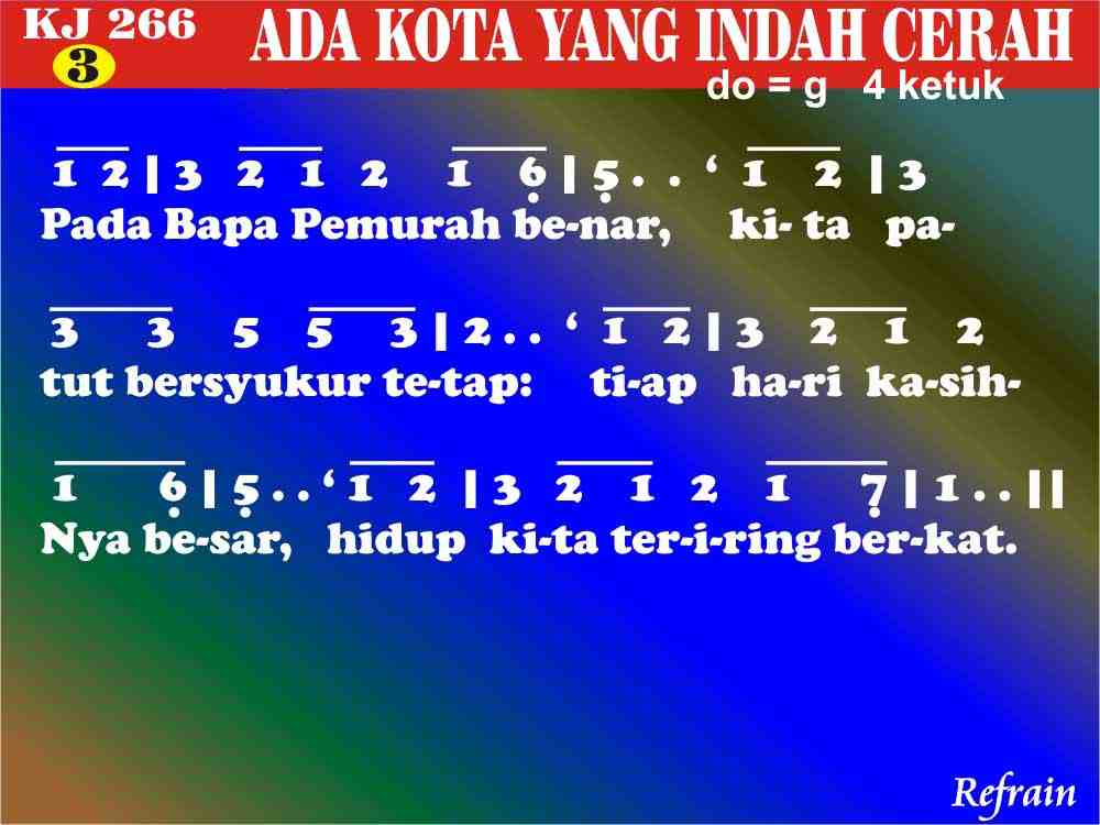 KJ. 266 ADA KOTA YANG INDAH CERAH 1. Ada kota yang indah cerah, nampaklah bagi mata iman: rumah Bapa di sorga baka bagi orang yang sudah menang. Indahnya saatnya kita jumpa di kota permai. Indahnya saatnya kita jumpa dikota permai. 2. Nun di sana bersama teman kita nyanyi pujian merdu, selamanya sentosa tent'ram, rasa duka terhapus penuh. Indahnya saatnya kita jumpa di kota permai. Indahnya saatnya kita jumpa dikota permai. 3. Pada Bapa, Pemurah kita patut bersyukur tetap: tiap hari kasihNya besar, hidup kta teriring berkat. Indahnya saatnya kita jumpa di kota permai. Indahnya saatnya kita jumpa dikota permai.