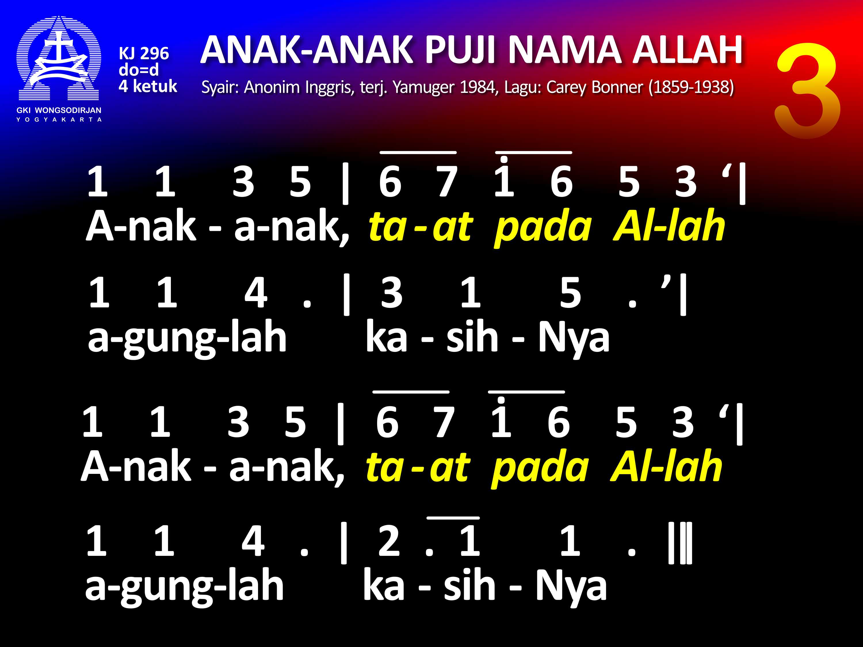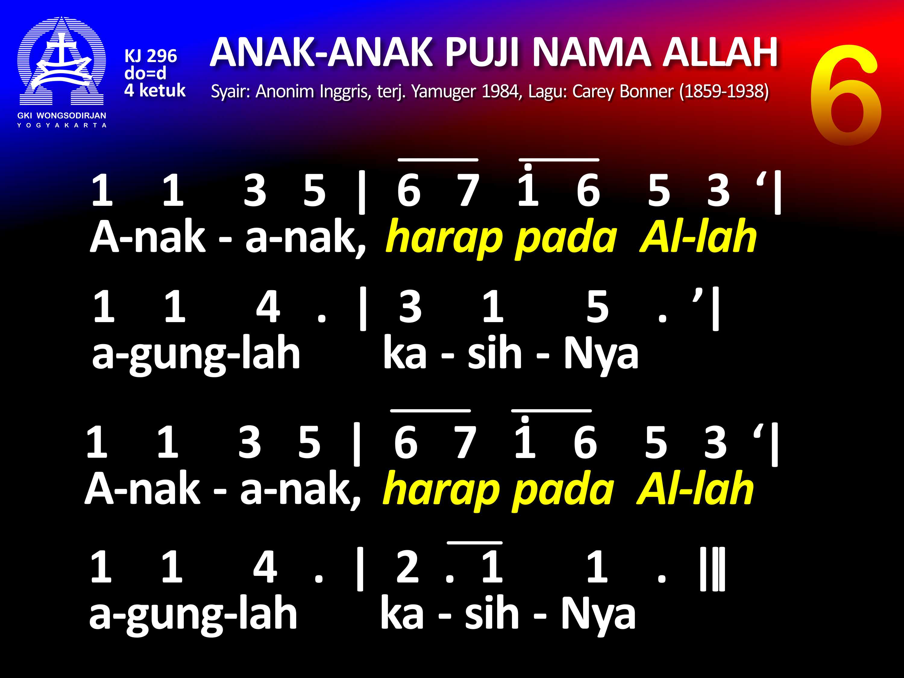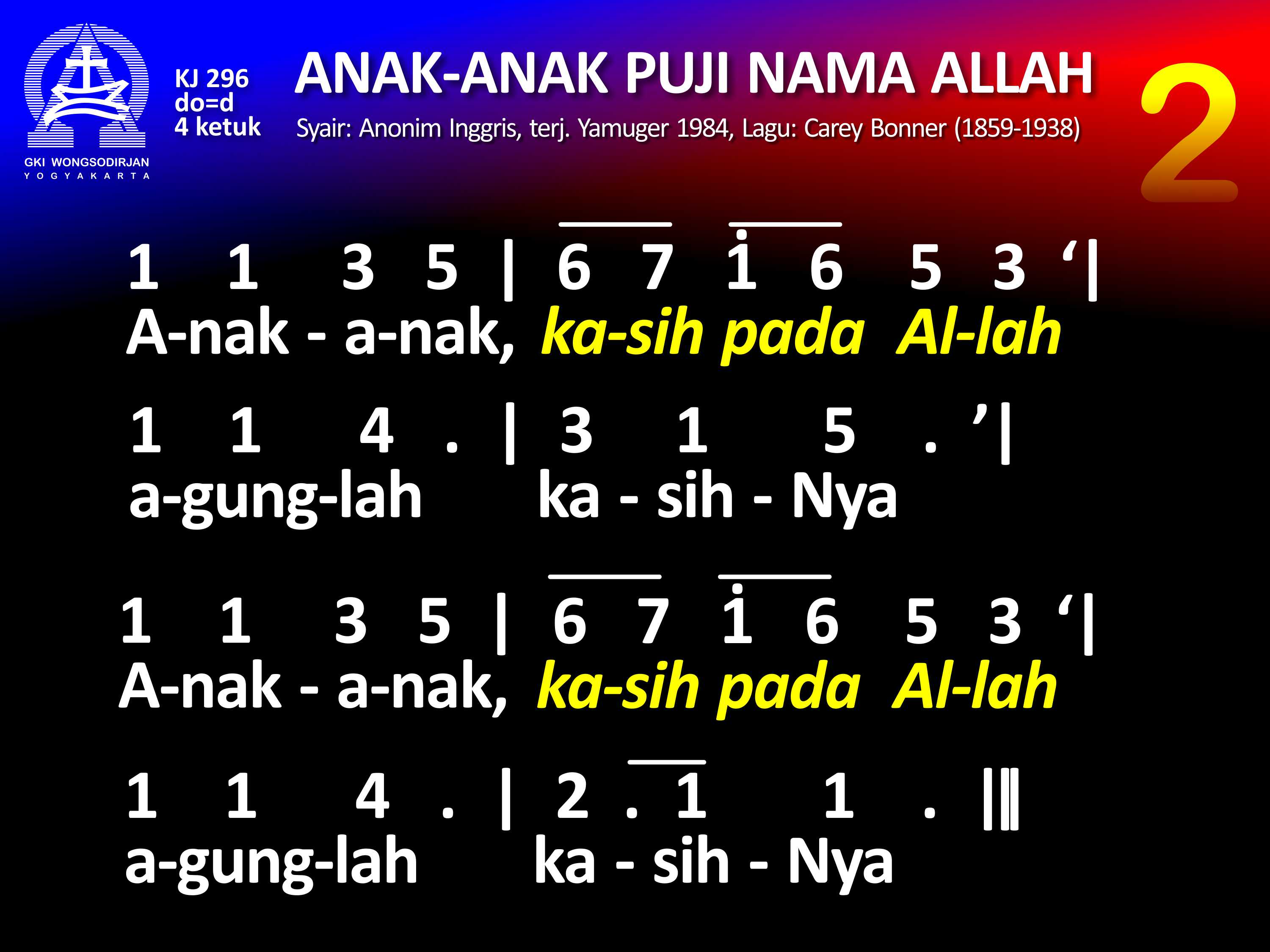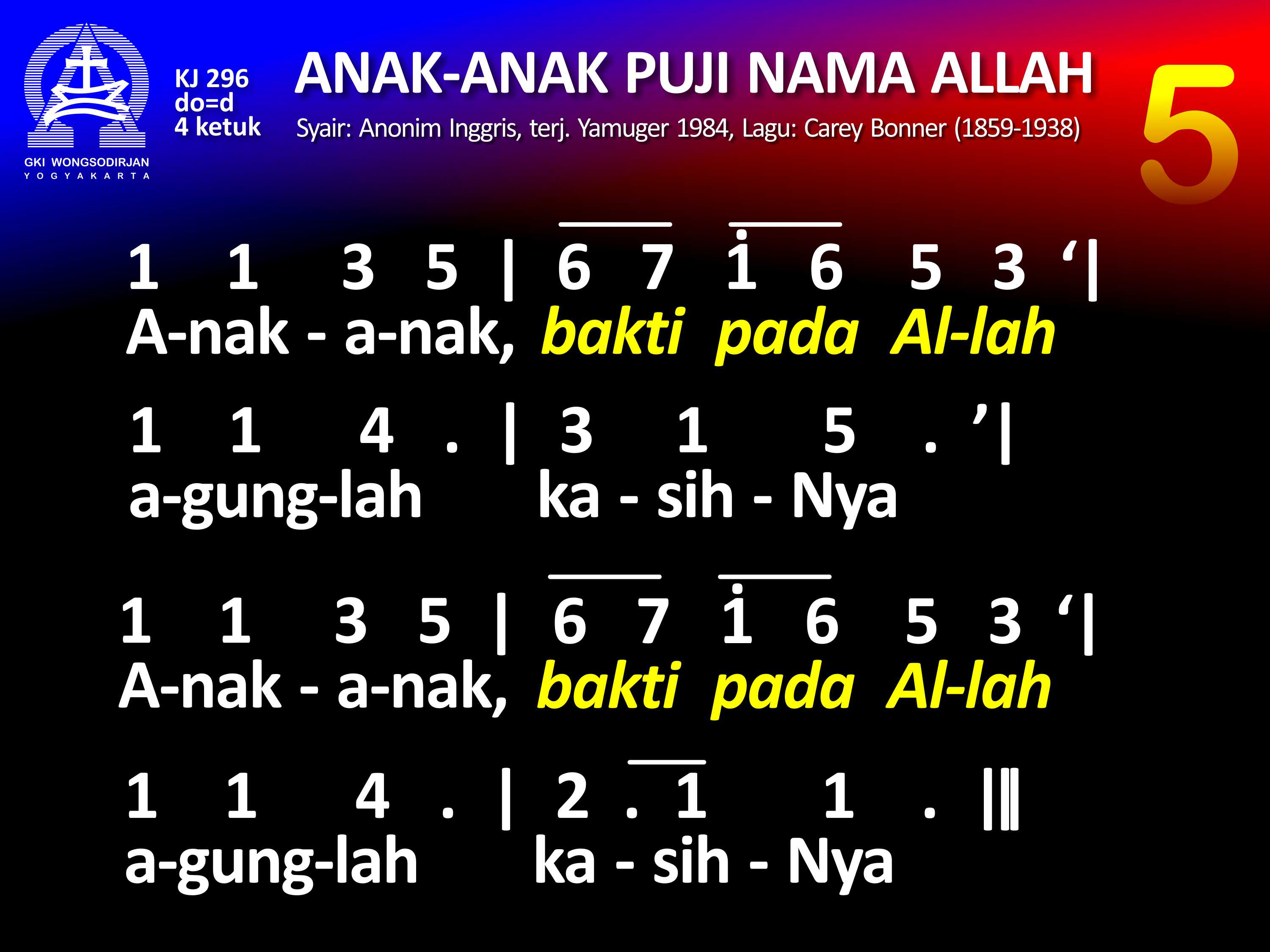 KJ. 296 ANAK-ANAK, PUJI NAMA ALLAH Anak-anak, puji nama Allah, agunglah kasihNya! Anak-anak, puji nama Allah, agunglah kasihNya!