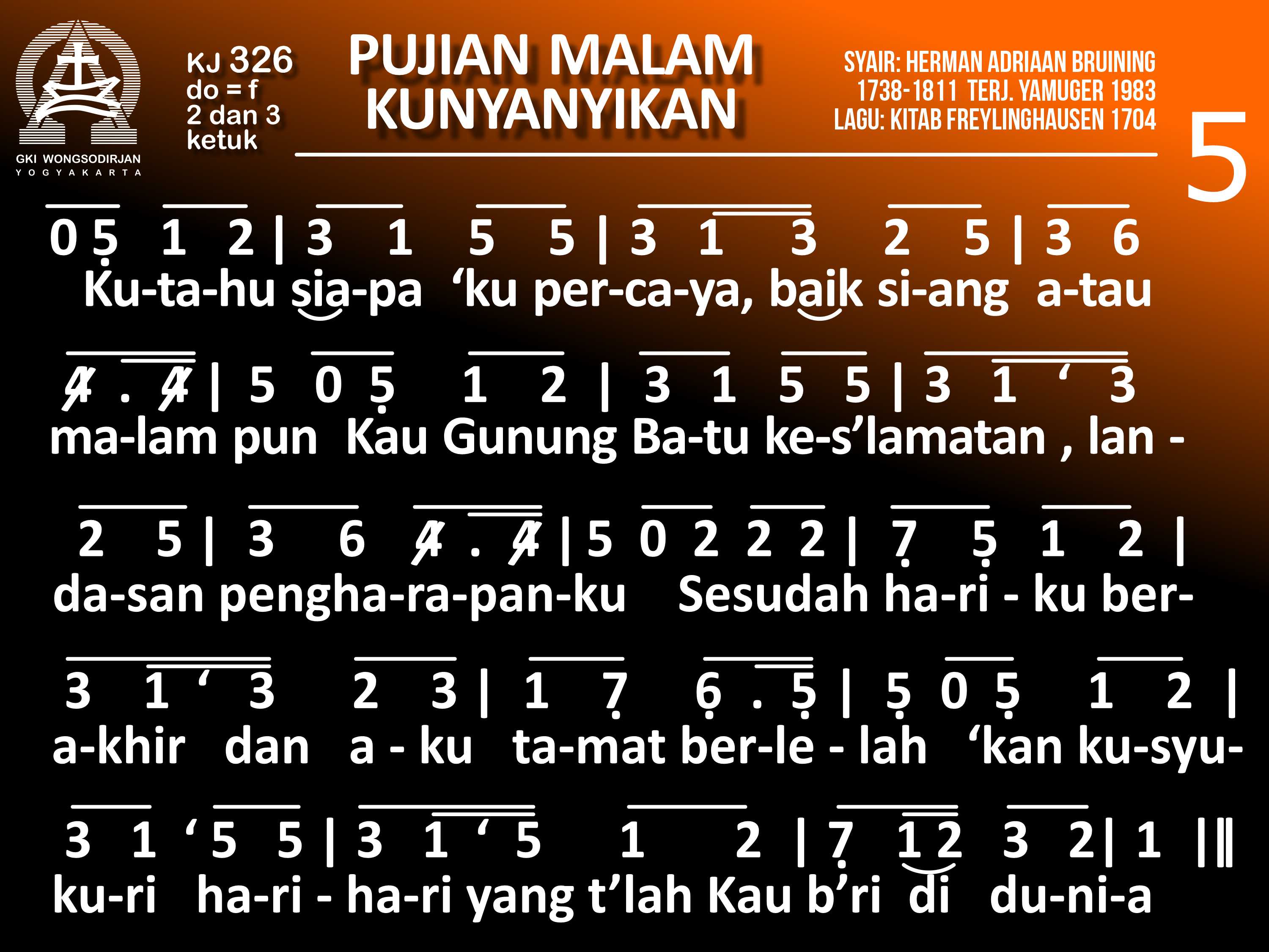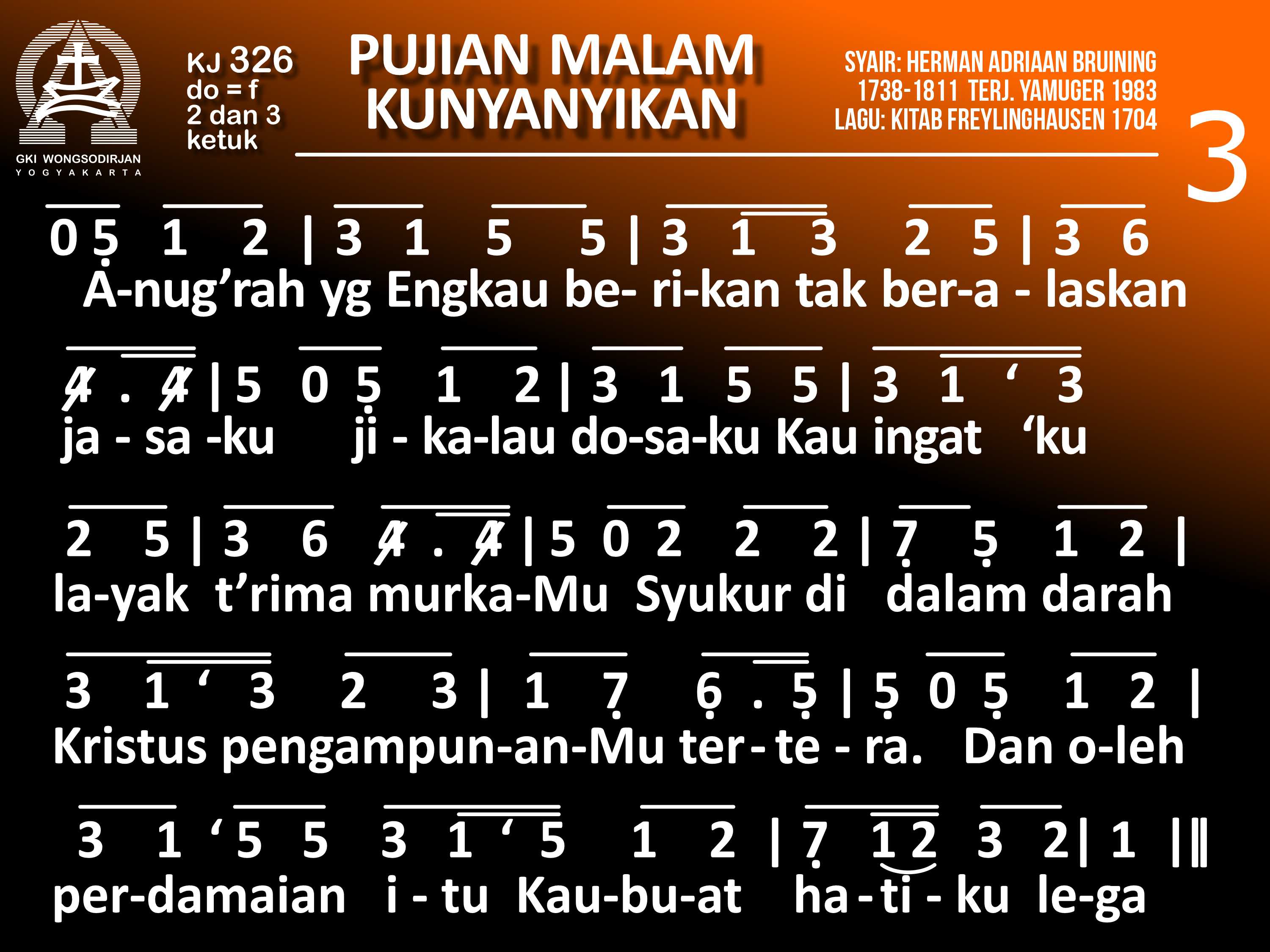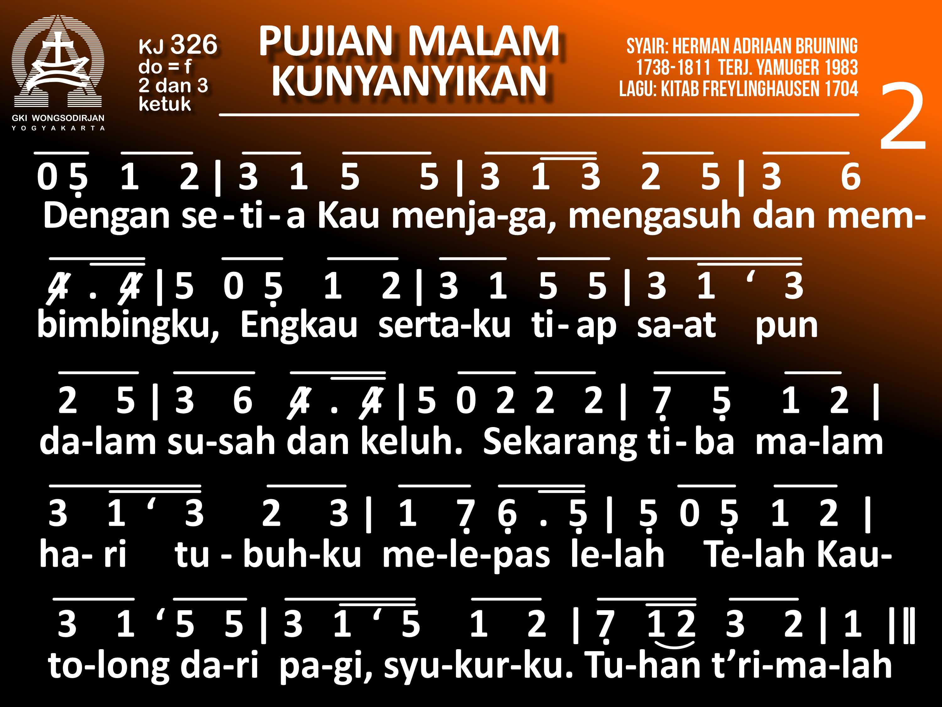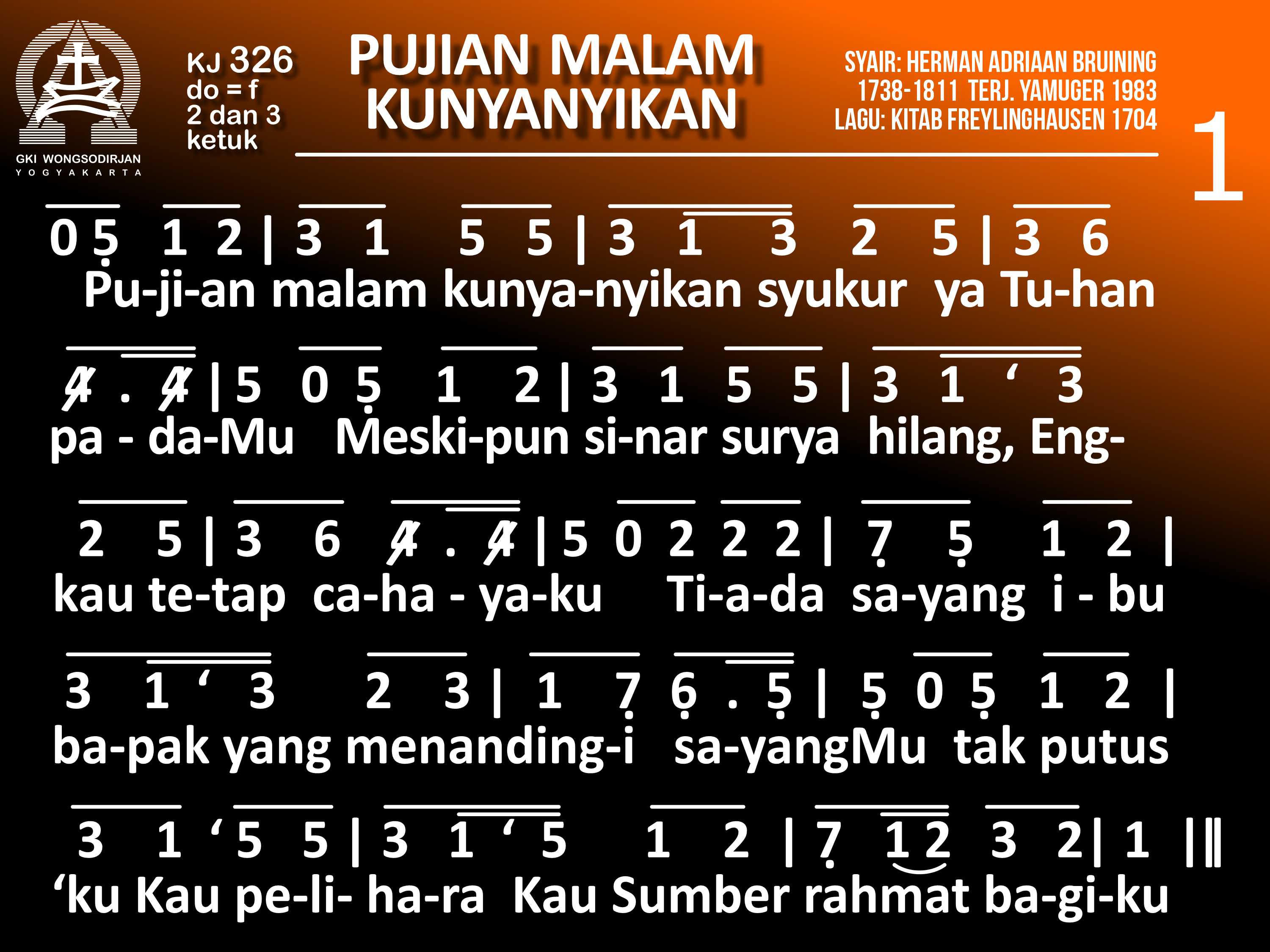 KJ. 326 PUJIAN MALAM KUNYANYIKAN 1. Pujian malam kunyanyikan; syukur, ya Tuhan, padaMu. Meskipun sinar surya hilang, Engkau tetap cahayaku. Tiada sayang ibu-bapak yang menandingi sayangMu: Tak putus 'ku Kau pelihara, Kau Sumber rahmat bagiku. 2. Dengan setia Kau menjaga, mengasuh dan membimbingku. Engkau sertaku tiap saat, pun dalam susah dan keluh. Sekarang tiba malam hari; tubuhku melepas lelah. Telah Kautolong dari pagi: syukurku, Tuhan t'rimalah! 3. Anug'rah yang Engkau berikan tak beralaskan jasaku: jikalau dosaku Kauingat 'ku layak t'rima murkaMu. Syukur, di dalam darah Kristus pengampunanMu Tertera dan oleh pendamaian itu Kaunuat hatiku lega. 4. Ya Tuhan, malam ini uga padaMu aku berserah. Semoga 'ku bernyanyi pula ketika fajar merekah. Dan bila Kau memanggil aku selagi aku terlelap, Kiranya di depan takhtaMu sejahteraMu kukecap. 5. Kutahu siapa 'ku percaya, baik siang atau malam pun: Kau Gunung Batu kes'lamatan, landasan pengharapanku! Sesudah hariku berakhir dan aku tamat berlelah, 'kan Kusyukuri hari-hari yang t'lah kaub'ri di dunia.