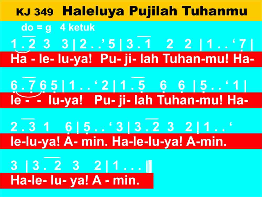 KJ. 349 HALELUYA, PUJILAH TUHANMU Haleluya! Pujilah Tuhanmu! Haleluya! Pujilah Tuhanmu! Haleluya! Amin. Haleluya! Amin. Haleluya! Amin.