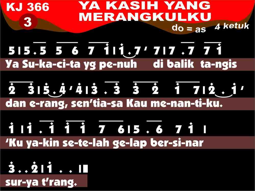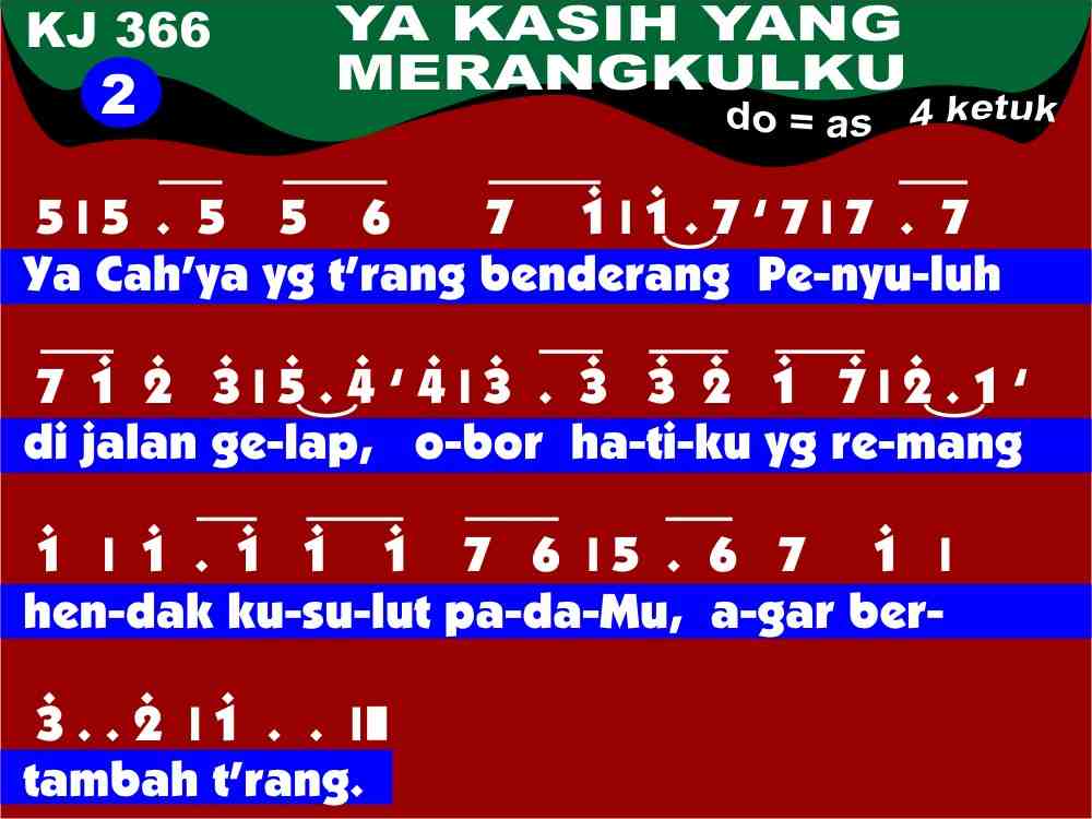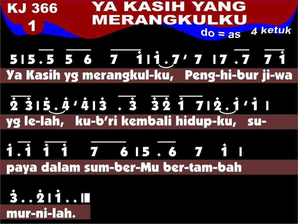 KJ. 366 YA KASIH YANG MERANGKULKU 1. Ya Kasih yang merangkulku, Penghibur jiwa yang lelah, kub'ri kembali hidupku, supaya dalam sumberMu bertambah murnilah. 2. Ya Cahya yang t'rang benderang, Penyuluh di jalan yang gelap, obor hatiku yang remang hendak kusulut padaMu, agar bertambah t'rang. 3. Ya Sukacita yang penuh di balik tangis dan erang, sentiasa Kau menantiku. 'Ku yakin, setelah gelap bersinar surya t'rang.