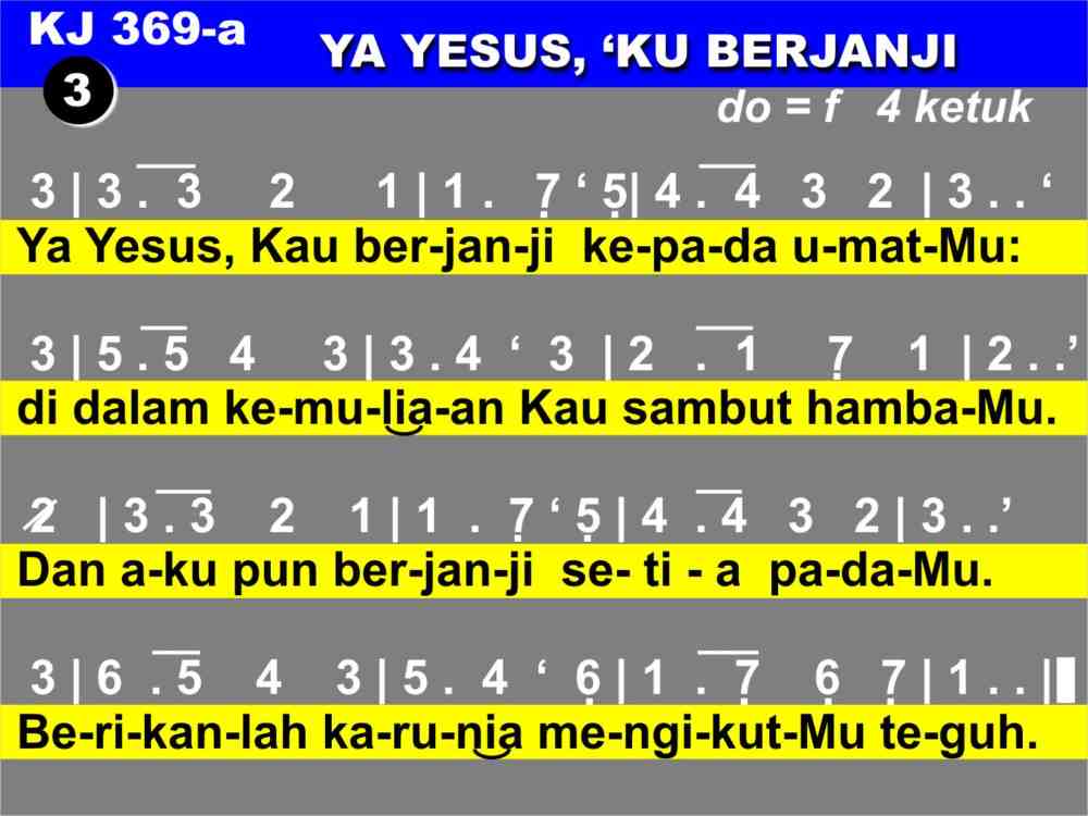 KJ. 369a YA YESUS, 'KU BERJANJI 1. Ya Yesus, 'ku berjanji setia padaMu; kupinta Kau selalu dekat, ya Tuhanku. Di kancah pergumulan jalanku tak sesat, kar'na Engkau Temanku, Pemimpin terdekat. 2. Dekaplah aku, Tuhan, diribut dunia penuh kilauan hampa dan suara godanya. Di dalam dan di luar si jahat mendesak. Perisai lawan dosa, ya Tuhan, Kau tetap. 3. Ya Yesus, Kau berjanji kepada umatMu: di dalam kemuliaan Kausambut hambaMu. Dan aku pun berjanji setia padaMu. Berikanlah karunia mengikutMu teguh.