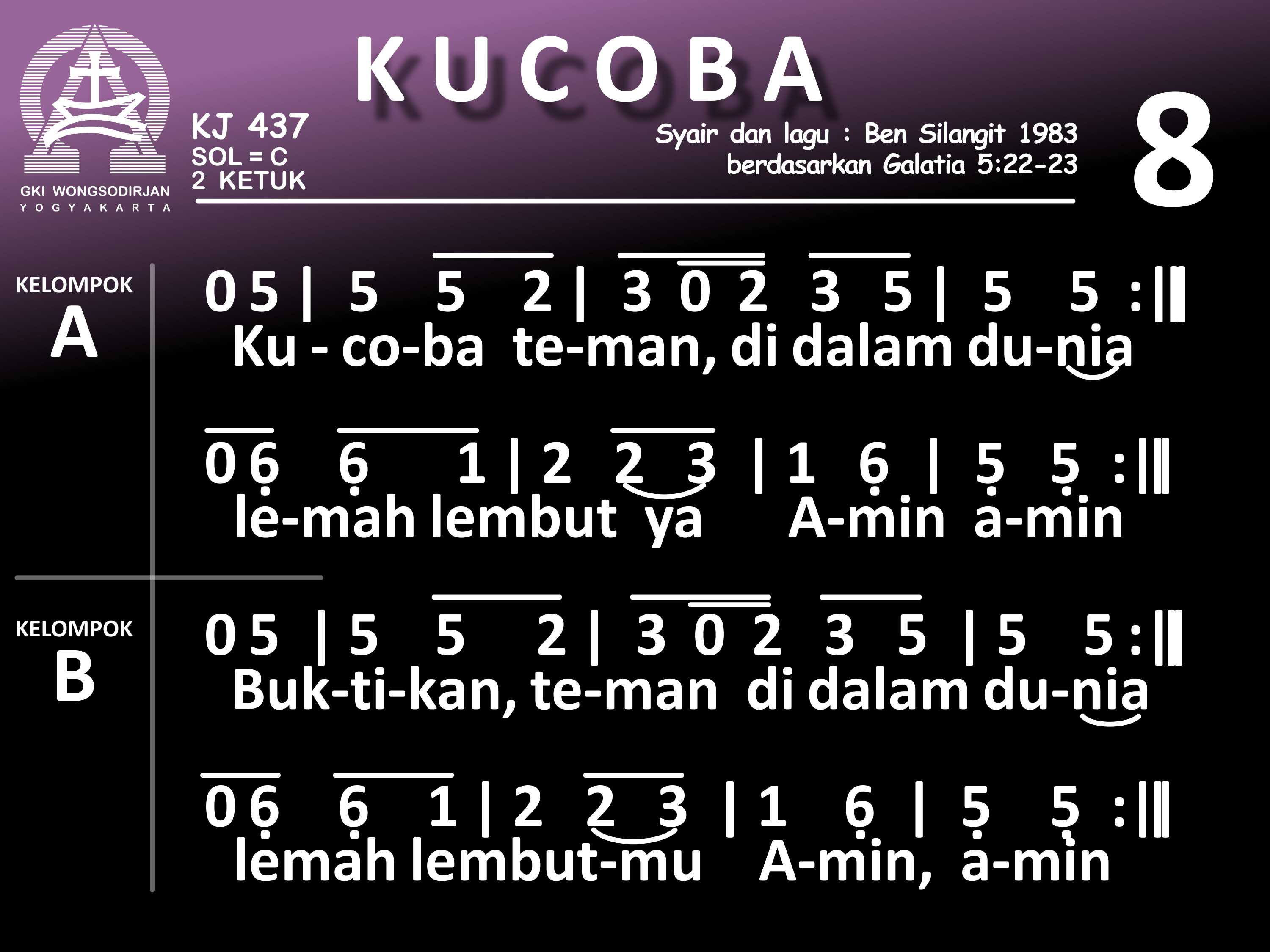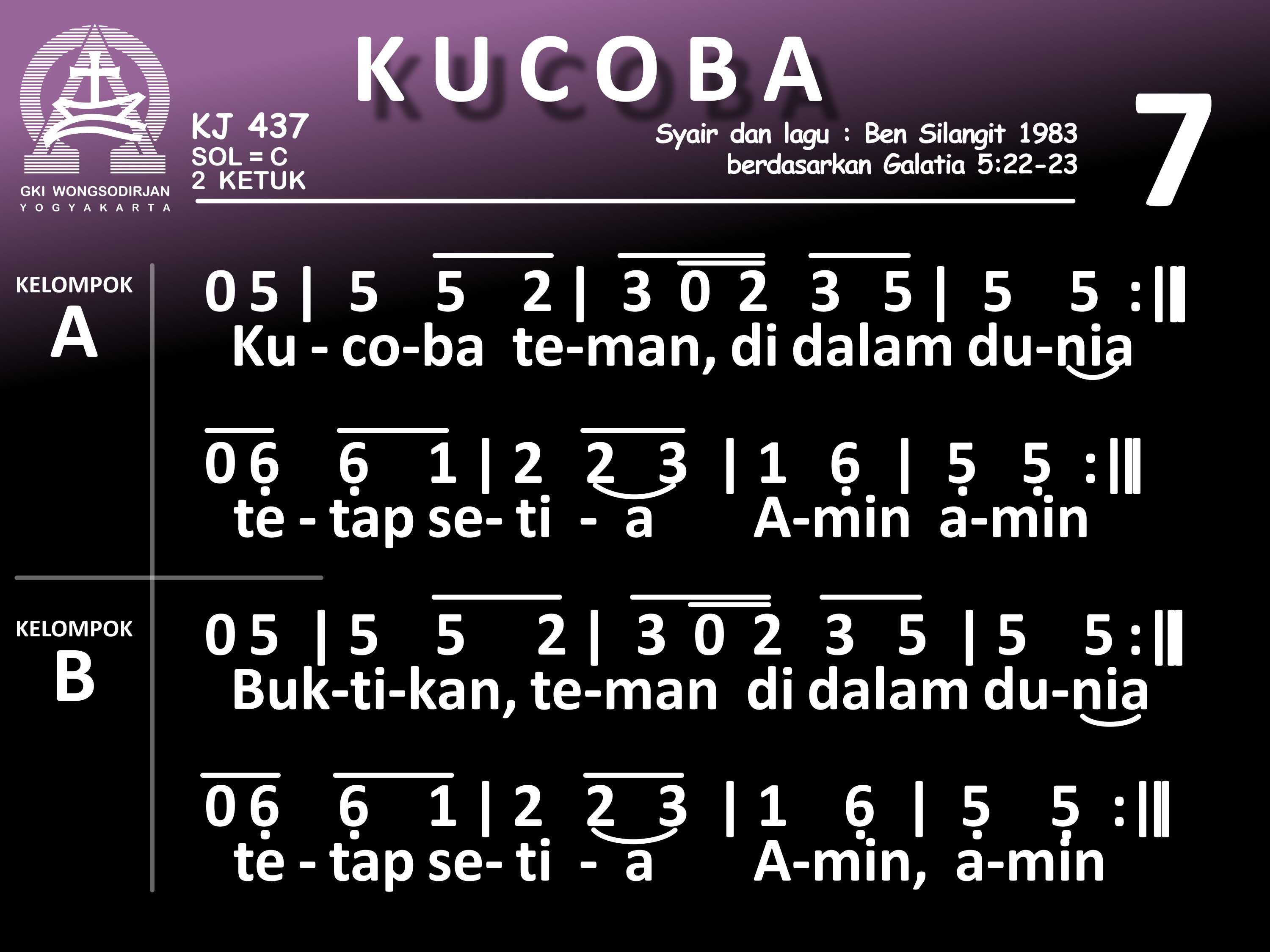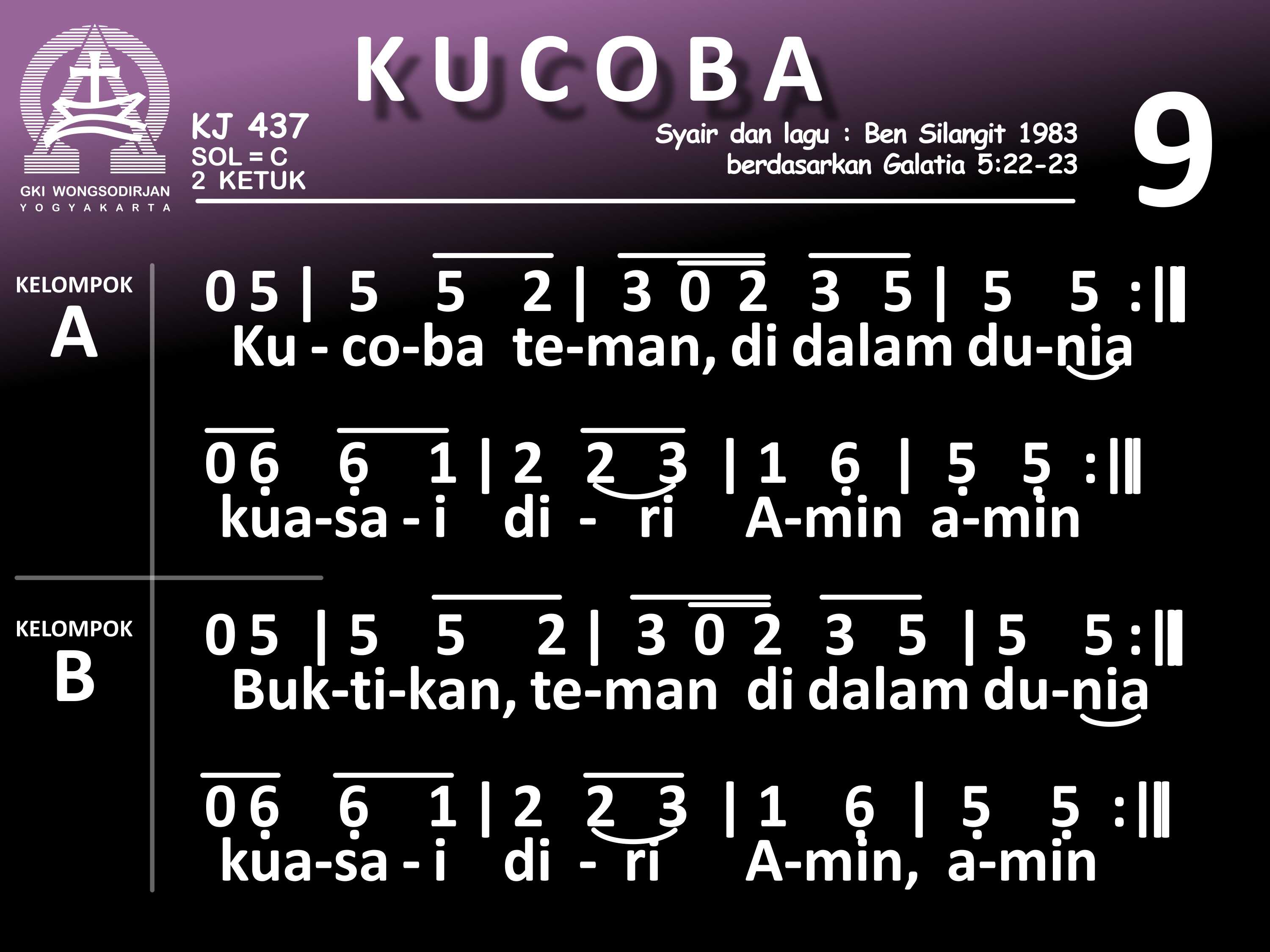 KJ. 437 KUCOBA 1. Kucoba, teman, di dalam dunia berkasih sayang! Amin, amin. Buktikan, teman, di dalam dunia kasih sayangmu! Amin, amin. 2. Kucoba, teman, di dalam dunia bersukacita. Amin, amin. Buktikan, teman, di dalam dunia dunia sukacitamu! Amin, amin. 3. Kucoba, teman, di dalam damai sejaht'ra. Amin, amin. Buktikan, teman, di dalam dunia damai sejaht'ra. Amin, amin. 4. Kucoba, teman, di dalam dunia tetap bersabar. Amin, amin. Buktikan, teman, di dalam dunia kessabaranmu! Amin, amin. 5. Kucoba, teman, di dalam dunia bermurah hati. Amin, amin. Buktikan, teman, di dalam dunia murah hatimu! Amin, amin. 6. Kucoba, teman, di dalam dunia berbuat baik. Amin, amin. Buktikan, teman, di dalam dunia kebaikanmu! Amin, amin. 7. Kucoba, teman, di dalam dunia tetap setia. Amin, amin. Buktikan , teman, di dalam dunia tetap setia Amin, amin. 8. Kucoba, teman, di dalam dunia lemah lembut. Amin, amin. Buktikan, teman, di dalam dunia lemah lembutmu! Amin, amin. 9. Kucoba, teman, di dalam dunia kuasai diri. Amin, amin. Buktikan, teman, di dalam dunia kuasai diri! Amin, amin.