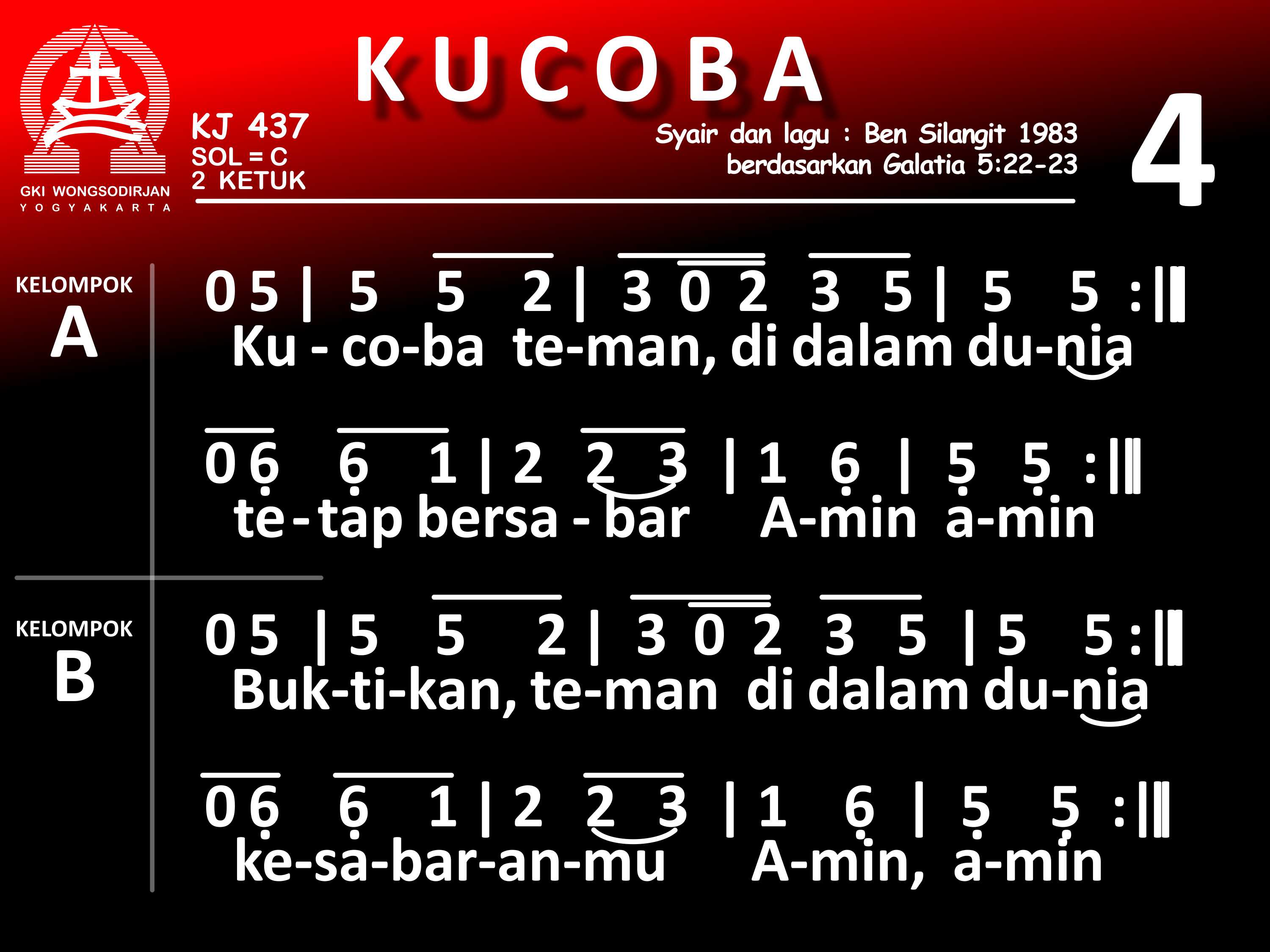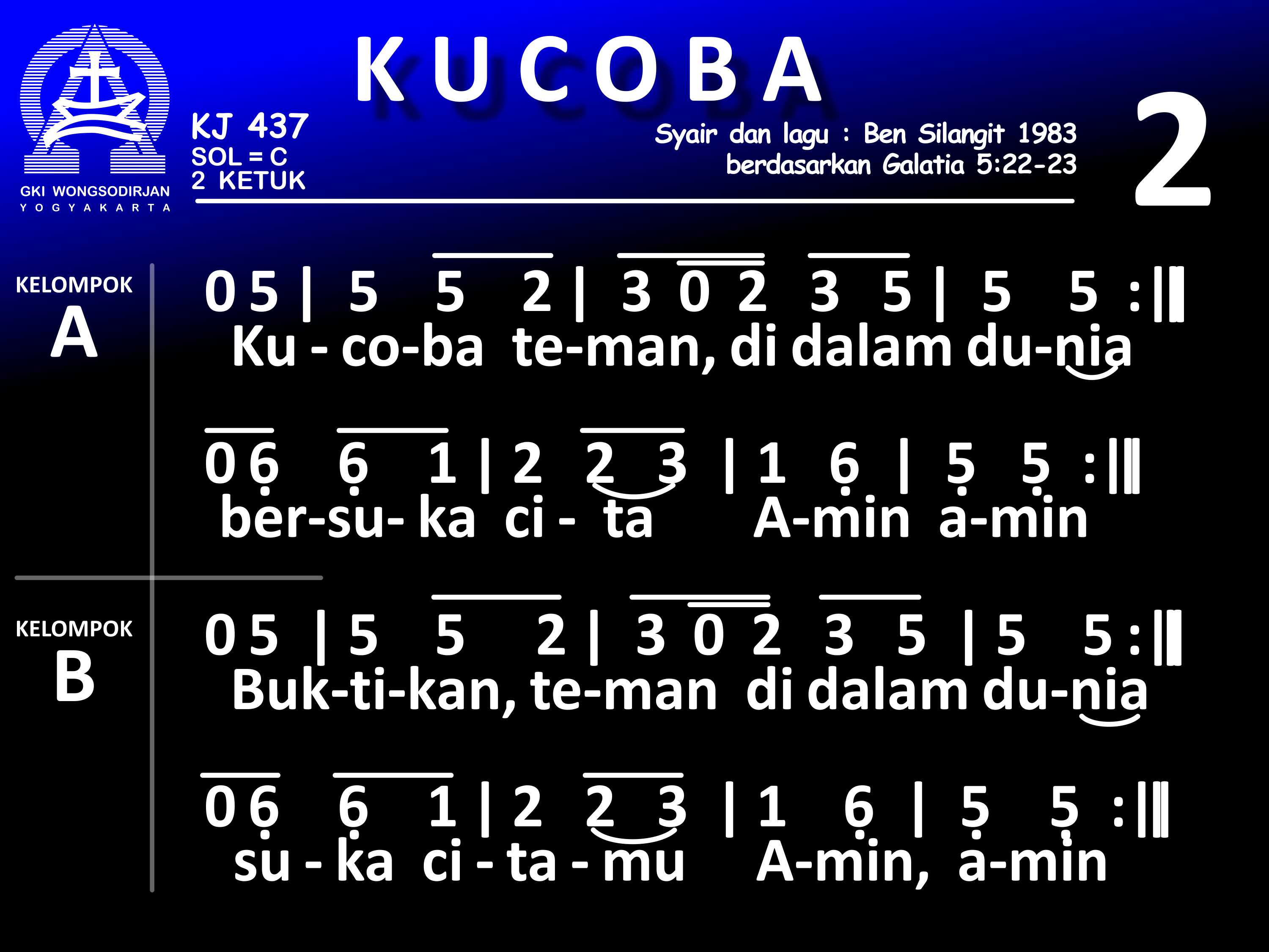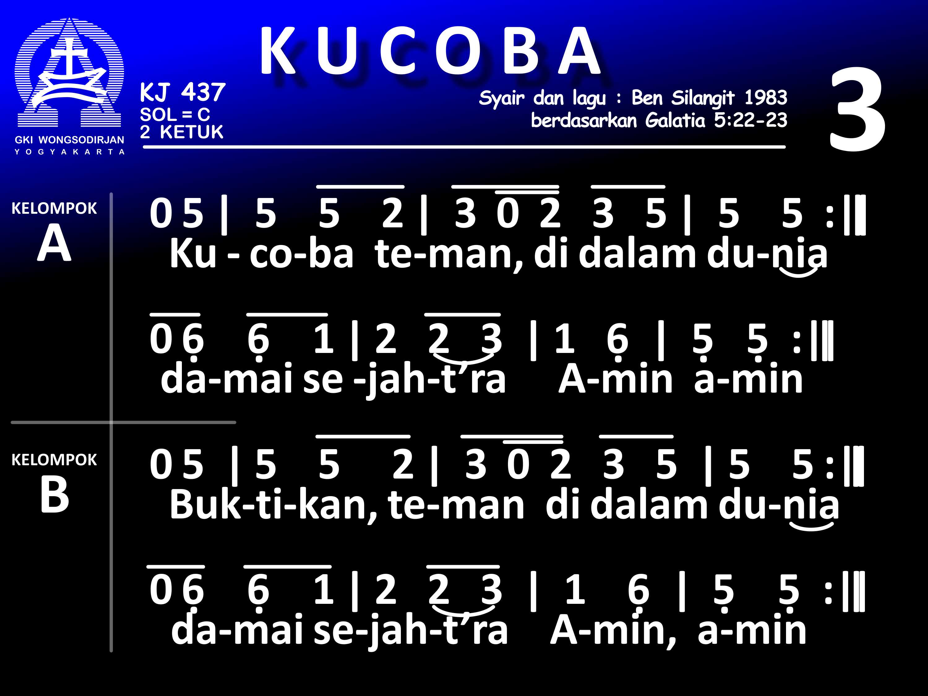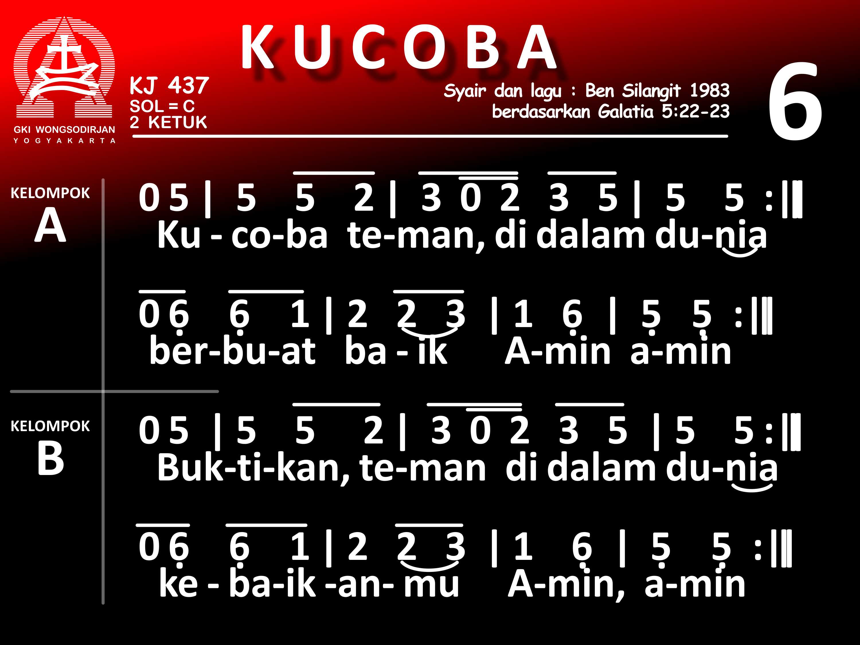 KJ. 437 KUCOBA 1. Kucoba, teman, di dalam dunia berkasih sayang! Amin, amin. Buktikan, teman, di dalam dunia kasih sayangmu! Amin, amin. 2. Kucoba, teman, di dalam dunia bersukacita. Amin, amin. Buktikan, teman, di dalam dunia dunia sukacitamu! Amin, amin. 3. Kucoba, teman, di dalam damai sejaht'ra. Amin, amin. Buktikan, teman, di dalam dunia damai sejaht'ra. Amin, amin. 4. Kucoba, teman, di dalam dunia tetap bersabar. Amin, amin. Buktikan, teman, di dalam dunia kessabaranmu! Amin, amin. 5. Kucoba, teman, di dalam dunia bermurah hati. Amin, amin. Buktikan, teman, di dalam dunia murah hatimu! Amin, amin. 6. Kucoba, teman, di dalam dunia berbuat baik. Amin, amin. Buktikan, teman, di dalam dunia kebaikanmu! Amin, amin. 7. Kucoba, teman, di dalam dunia tetap setia. Amin, amin. Buktikan , teman, di dalam dunia tetap setia Amin, amin. 8. Kucoba, teman, di dalam dunia lemah lembut. Amin, amin. Buktikan, teman, di dalam dunia lemah lembutmu! Amin, amin. 9. Kucoba, teman, di dalam dunia kuasai diri. Amin, amin. Buktikan, teman, di dalam dunia kuasai diri! Amin, amin.