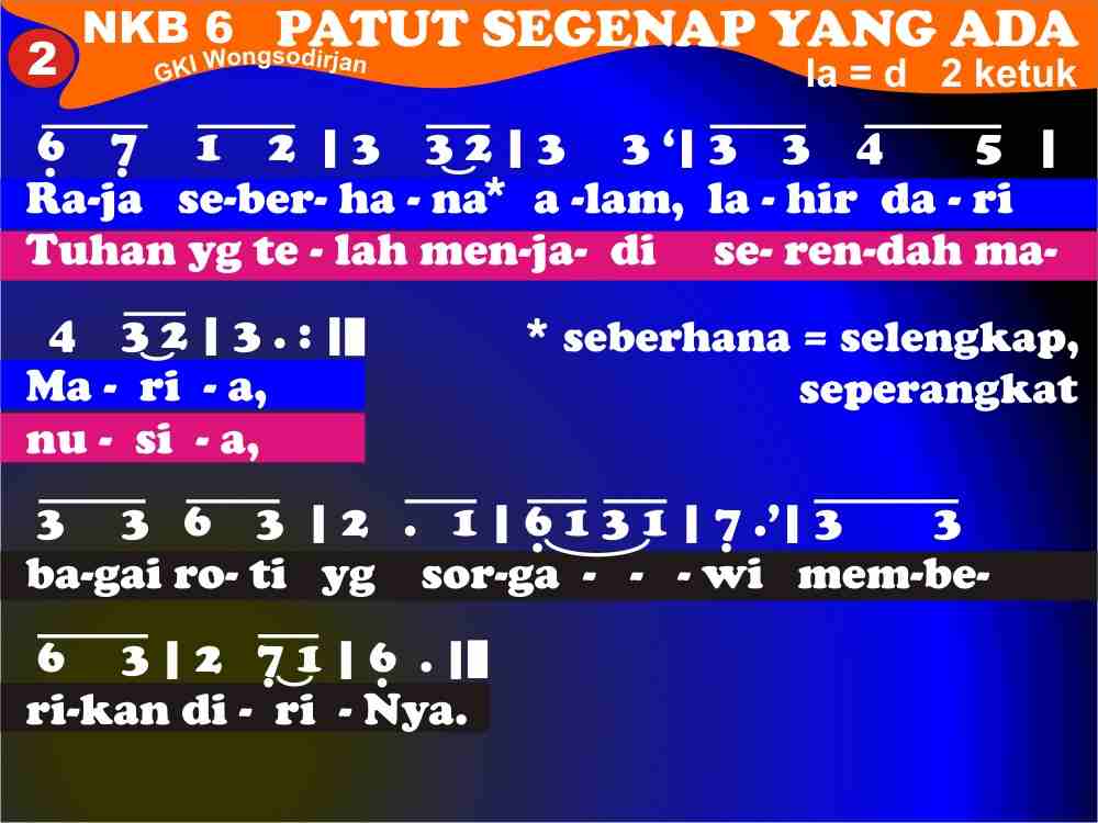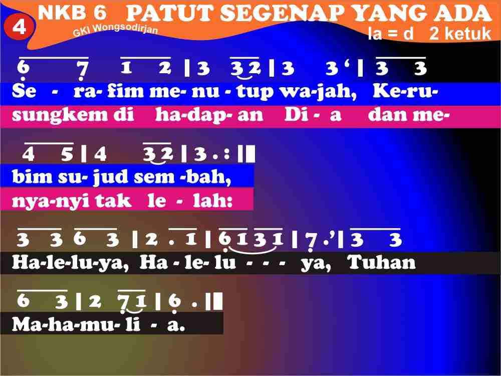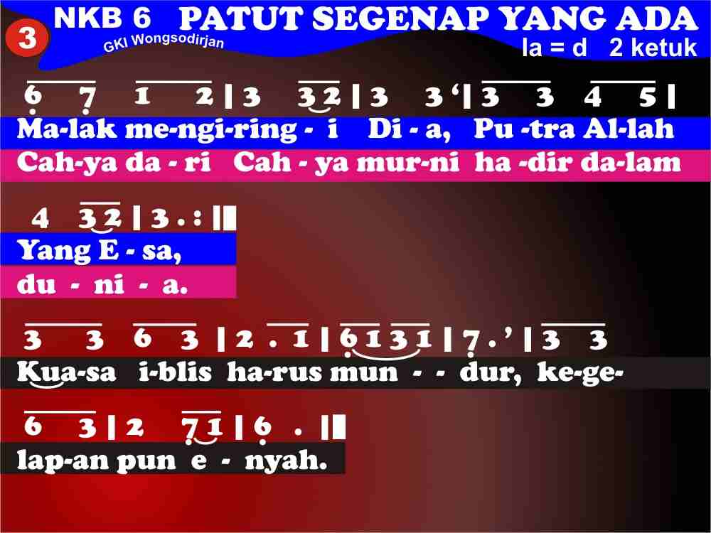 NKB.6 PATUT SEGENAP YANG ADA Syair: Let All Mortal Flesh Keep Silence; Gerard Moultrie Terjemahan: H.A. Pandopo Lagu: Tradisional Perancis Patut segenap yang ada diam dan sujud sem_bah, mengosongkan pikir_annya dari barang duni_a, kar'na Tuhan sungguh ha___dir, patut dipermuli_a. Maharaja alam raya lahir dari Mari_a, Tuhan yang telah men_jadi serendah manusi_a, bagai roti yang sorga___wi memberikan diriNya. Malak mengiringi Dia, Putra Allah Yang E_sa, Cahya dari Cahya murni hadir dalam duni_a. Kuasa Iblis harus mun___dur kegelapan pun enyah. Serafim menutup wajah, Kerubim sujud sem_bah sungkem di hadapan Dia dan menyanyi tak le_lah: Haleluya, Halelu___ya, Tuhan Mahamulia!