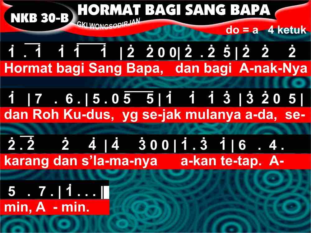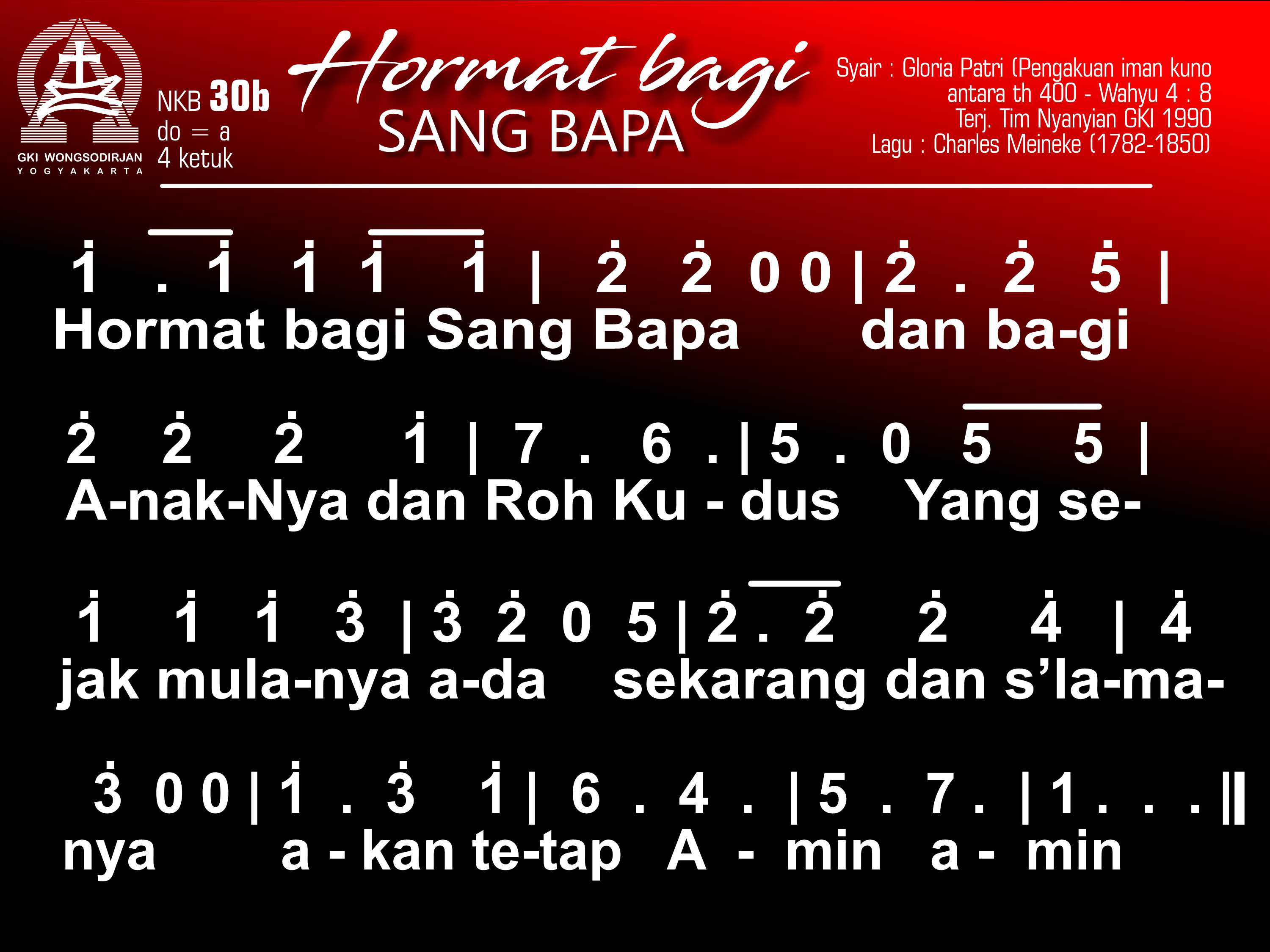 NKB.30b HORMAT BAGI SANG BAPA Syair: Gloria Patri Terjemahan: Tim Nyanyian GKI Lagu: Henry W. Greatorex (versi a.); Charles Meineke (versi b.) Hormat bagi Sang Bapa, dan bagi AnakNya dan Roh Kudus, Yang sejak mulanya ada, sekarang dan s'lamanya, akan tetap. A_min, a_min.