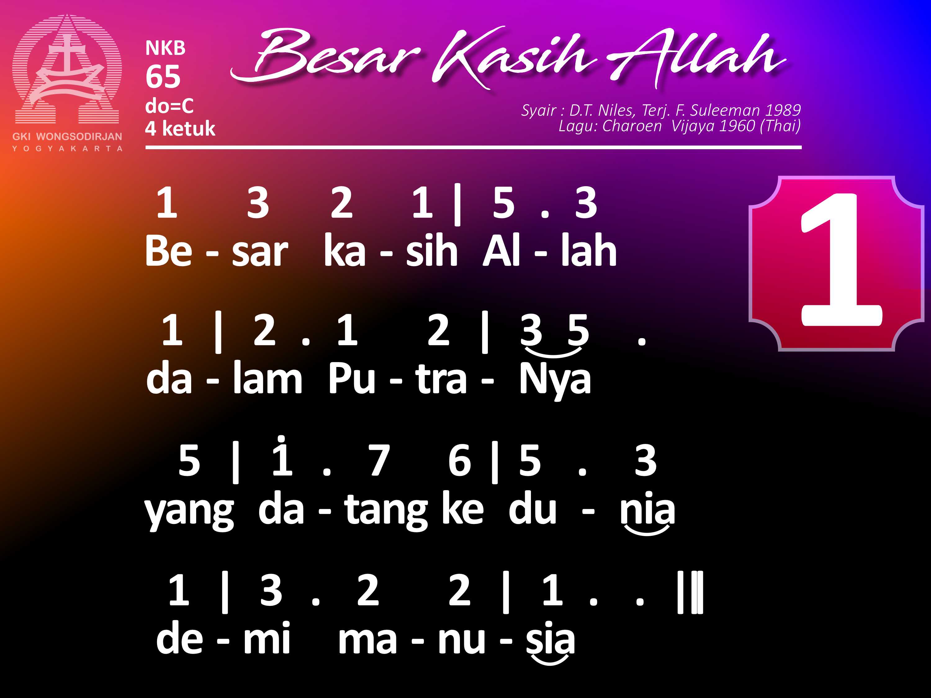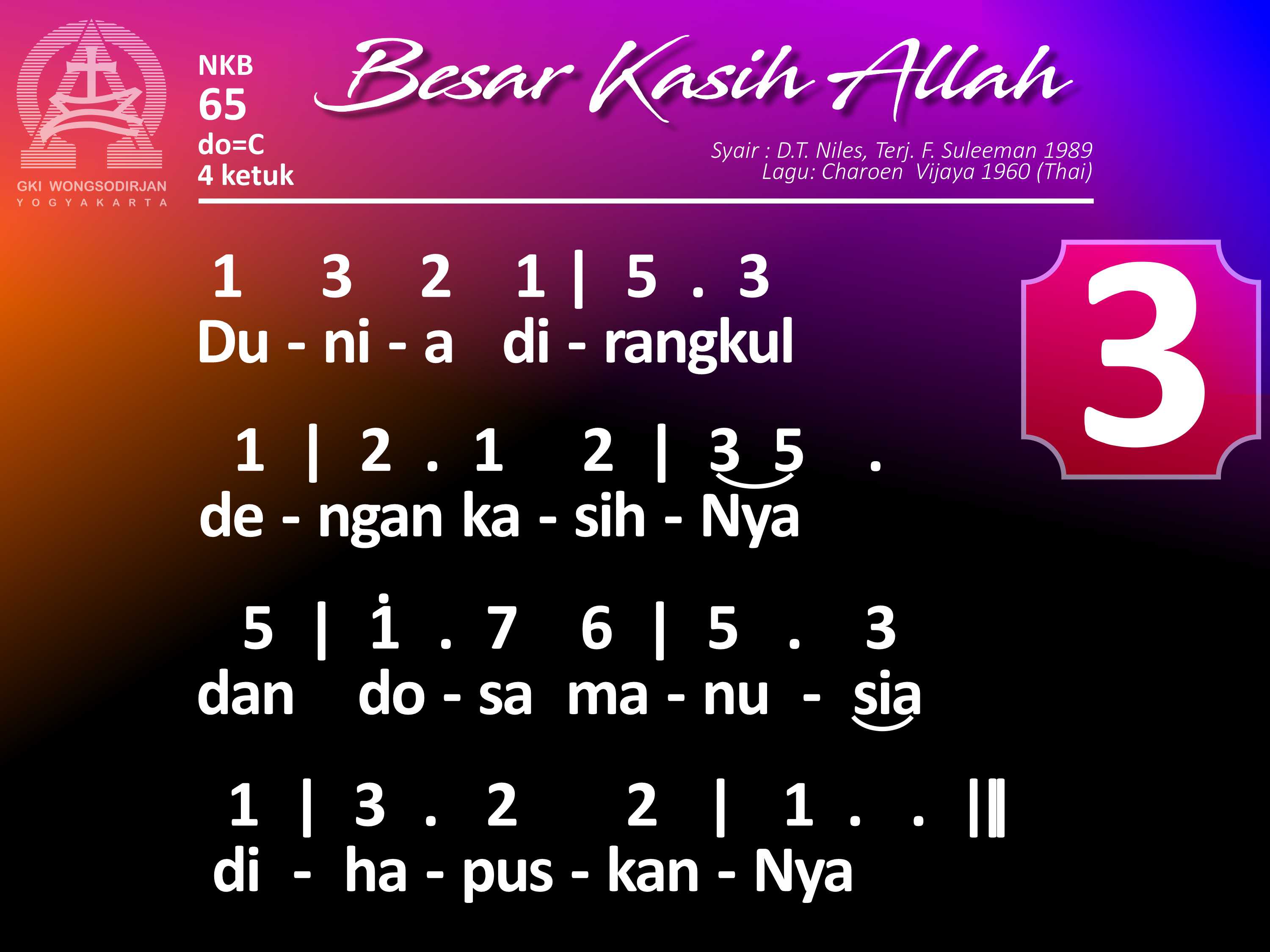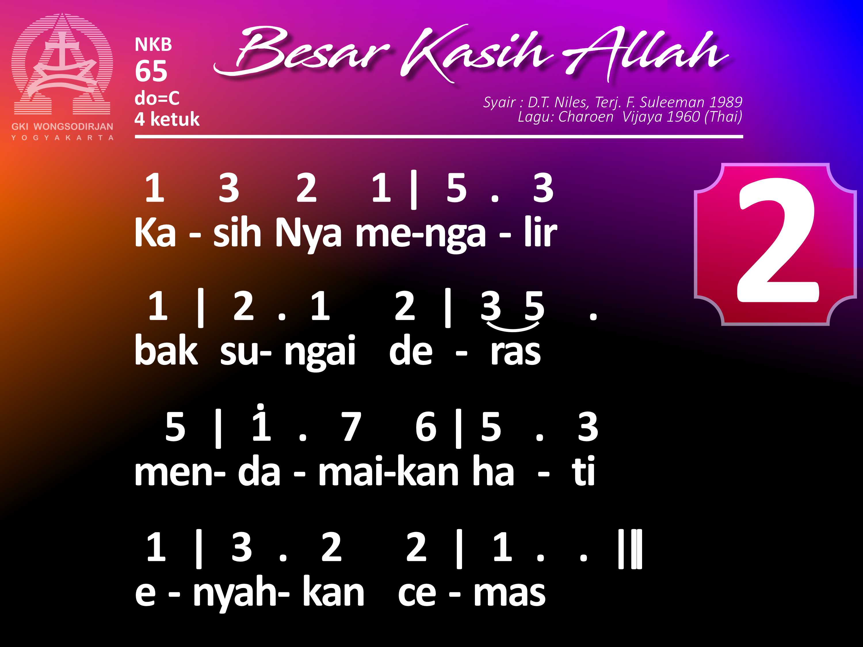 NKB.65 BESAR KASIH ALLAH Syair: The Love of God in Jesus; D. T. Niles Terjemahan: F. Suleeman Lagu: Charoen Vijaya Hak Cipta: Christian Conference of Asia Besar kasih Allah dalam PutraNya, yang datang ke dunia demi manusia. KasihNya mengalir bak sungai deras; mendamaikan hati, enyahkan cemas. Dunia dirangkul dengan kasihNya, dan dosa manusia dihapuskanNya. Padamu, padaku dilimpahkanNya, warisan sorgawi besar dan baka.