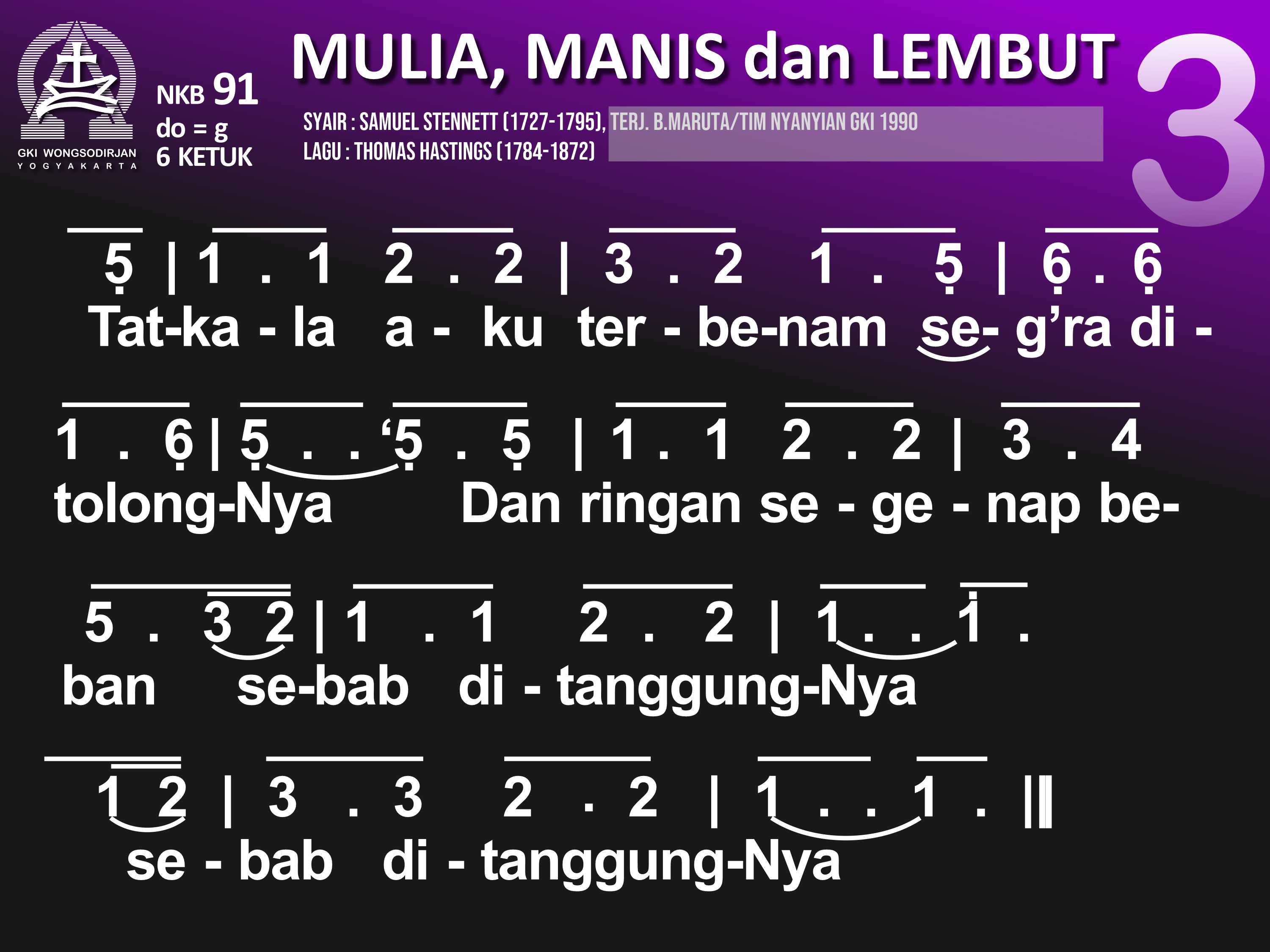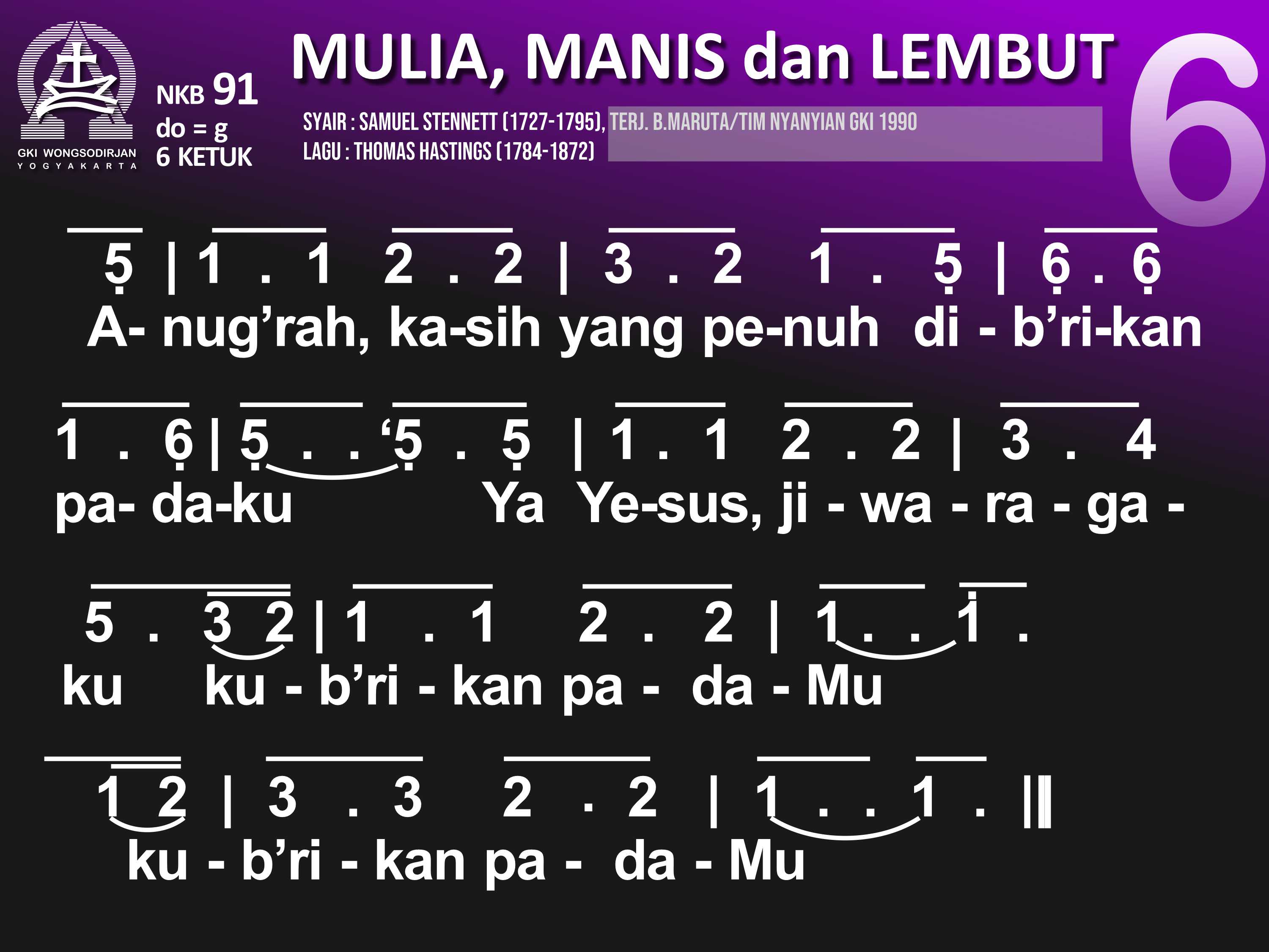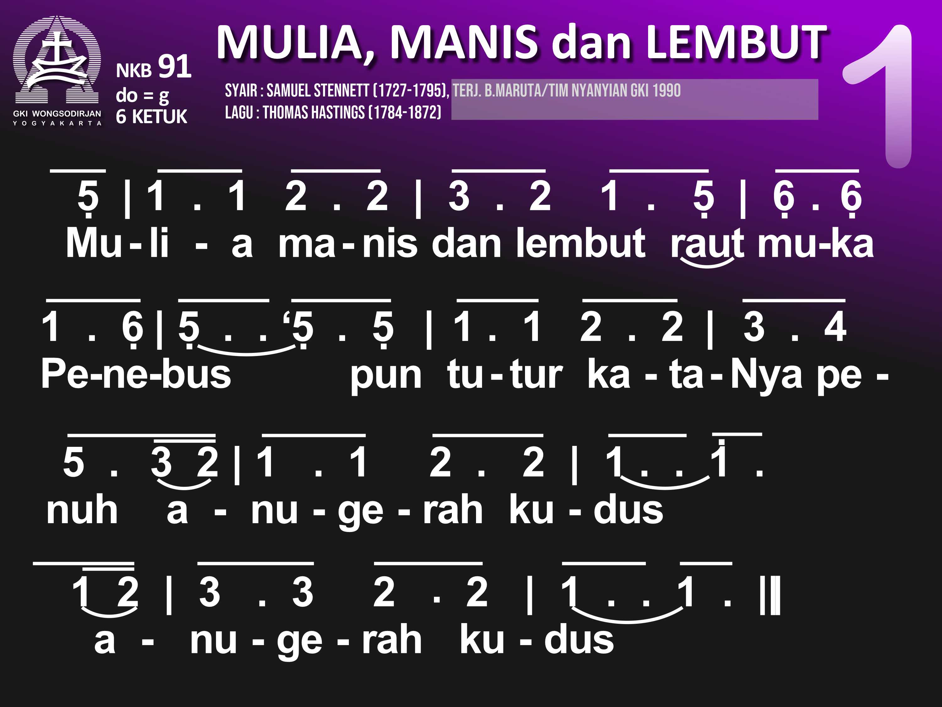 NKB.91 MULIA, MANIS, DAN LEMBUT Syair: Majestic Sweetness Sits Enthroned; Samuel Stennett Terjemahan B. Maruta / Tim Nyanyian GKI Lagu: Thomas Hastings Mulia, manis, dan lembut raut muka Penebus, pun tutur kataNya penuh anugerah kudus, anugerah kudus. Besar kuasa Tuhanku, tiada bandingnya, di sorga dan di bumi pun teguh wibawaNya; teguh wibawaNya Tatkala aku terbenam seg'ra ditolongNya. Dan ringan segenap beban sebab ditanggungNya; sebab ditanggungNya. Semua harta hidupku dib'rikan olehNya; kuasa maut telah lebur, 'ku dis'lamatkanNya; 'ku dis'lamatkanNya. Ke sorga, rumah yang terang, 'ku dihantarNya, 'ku lihat cahya yang cerlang, jiwaku bahagia; jiwaku bahagia. Anug'rah kasih yang penuh dib'rikan padaku. Ya Yesus, jiwa-ragaku kub'rikan padaMu; kub'rikan padaMu.