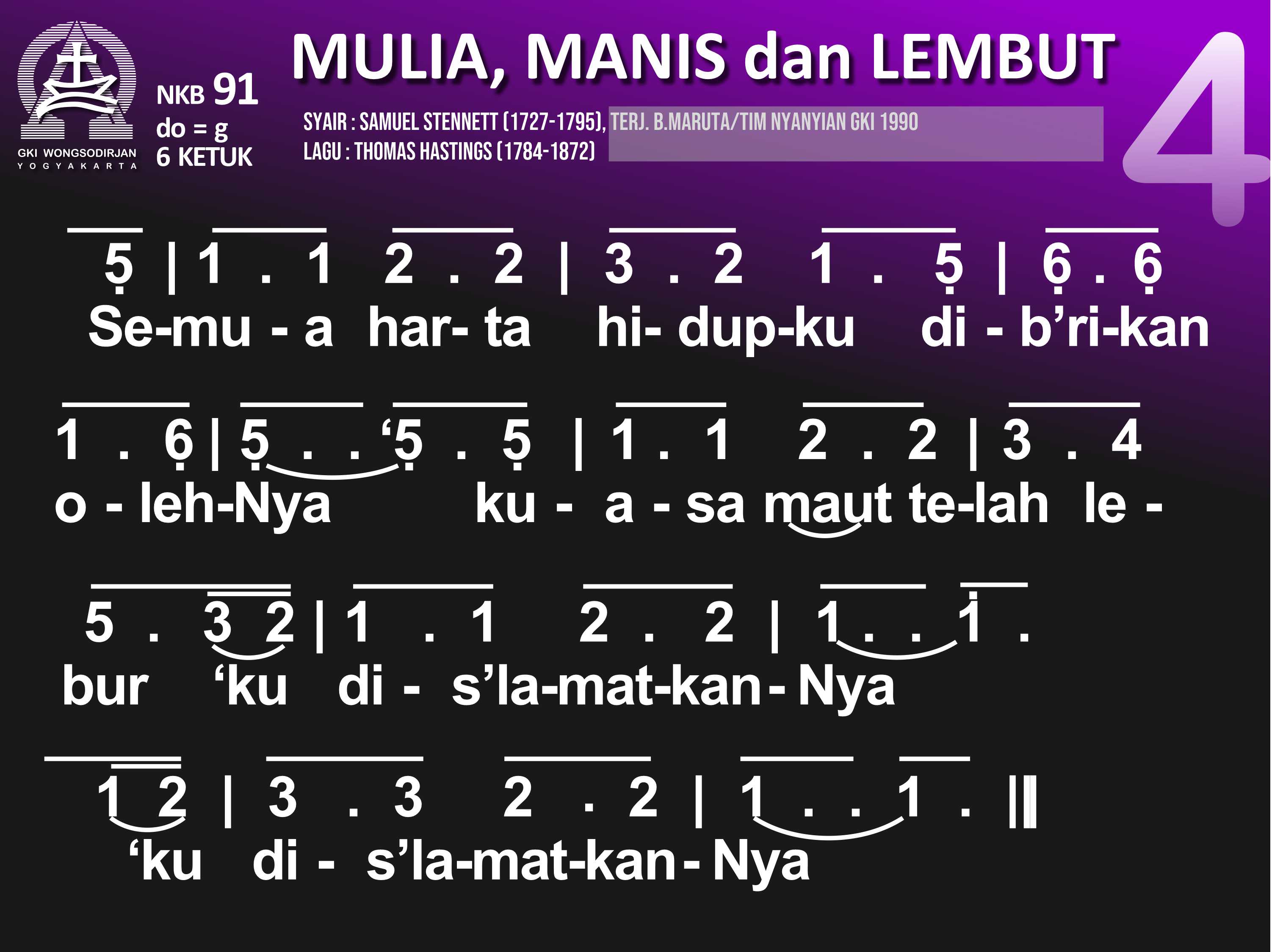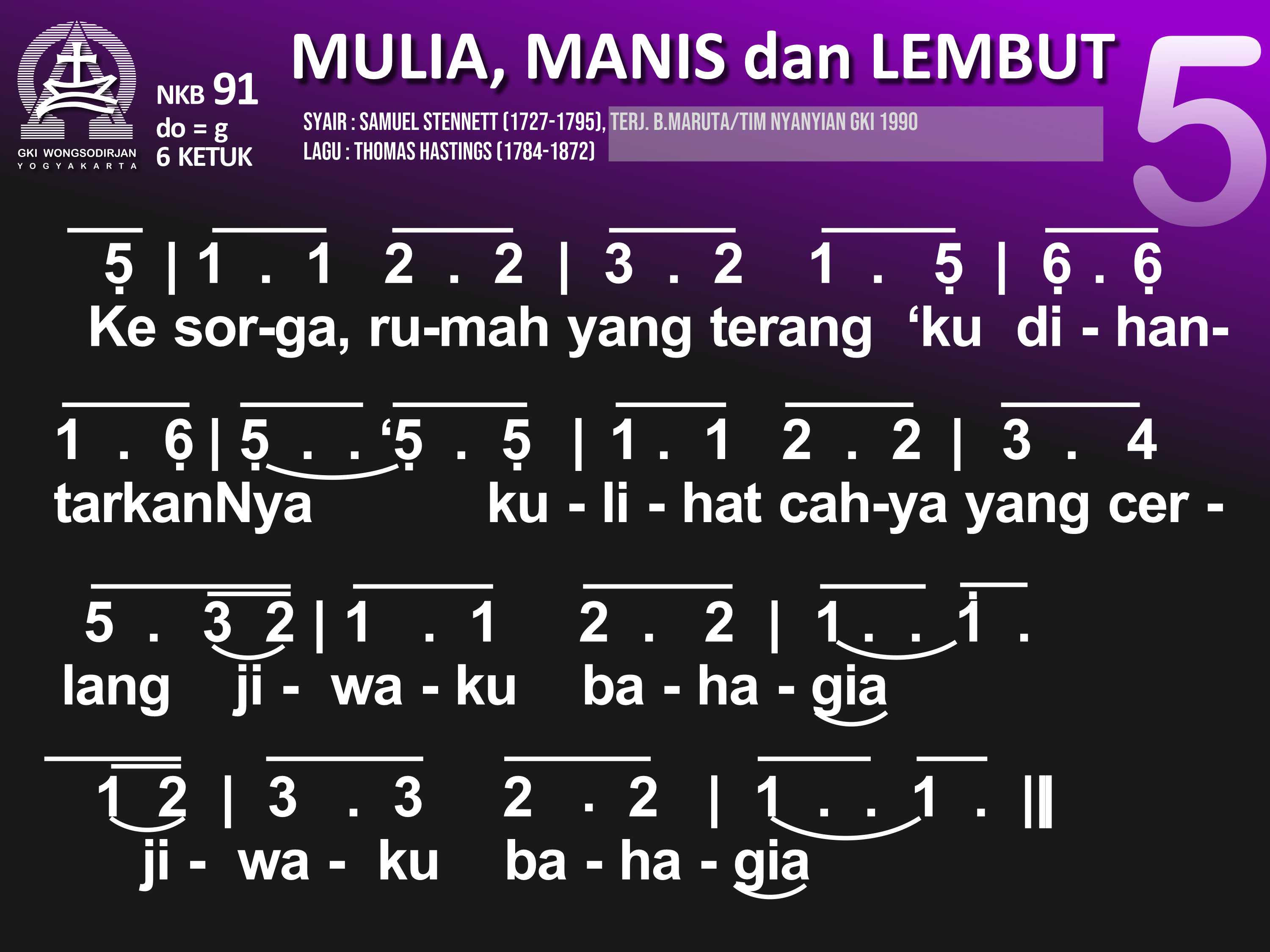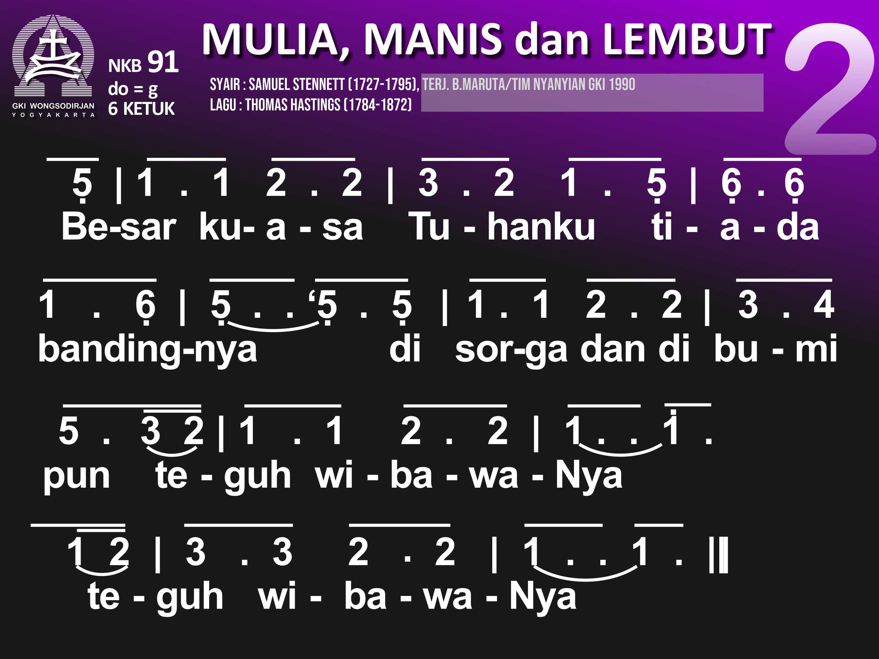 NKB.91 MULIA, MANIS, DAN LEMBUT Syair: Majestic Sweetness Sits Enthroned; Samuel Stennett Terjemahan B. Maruta / Tim Nyanyian GKI Lagu: Thomas Hastings Mulia, manis, dan lembut raut muka Penebus, pun tutur kataNya penuh anugerah kudus, anugerah kudus. Besar kuasa Tuhanku, tiada bandingnya, di sorga dan di bumi pun teguh wibawaNya; teguh wibawaNya Tatkala aku terbenam seg'ra ditolongNya. Dan ringan segenap beban sebab ditanggungNya; sebab ditanggungNya. Semua harta hidupku dib'rikan olehNya; kuasa maut telah lebur, 'ku dis'lamatkanNya; 'ku dis'lamatkanNya. Ke sorga, rumah yang terang, 'ku dihantarNya, 'ku lihat cahya yang cerlang, jiwaku bahagia; jiwaku bahagia. Anug'rah kasih yang penuh dib'rikan padaku. Ya Yesus, jiwa-ragaku kub'rikan padaMu; kub'rikan padaMu.