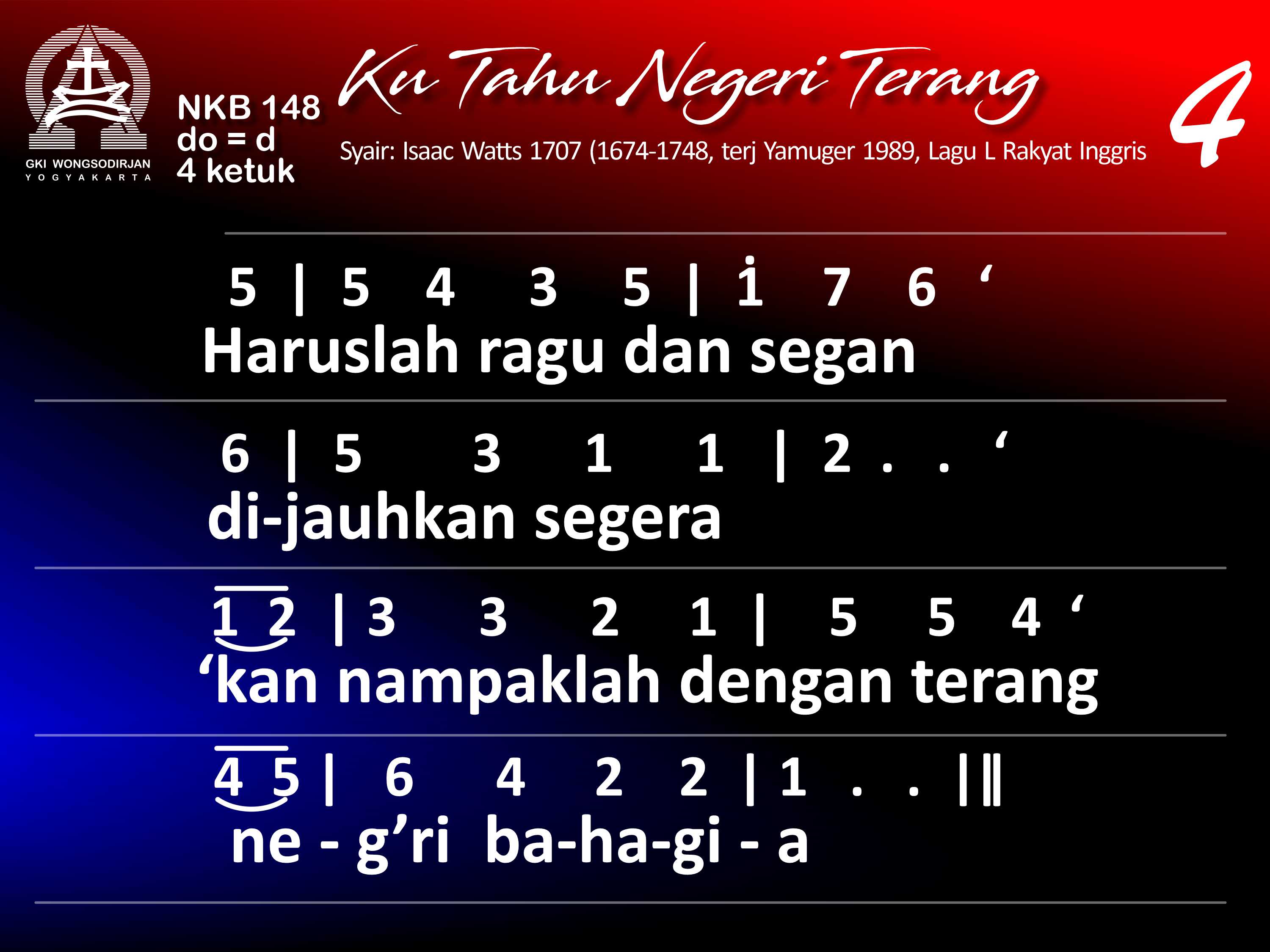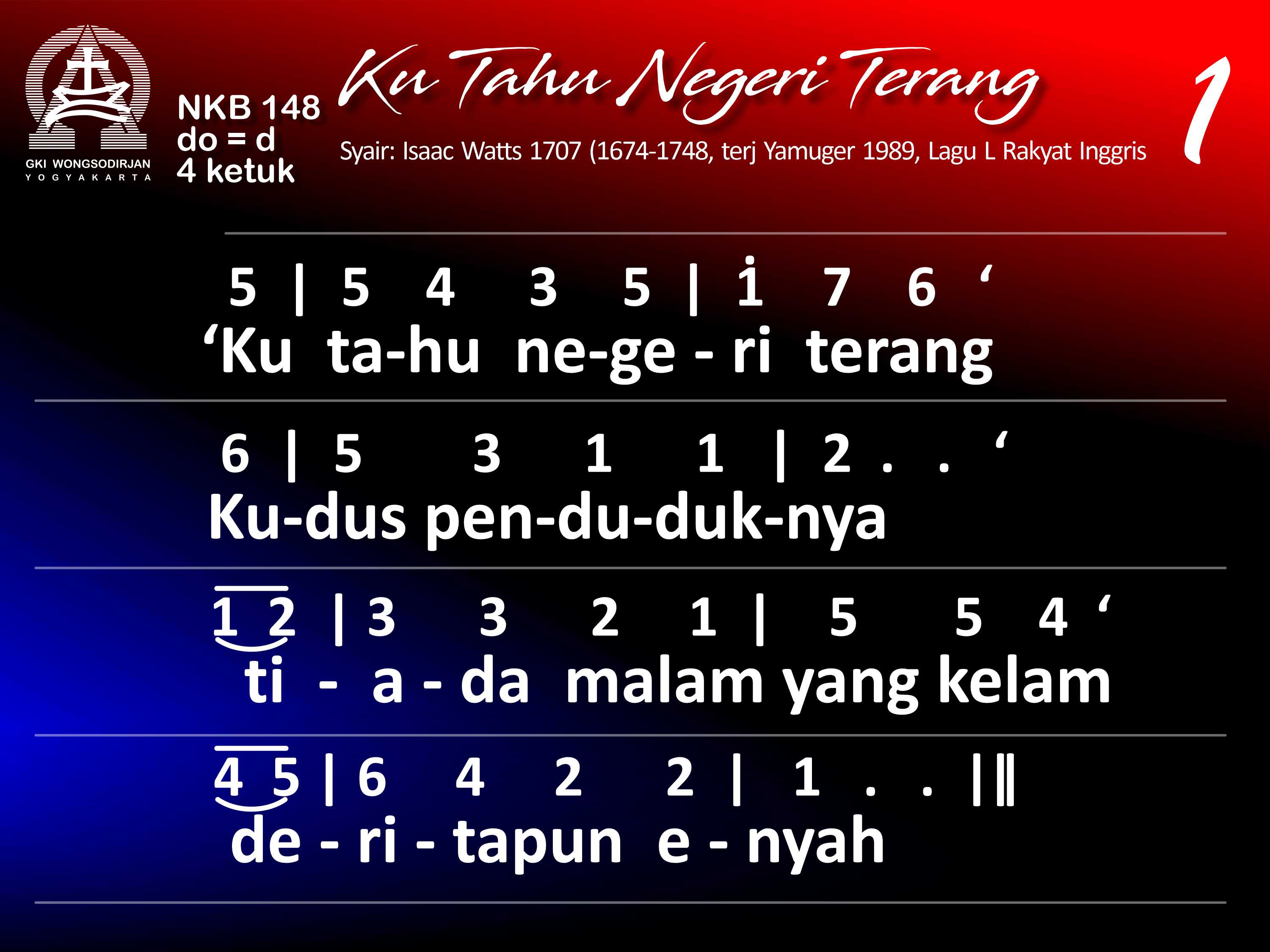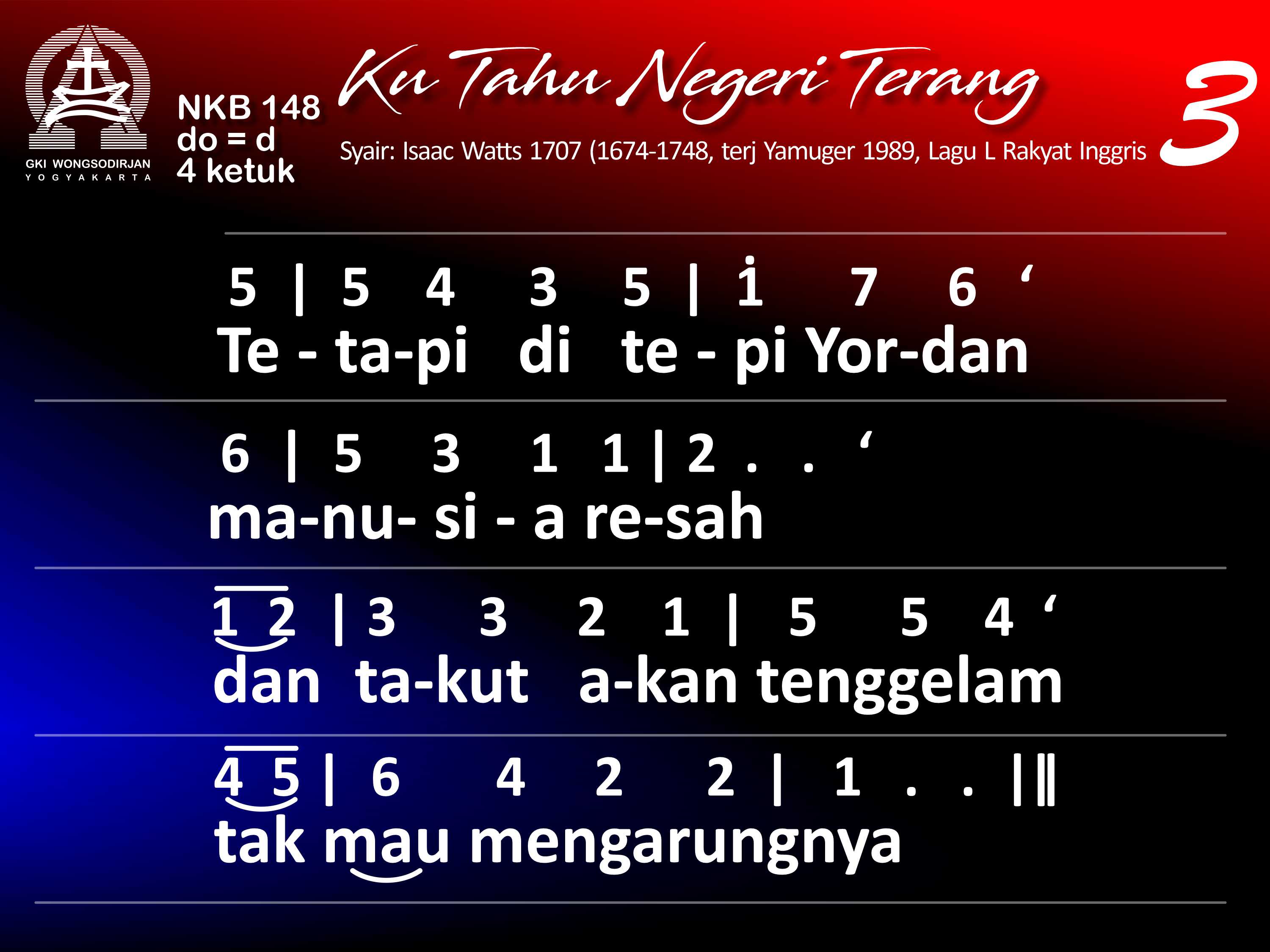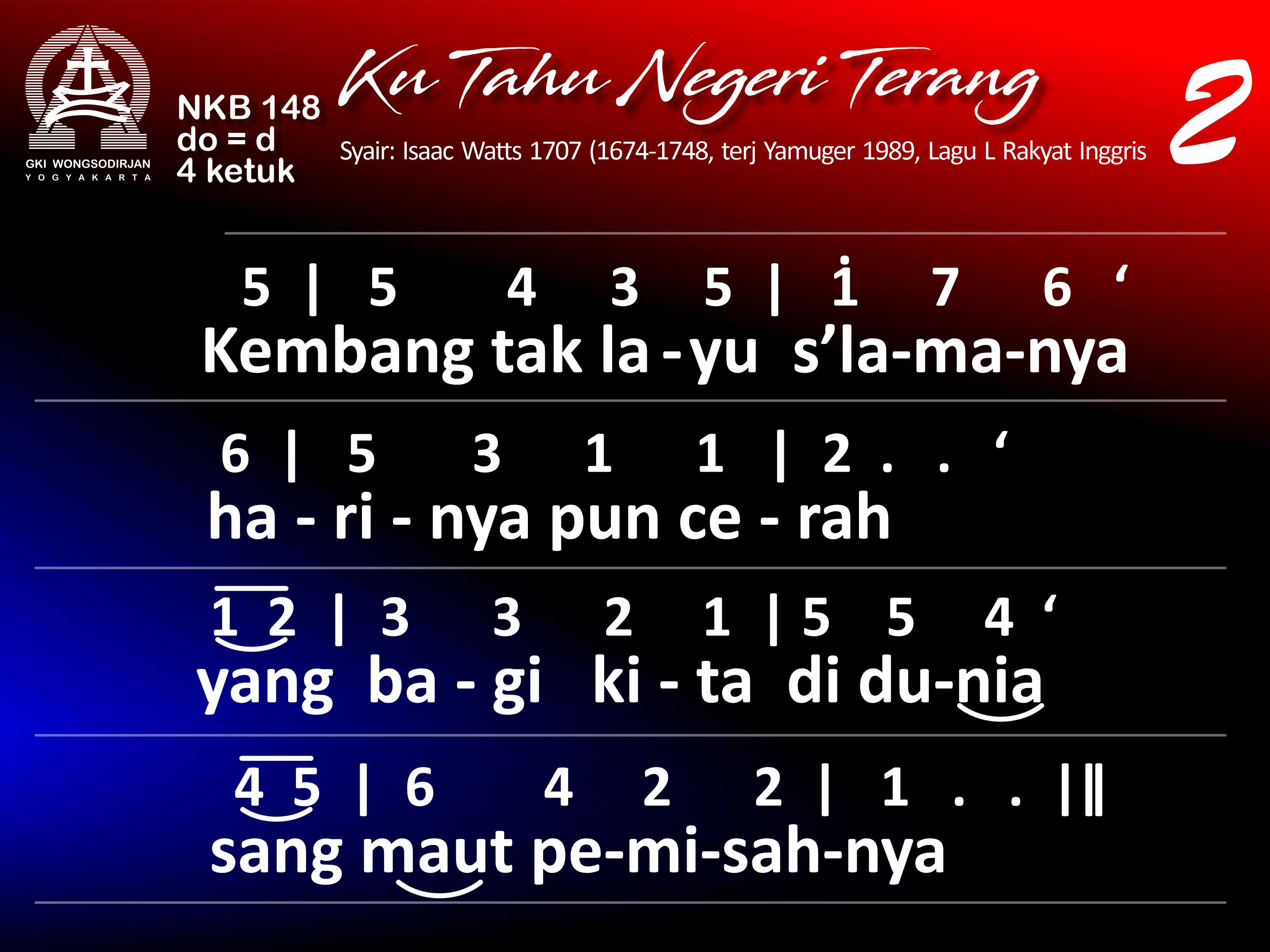 NKB.148 'KU TAHU NEGERI TERANG Syair: There is a Land of Pure Delight; Isaac Watts Terjemahan: YAMUGER Lagu: Tradisional Inggris 'Ku tahu negeri terang , kudus penduduknya; tiada malam yang kelam, derita pun enyah. Kembang tak layu s'lamanya, harinya pun cerah; yang bagi kita di dunia sang maut pemisahnya. Tetapi di tepi Yordan manusia resah dan takut akan tenggelam, tak mau mengarungnya. Haruslah ragu dan segan dijauhkan segera: 'kan nampaklah dengan terang neg'ri bahagia