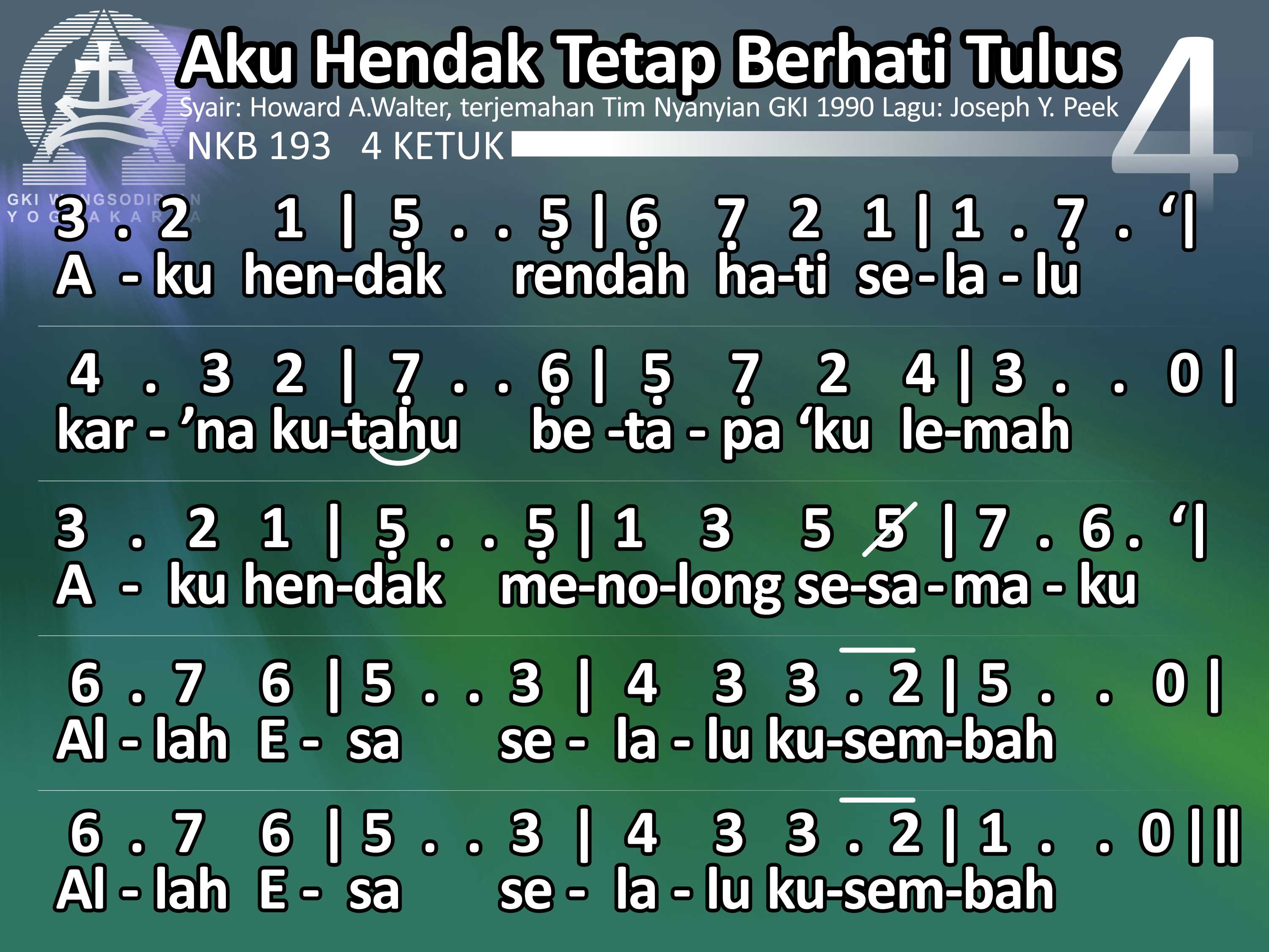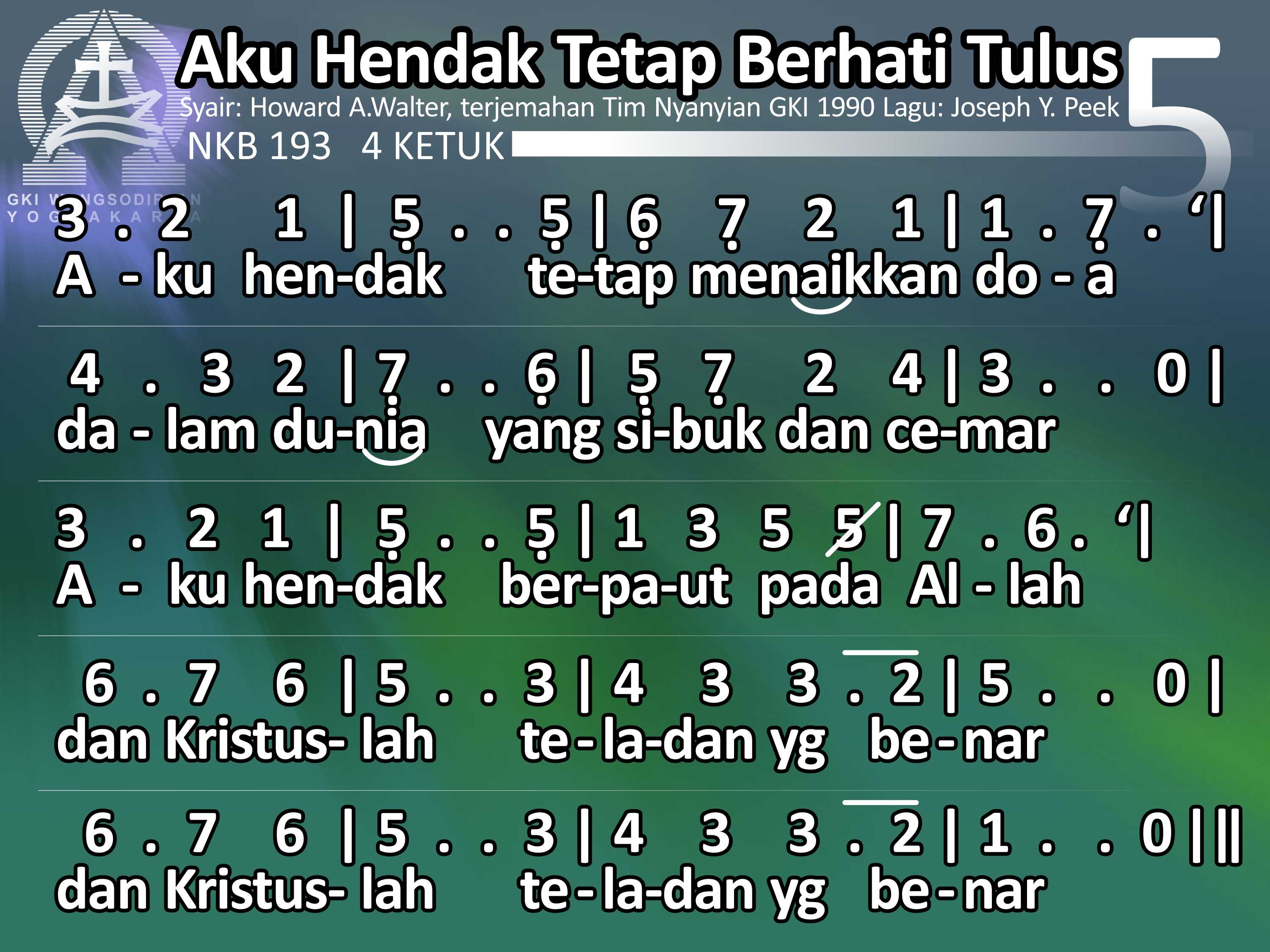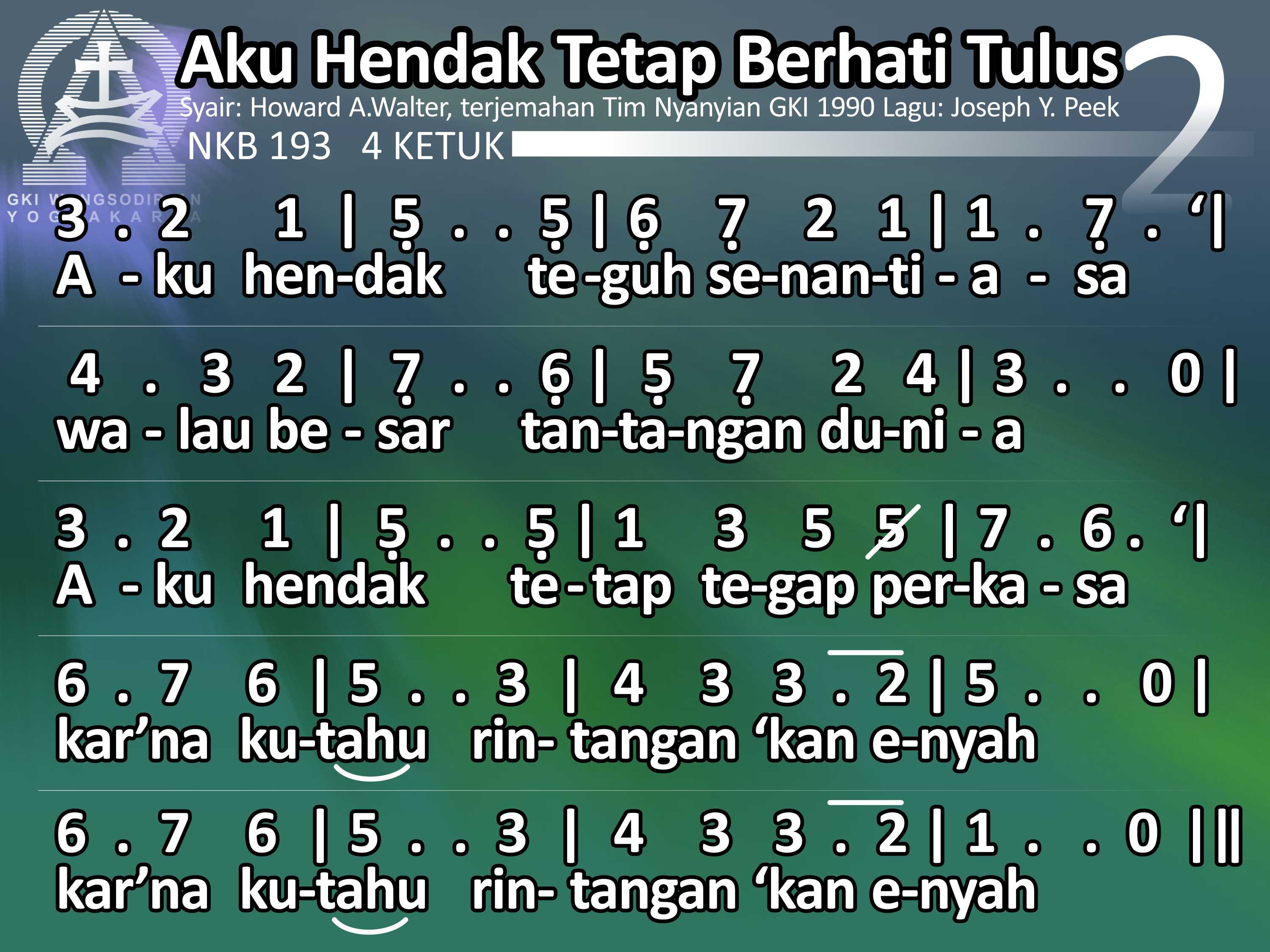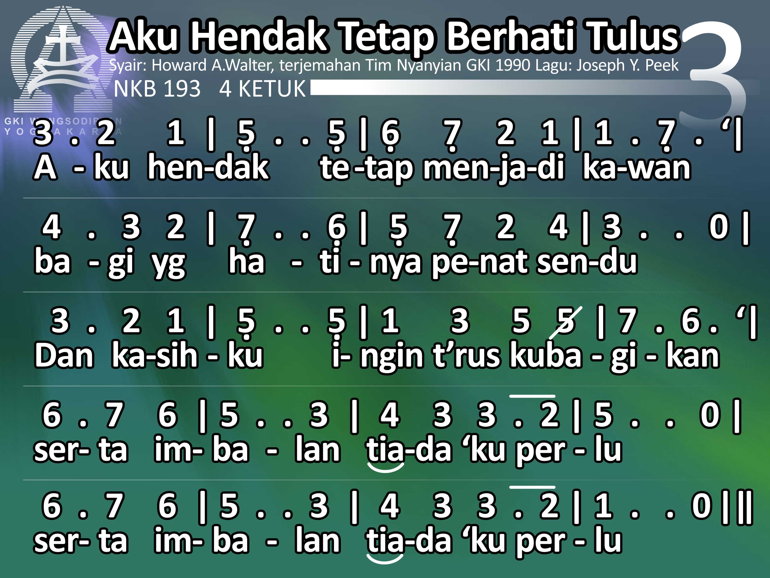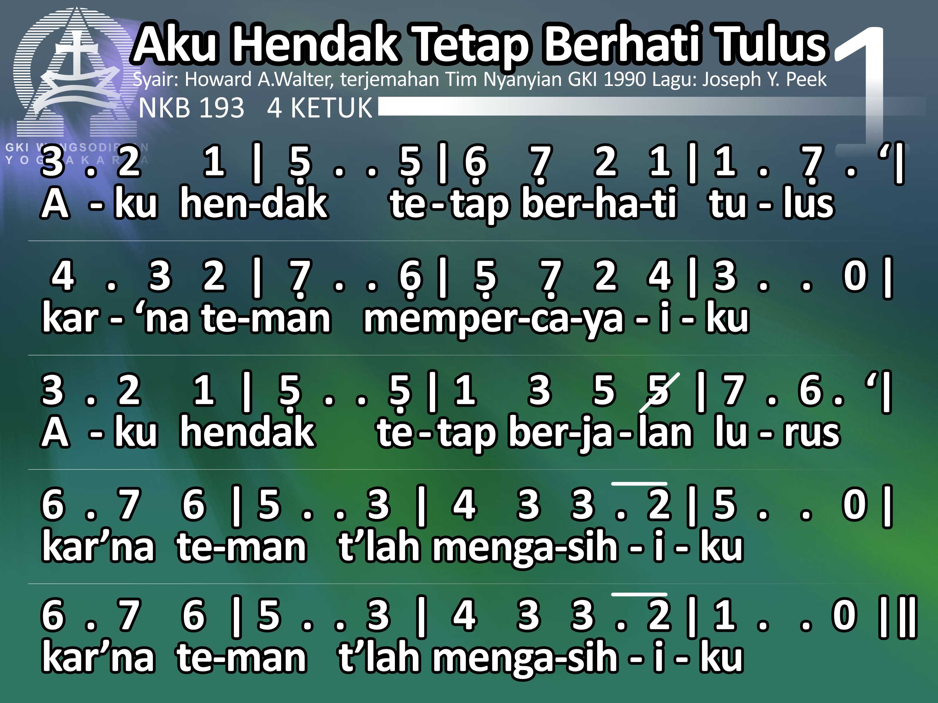 NKB.193 AKU HENDAK TETAP BERHATI TULUS Syair: I Would Be True; Howard A. Walter Terjemahan: Tim Nyanyian GKI Lagu: Joseph Y. Peek Aku hendak tetap berhati tulus kar'na teman mempercayaiku. Aku hendak tetap berjalan lurus, kar'na teman t'lah mengasihiku; kar'na teman t'lah mengasihiku. Aku hendak teguh senantiasa, walau besar tantangan dunia. Aku hendak tetap tegah perkasa kar'na 'ku tahu rintangan 'kan enyah; kar'na 'ku tahu rintangan 'kan enyah. Aku hendak tetap menjadi kawan bagi yang hatinya penat, sendu. Dan kasihku ingin t'rus 'ku bagikan, serta imbalan tiada 'ku perlu; serta imbalan tiada 'ku perlu. Aku hendak rendah hati selalu, kar'na 'ku tahu betapa 'ku lemah. Aku hendak menolong sesamaku; Allah Esa selalu 'ku sembah; Allah Esa selalu 'ku sembah.