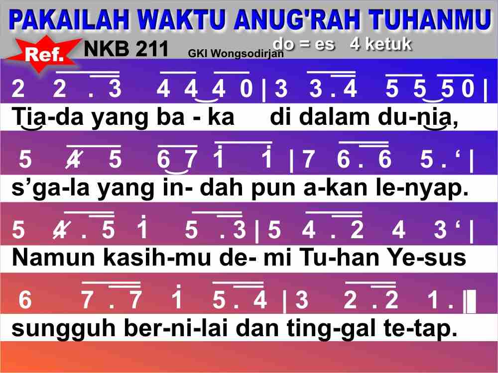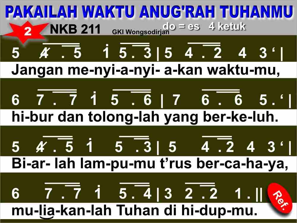 NKB.211 PAKAILAH WAKTU ANUG'RAH TUHANMU Syair dan lagu: Grijp toch de kansen; Ira D. Sankey Terjemahan: Tim Nyanyian GKI Pakailah waktu anug'rah Tuhanmu, hidupmu singkat bagaikan kembang. Mana benda yang kekal di hidupmu? Hanyalah kasih tak akan lekang. Refrein: Tiada yang baka di dalam dunia, s'gala yang indahpun akan lenyap. Namun kasihmu demi Tuhan Yesus sungguh bernilai dan tinggal tetap. Janganlah sia-siakan waktumu, hibur dan tolonglah yang berkeluh. Biarlah lampumu t'rus bercahaya, muliakanlah Tuhan di hidupmu. Karya jerihmu demi Tuhan Yesus, 'kan dihargai benar olehNya. Kasih yang sudah 'kau tabur di dunia, nanti 'kau tuai di sorga mulia.