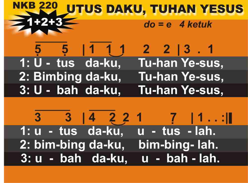 NKB.220 UTUS DAKU, TUHAN YESUS Syair: Thuma Mina; Anon Terjemahan Inggris: Send Me Jesus Terjemahan: F. Suleeman Lagu: Tradisional Afrika Selatan Hak Cipta: Utryck Publishing, Swedia Utus daku, Tuhan Yesus, utus daku, utuslah. Bimbing daku, Tuhan Yesus, bimbing daku, bimbinglah. Ubah daku, Tuhan Yesus, ubah daku, ubahlah.