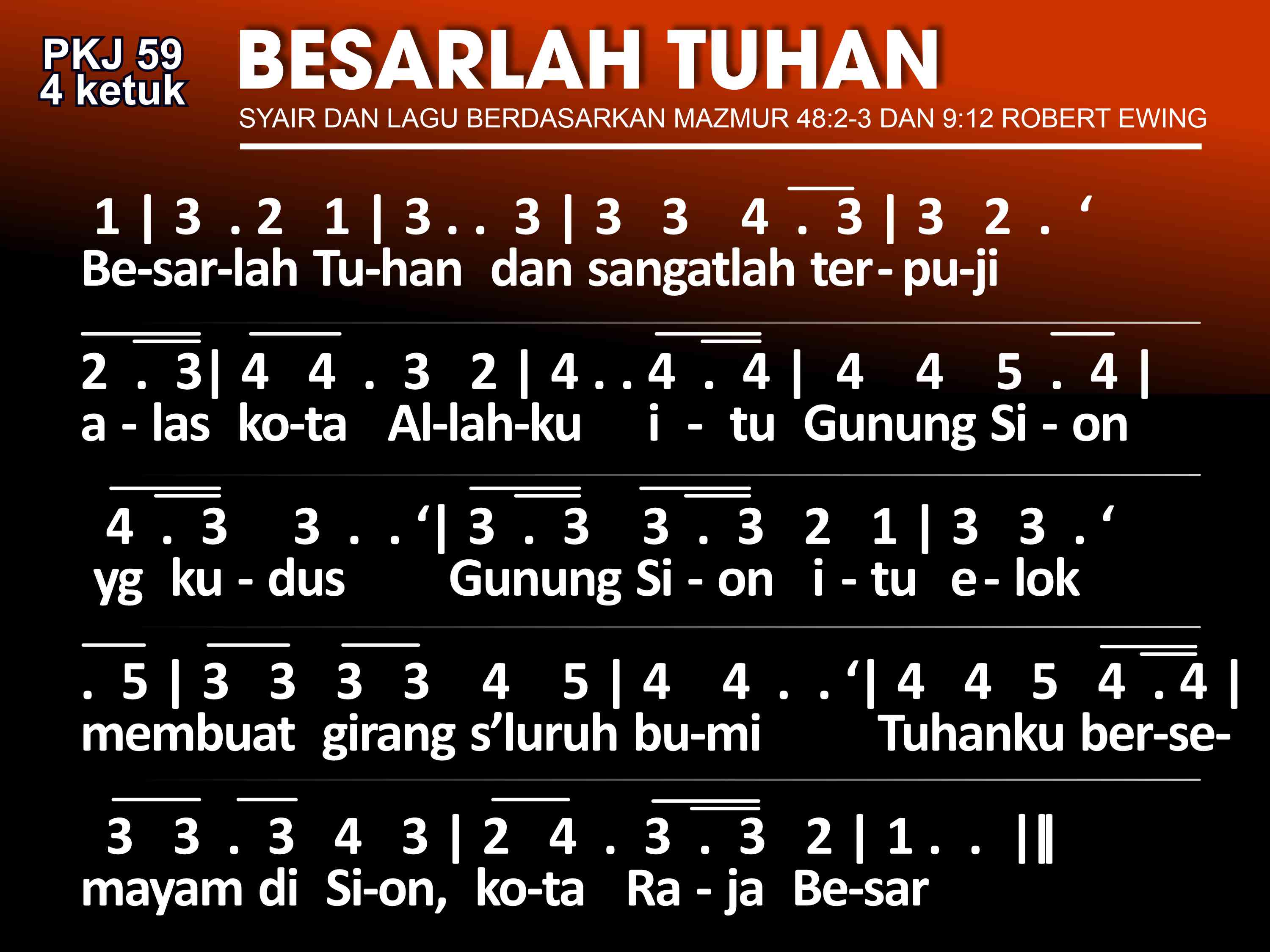 PKJ.059 BESARLAH TUHAN Syair dan lagu: Great is the Lord, Berdasarkan Mazmur 48:2-3 dan 9:12, Robert Ewing, Terjemahan: Yamuger, 1998, (c) Robert Ewing do = f 4 ketuk Besarlah Tuhan dan sangatlah terpuji, alas kota Allahku itu Gunung Sion yang kudus; Gunung Sion itu elok, membuat girang s'luruh bumi, Tuhanku bersemayam di Sion, kota Raja Besar.