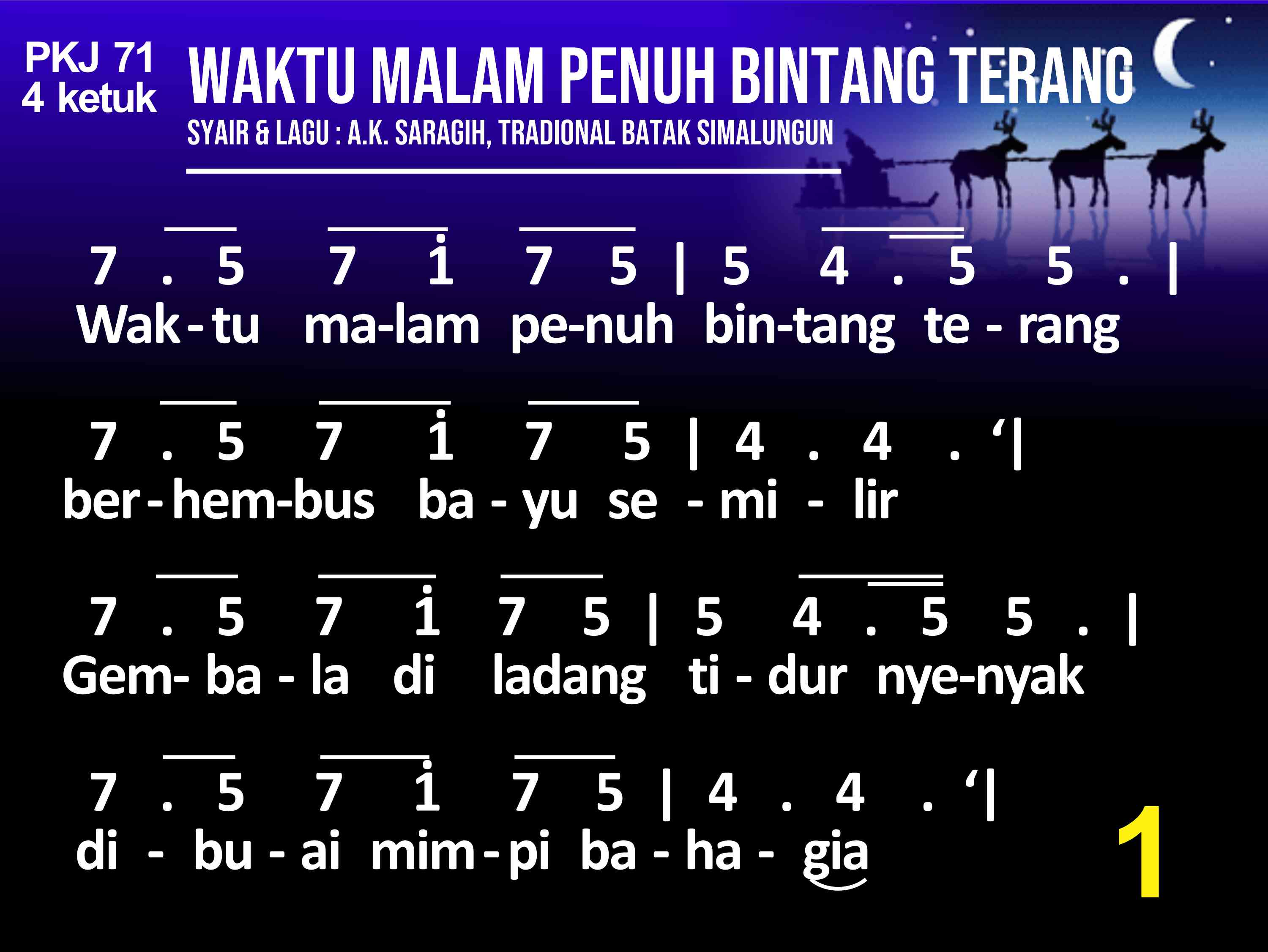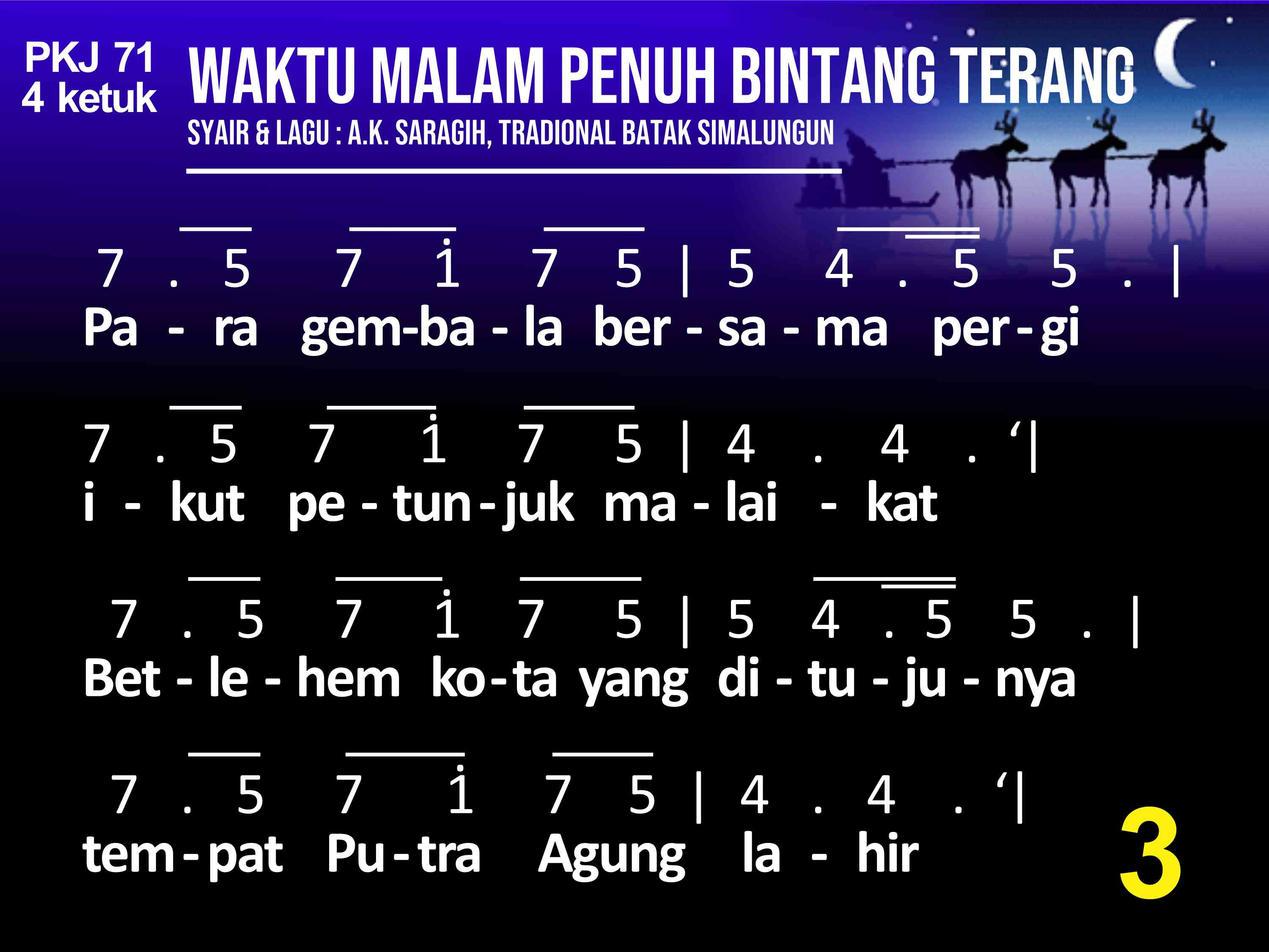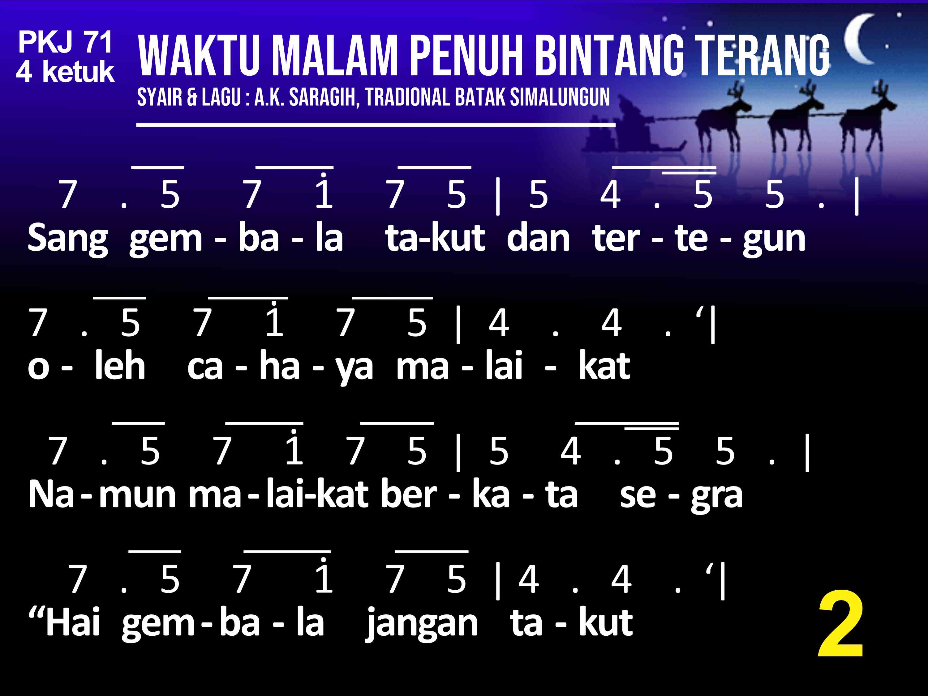 PKJ.071 WAKTU MALAM PENUH BINTANG TERANG Syair: A. K. Saragih, Lagu: Tradisional Batak Simalungun do = a 4 ketuk (1) Waktu malam penuh bintang terang, berhembus bayu semilir. Gembala diladang tidur nyenyak dibuai mimpi bahagia. Tiba-tiba terdengar suara bergema, malak sorga menyampaikan b'ritanya. (2) Sang gembala takut dan tertegun oleh cahaya malaikat. Namun malaikat berkata se'gra: "Hai gembala, jangat takut!" Inilah kabar kesukaan besar bagimu dan s'luruh bangsa didunia. (3) Para gembala bersama pergi, ikut petunjuk malaikat. Betlehem kota yang ditujunya, tempat Putra Agung lahir. Kain lampin sederhana membendung, dipalungan dibaringkan terlelap. (4) Sujudlah gembala dan menyembah, dan sangat sukacita. Janji Allah kini sudah genap, sungguh nyata dalam dunia. Kemuliaan bagi Allah disorga dan damai sejaht'ra bagi dunia. Refrein : Kristus Anak Allah lahir didunia.