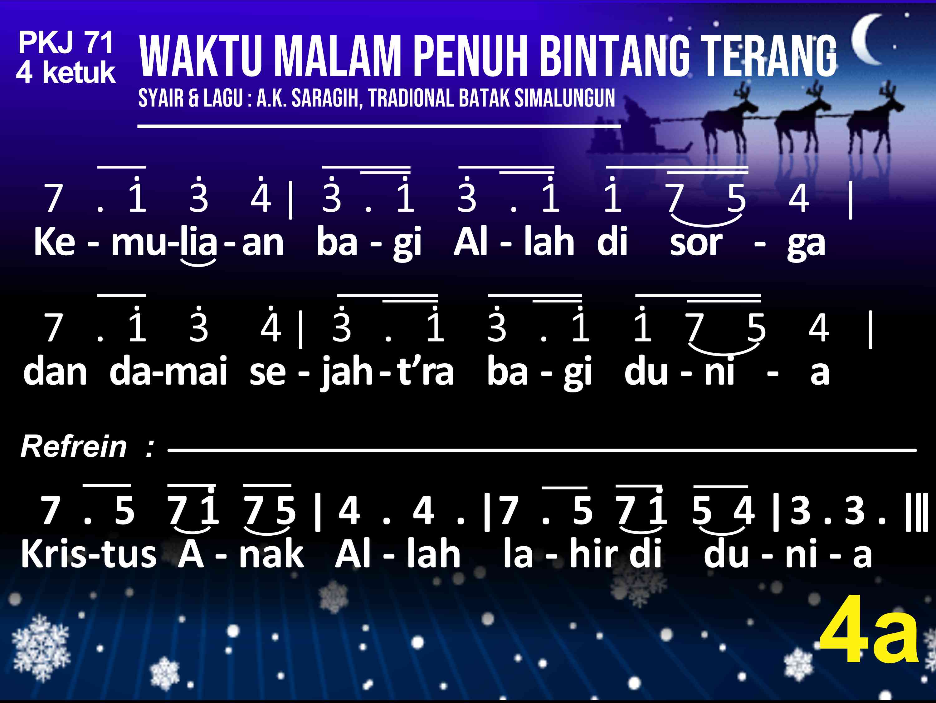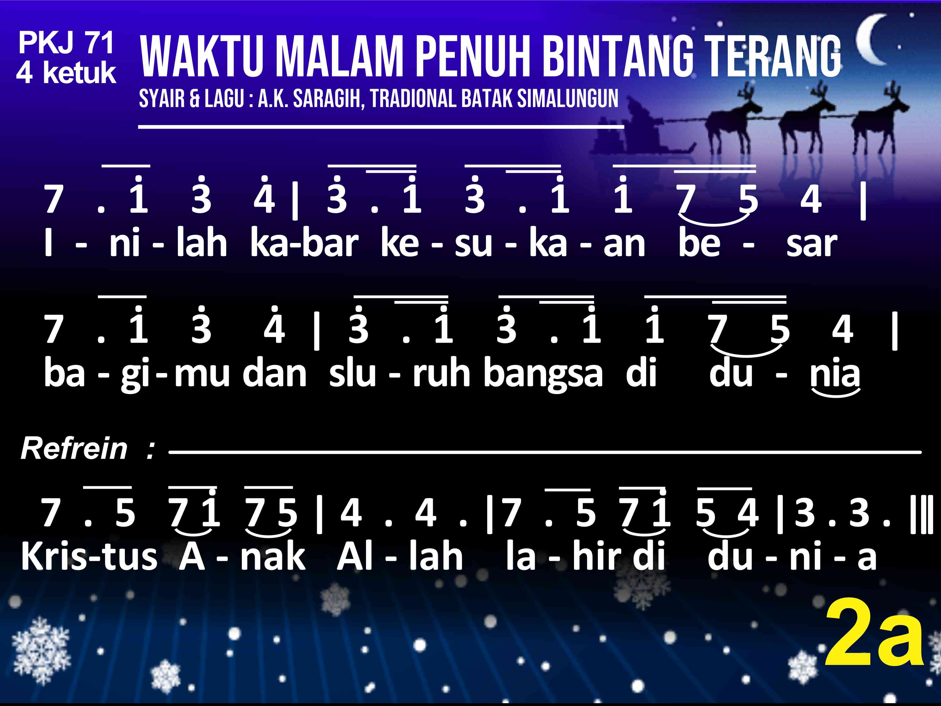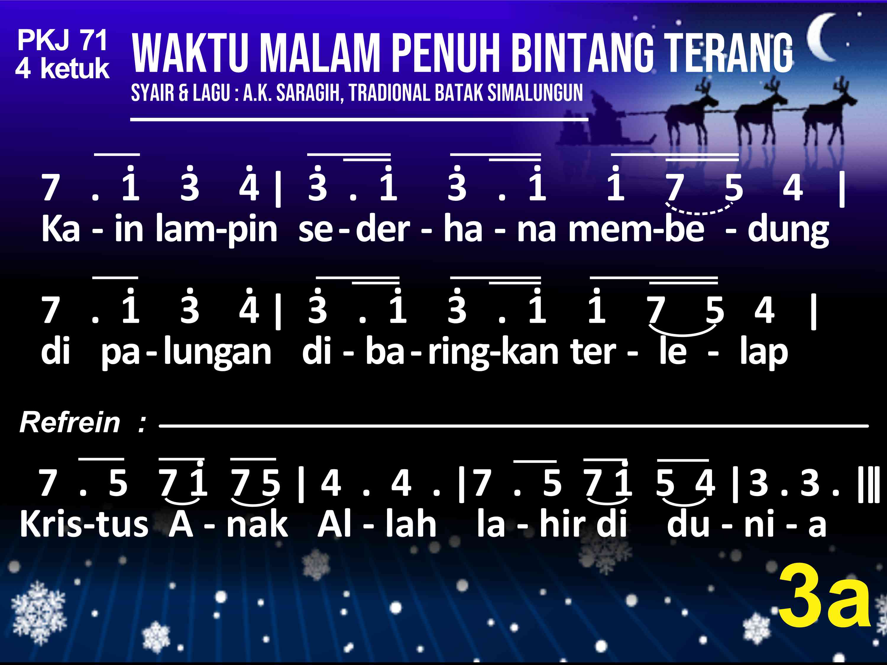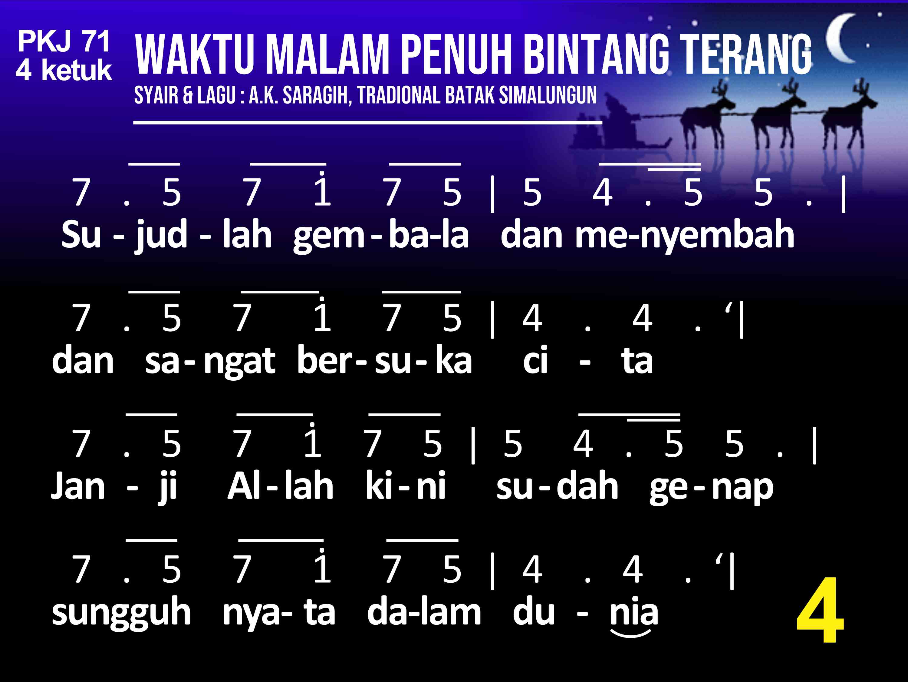 PKJ.071 WAKTU MALAM PENUH BINTANG TERANG Syair: A. K. Saragih, Lagu: Tradisional Batak Simalungun do = a 4 ketuk (1) Waktu malam penuh bintang terang, berhembus bayu semilir. Gembala diladang tidur nyenyak dibuai mimpi bahagia. Tiba-tiba terdengar suara bergema, malak sorga menyampaikan b'ritanya. (2) Sang gembala takut dan tertegun oleh cahaya malaikat. Namun malaikat berkata se'gra: "Hai gembala, jangat takut!" Inilah kabar kesukaan besar bagimu dan s'luruh bangsa didunia. (3) Para gembala bersama pergi, ikut petunjuk malaikat. Betlehem kota yang ditujunya, tempat Putra Agung lahir. Kain lampin sederhana membendung, dipalungan dibaringkan terlelap. (4) Sujudlah gembala dan menyembah, dan sangat sukacita. Janji Allah kini sudah genap, sungguh nyata dalam dunia. Kemuliaan bagi Allah disorga dan damai sejaht'ra bagi dunia. Refrein : Kristus Anak Allah lahir didunia.