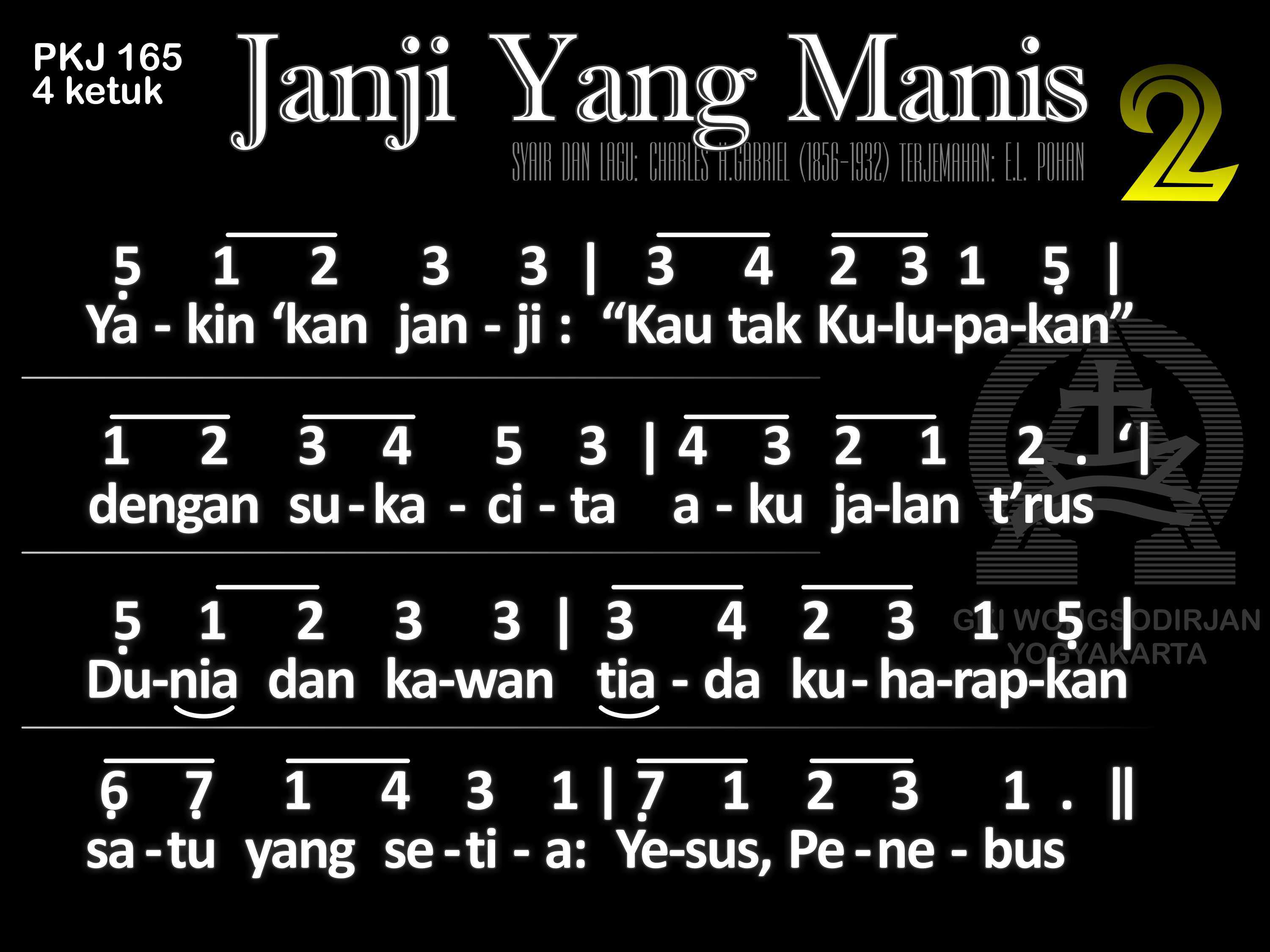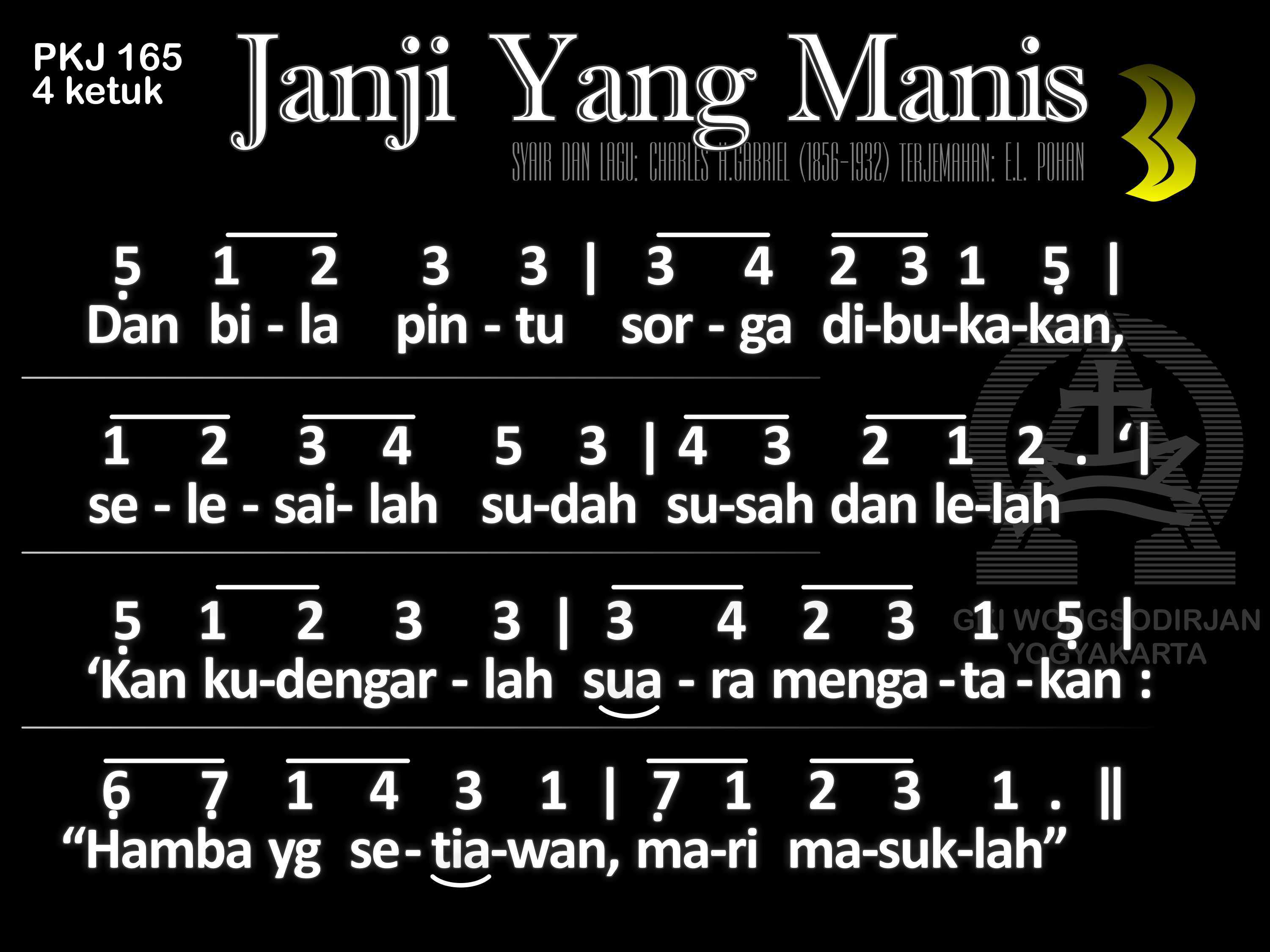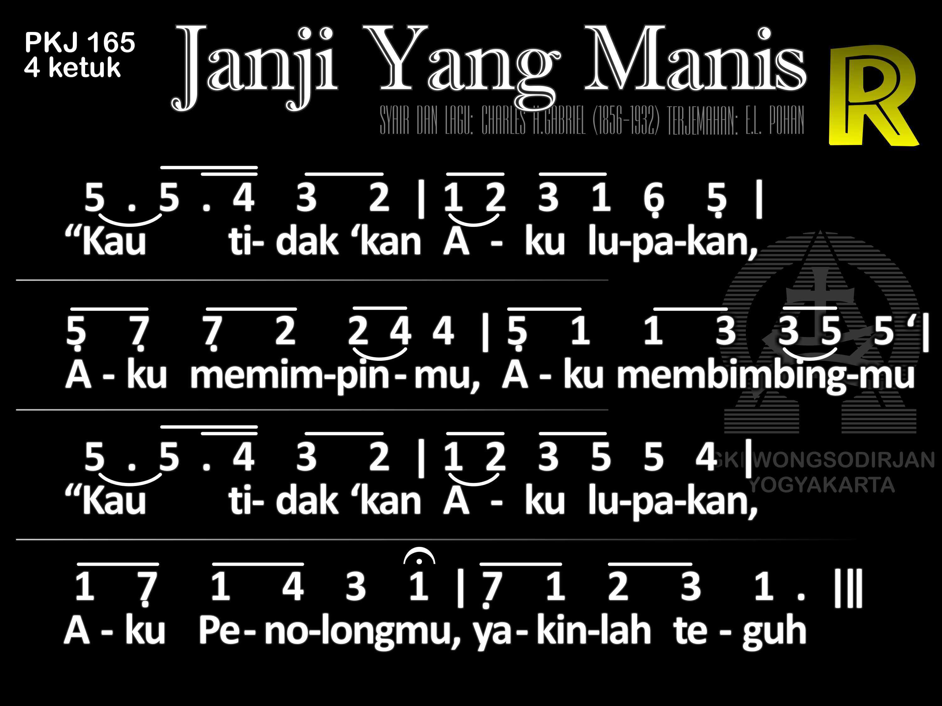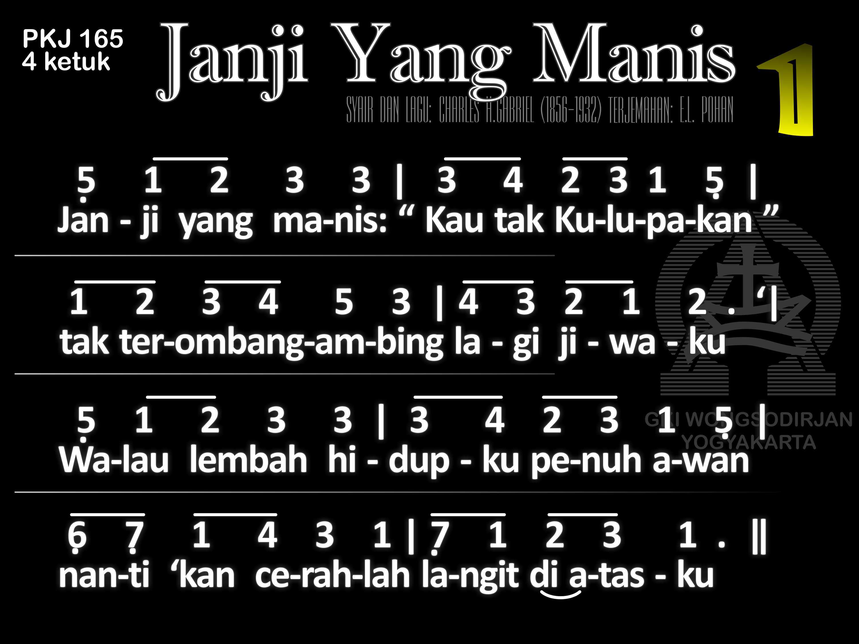 PKJ.165 JANJI YANG MANIS Syair dan lagu: I Will Not Forget Thee, Charles H. Gabriel (1856 – 1932), Terjemahan: E. L. Pohan (1917 – 1933) do = as 4 ketuk (1) Janji yang manis: "Kau tak Kulupakan", tak terombang-ambing lagi jiwaku. Walau lembah hidupku penuh awan, nanti 'kan cerahlah langit di atasku. Refrein: "Kau tidak 'kan Aku lupakan, Aku memimpinmu, Aku membimbingmu; Kau tidak 'kan Aku lupakan, Aku Penolongmu, yakinlah teguh". (2) Yakin 'kan janji: "Kau tak Kulupakan", dengan sukacita aku jalan t'rus. Dunia dan kawan tiada kuharapkan, satu yang setia: Yesus, Penebus. (3) Dan bila pintu sorga dibukakan, selesailah sudah susah dan lelah. 'Kan kudengarlah suara mengatakan: "Hamba yang setiawan, mari masuklah".