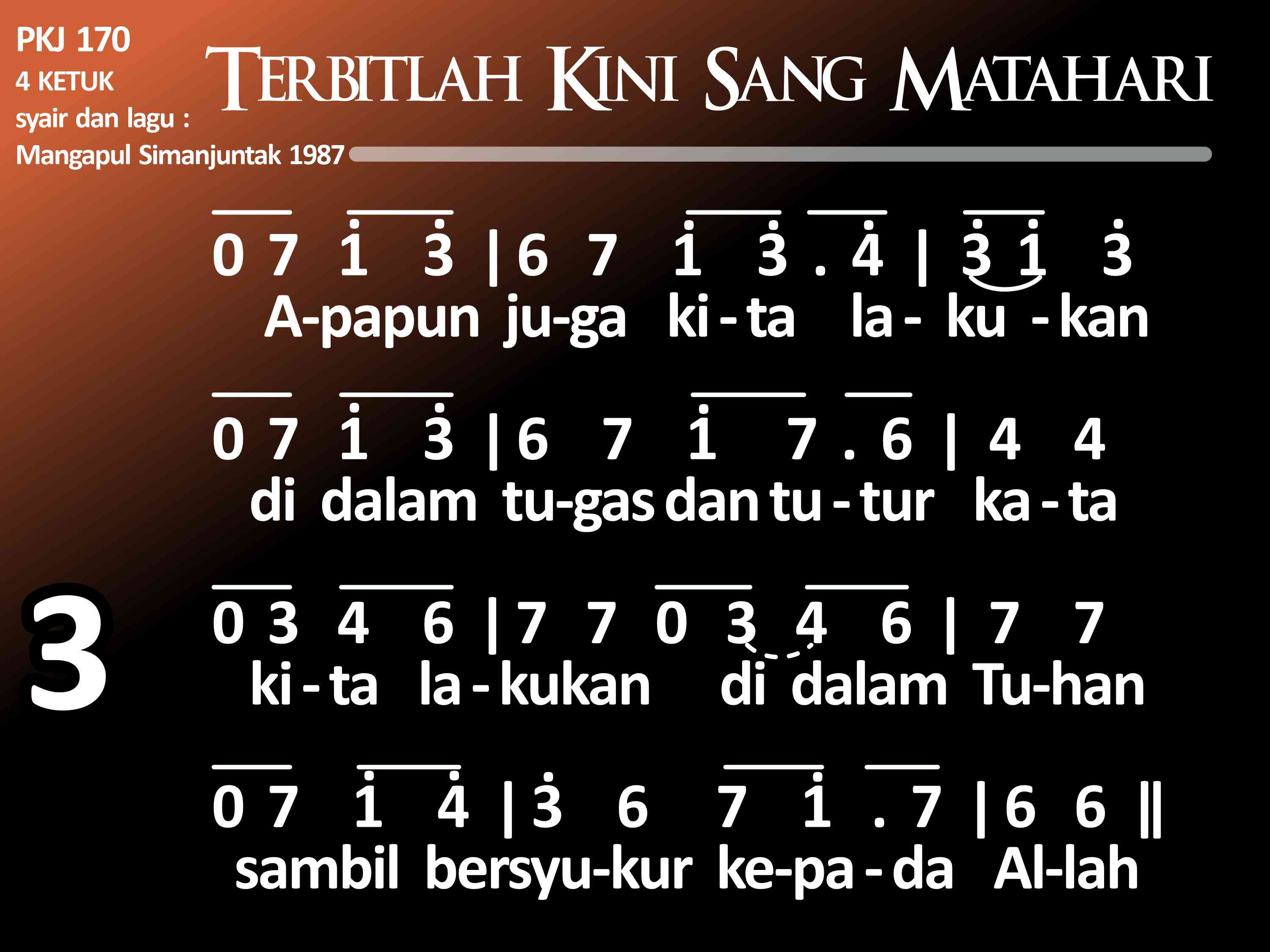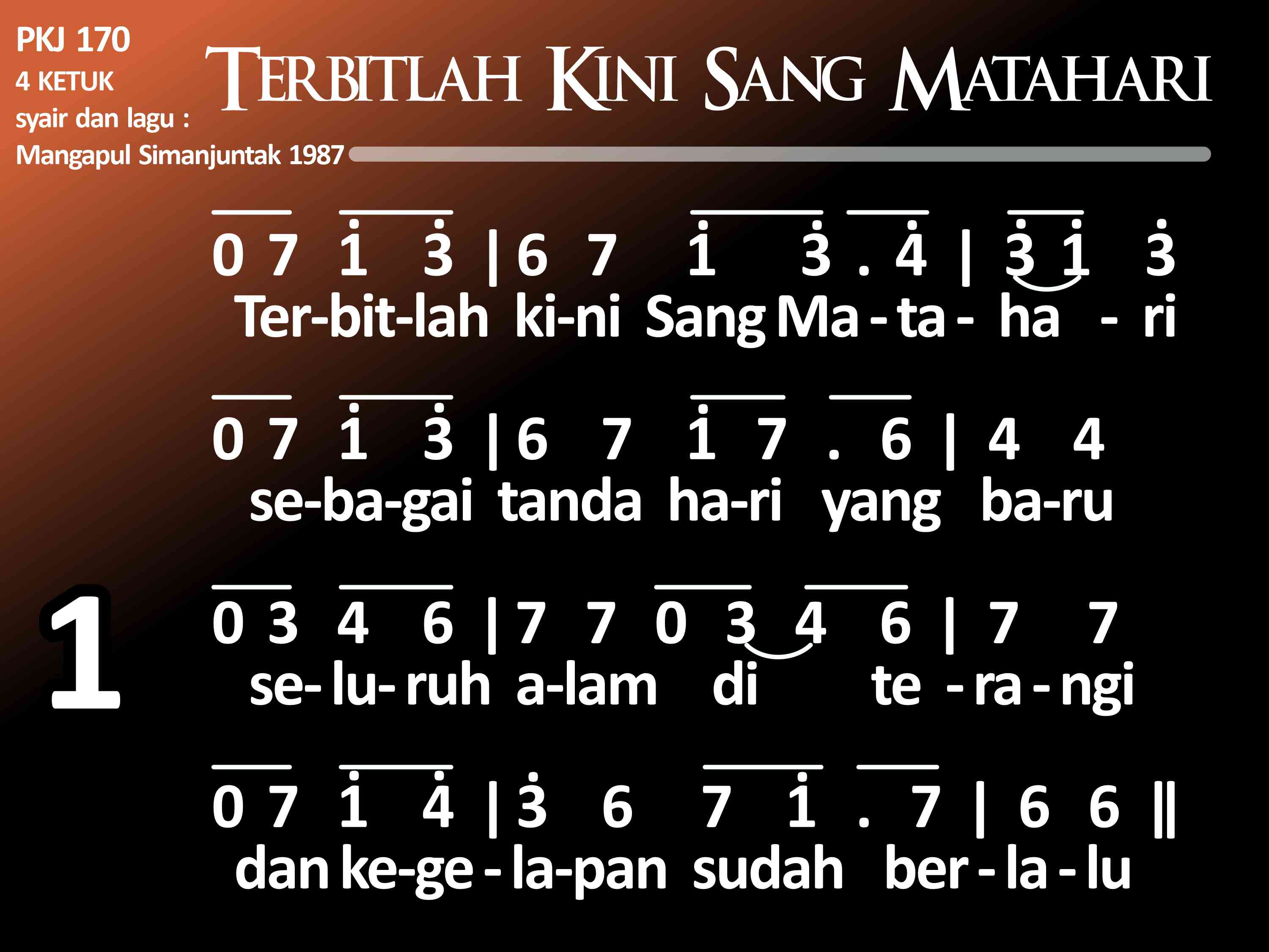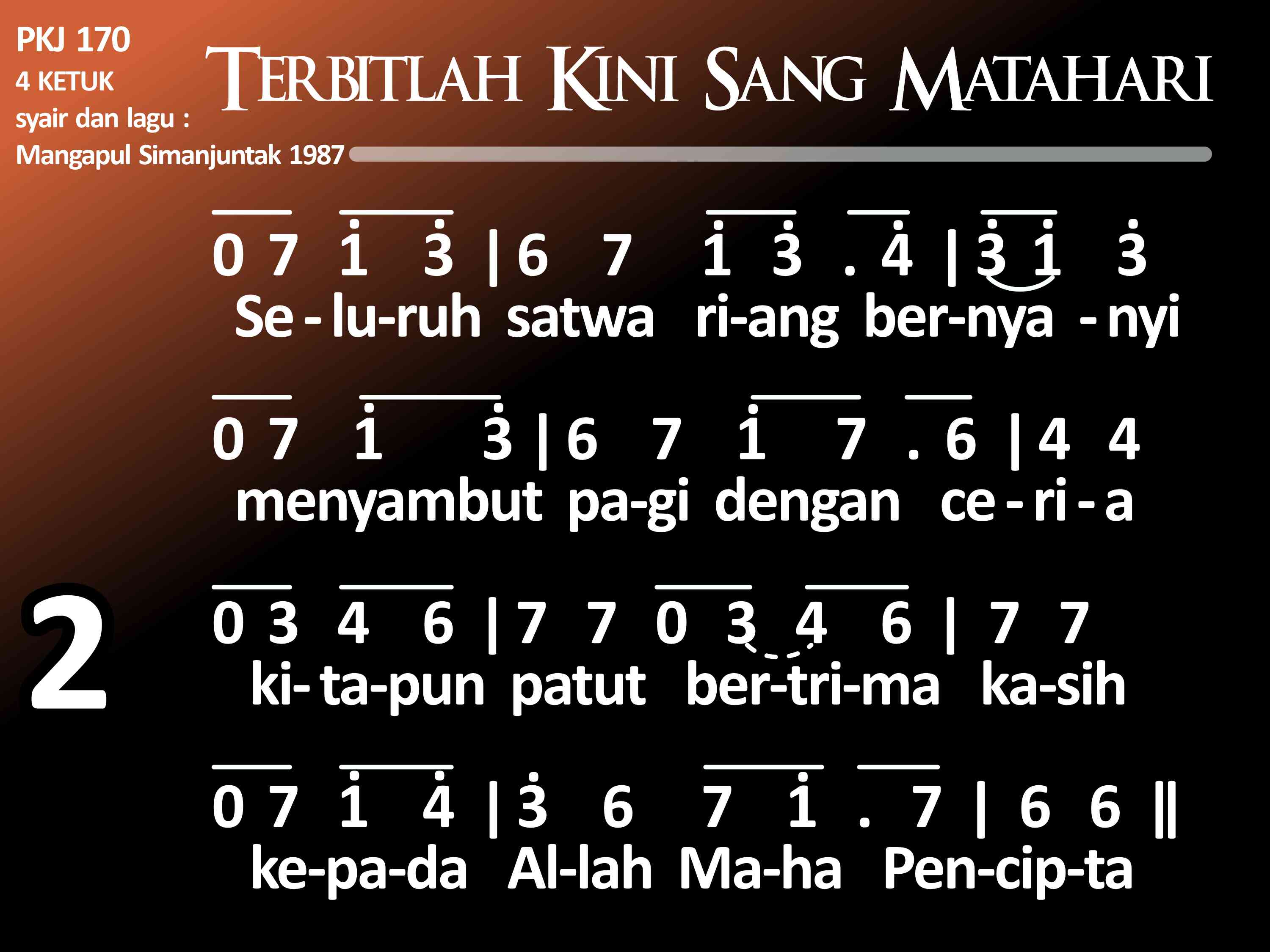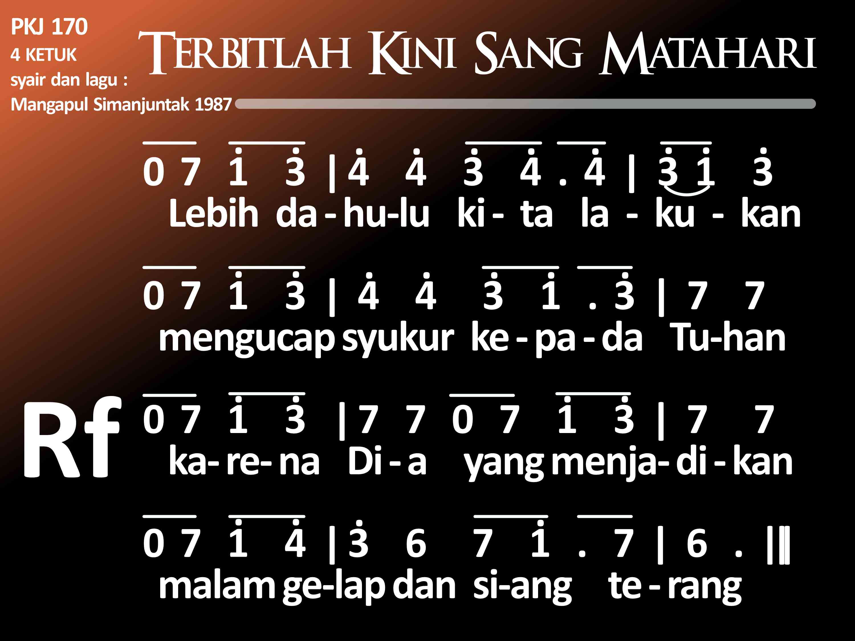 PKJ.170 TERBITLAH KINI SANG MATAHARI Syair dan lagu: Mangapul P. Simanjuntak, 1987 (1935 – 1990) la = f 4 ketuk (1) Terbitlah kini Sang Matahari sebagai tanda hari yang baru. Seluruh alam diterangi dan kegelapan sudah berlalu. Refrein: Lebih dahulu kita lakukan: Mengucap syukur kepada Tuhan, karena Dia yang menjadikan malam gelap dan siang terang. (2) Seluruh satwa riang bernyanyi menyambut pagi dengan ceria. Kita pun patut bert'rima kasih kepada Allah, Maha Pencipta. (3) Apa pun juga kita lakukan di dalam tugas dan tutur kata, kita lakukan di dalam Tuhan, sambil bersyukur kepada Allah.