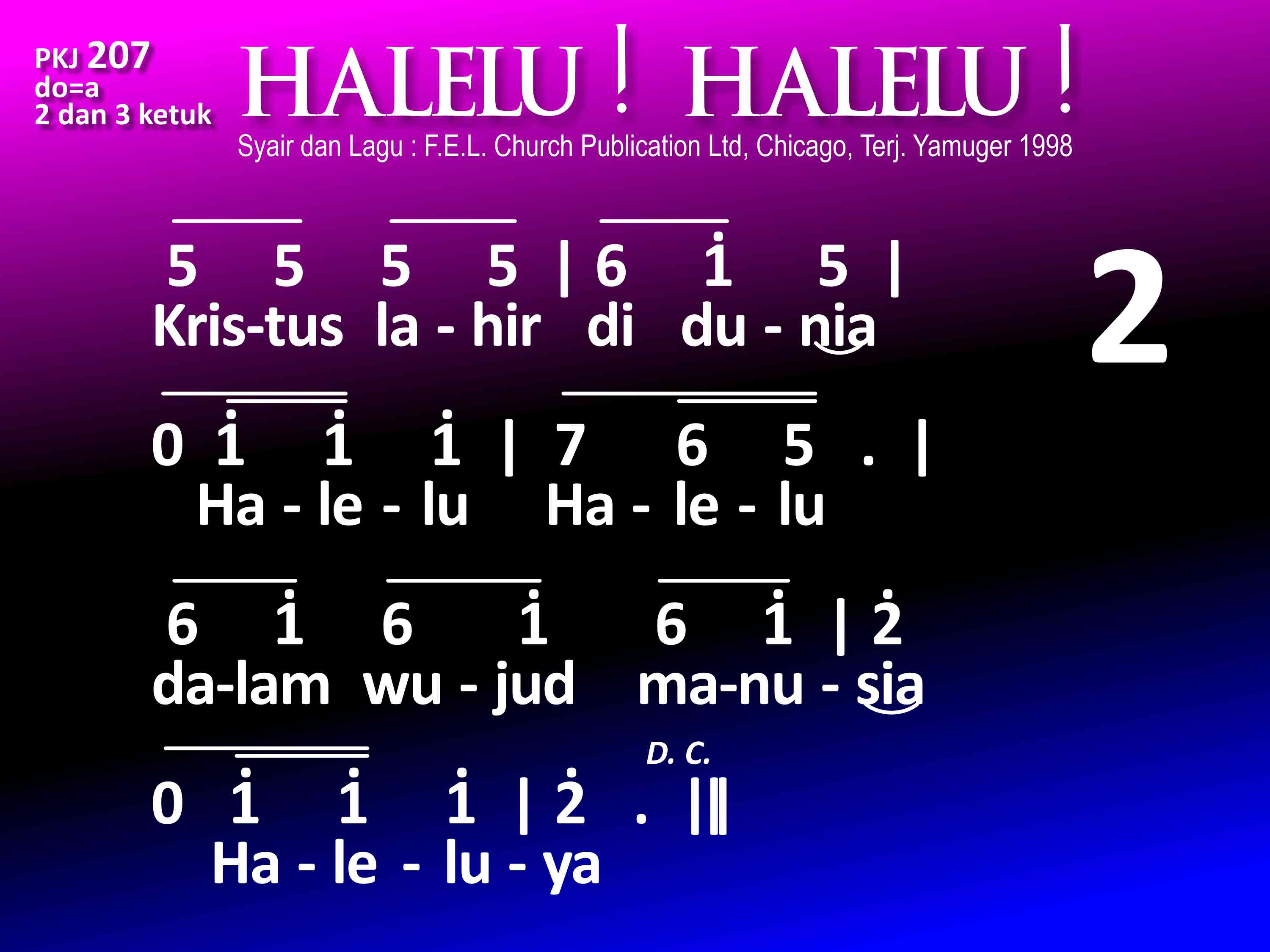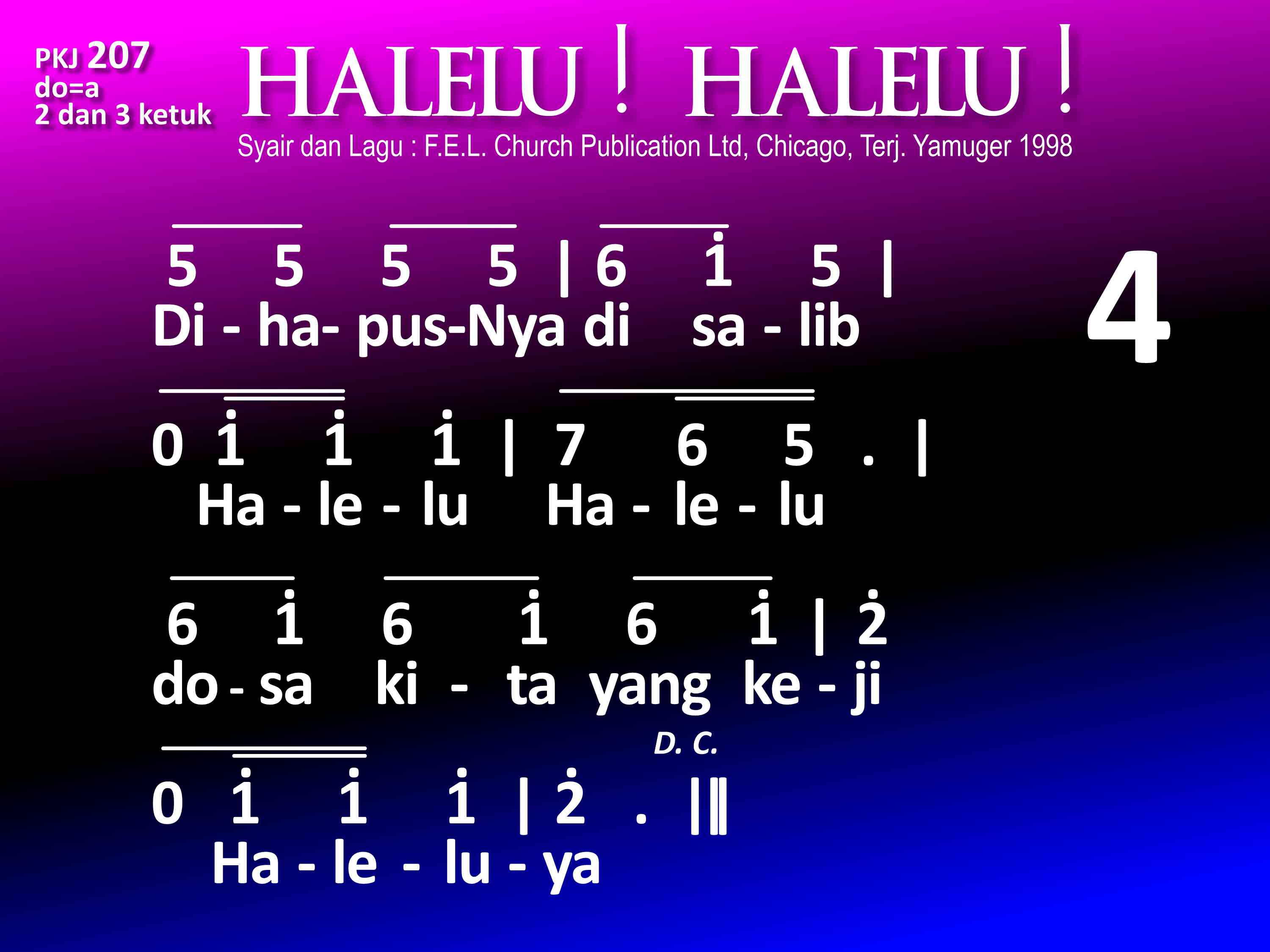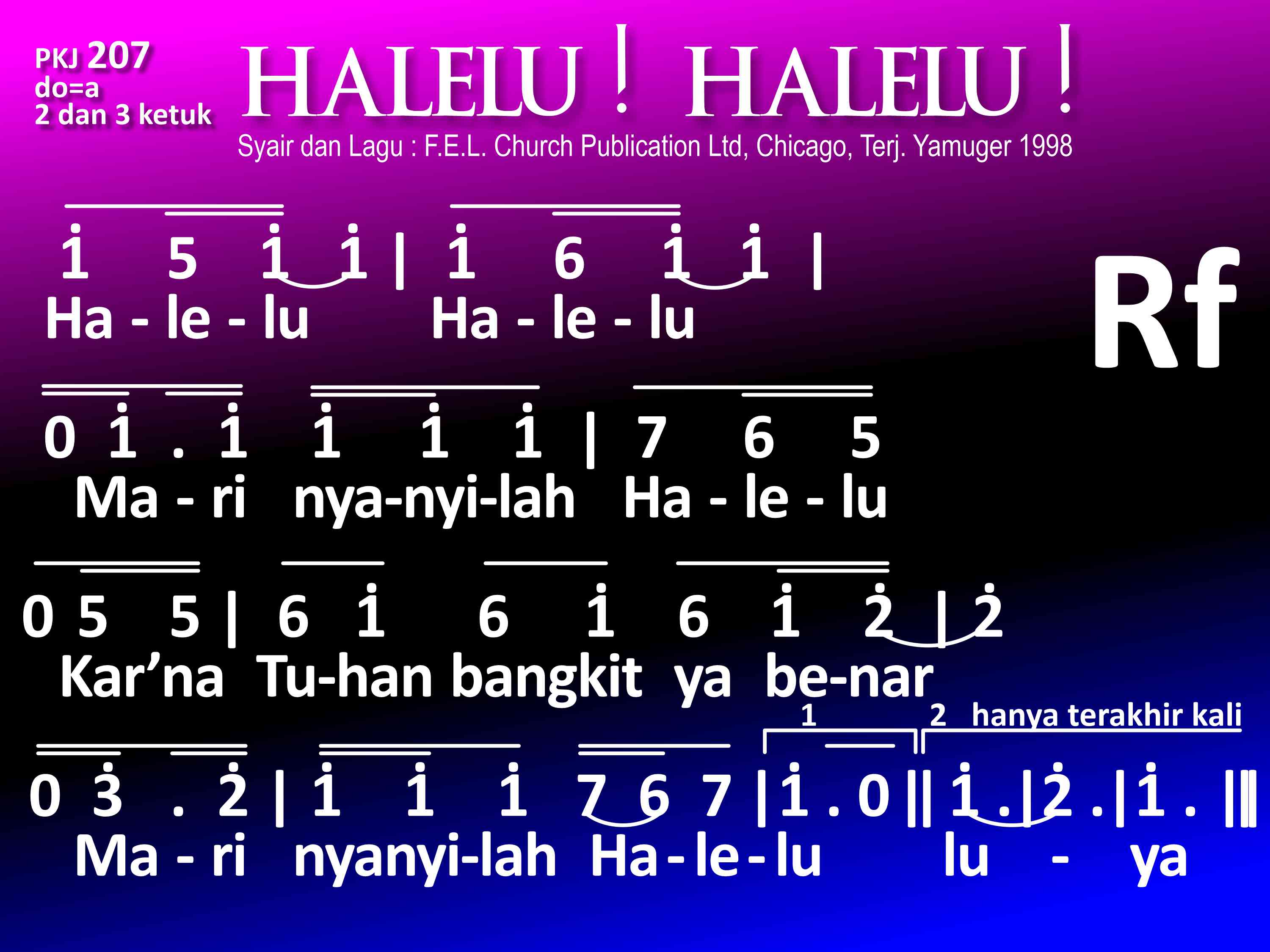 PKJ.207 HALELU! HALELU! Syair dan lagu: Dari buku "Hymnal for Young Christians" by F. E. L., Church Publications Ltd, 22 East Huron, Chicago, III, Terjemahan: Yamuger, 1998 do = a 2 dan 3 ketuk Refrein: Halelu! Halelu! Mari nyanyilah Halelu! Kar'na Tuhan bangkit, ya benar! Mari nyanyilah Halelu! luya! 1. Allah utus Anaknya, Halelu, Halelu! Jurus'lamat dunia. Haleluya! 2. Kristus lahir di dunia, Halelu, Halelu! dalam wujud manusia. Haleluya! 3. Mengabdikan dirinya, Halelu, Halelu! bagi orang yang lemah; Haleluya! 4. DihapusNya di salib, Halelu, Halelu! dosa kita yang keji. Haleluya! 5. Allah membangkitkanNya, Halelu, Halelu! untuk hidup s'lamanya. Haleluya! 6. Bagi kita diberi, Halelu, Halelu! hidup baru abadi. Haleluya!