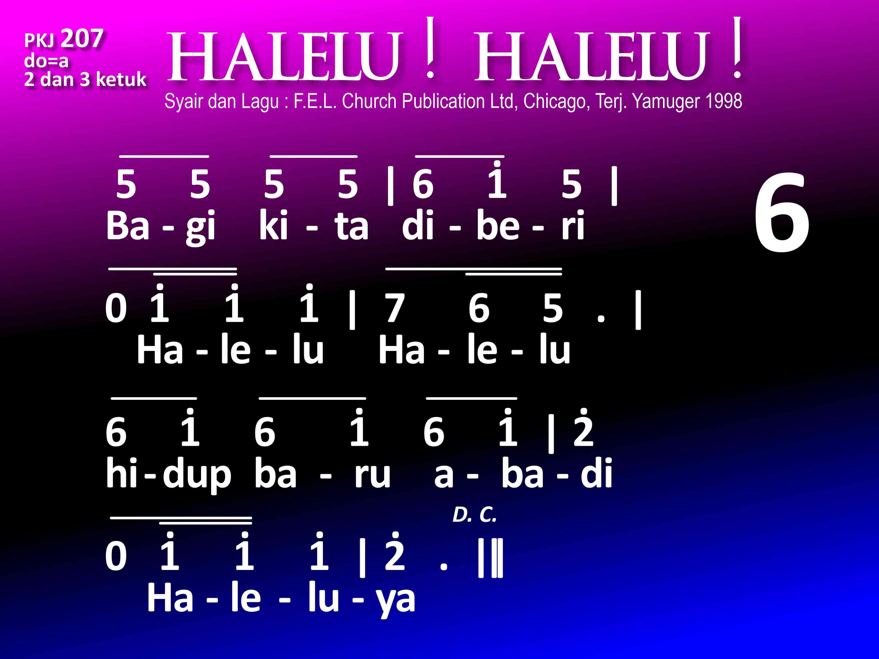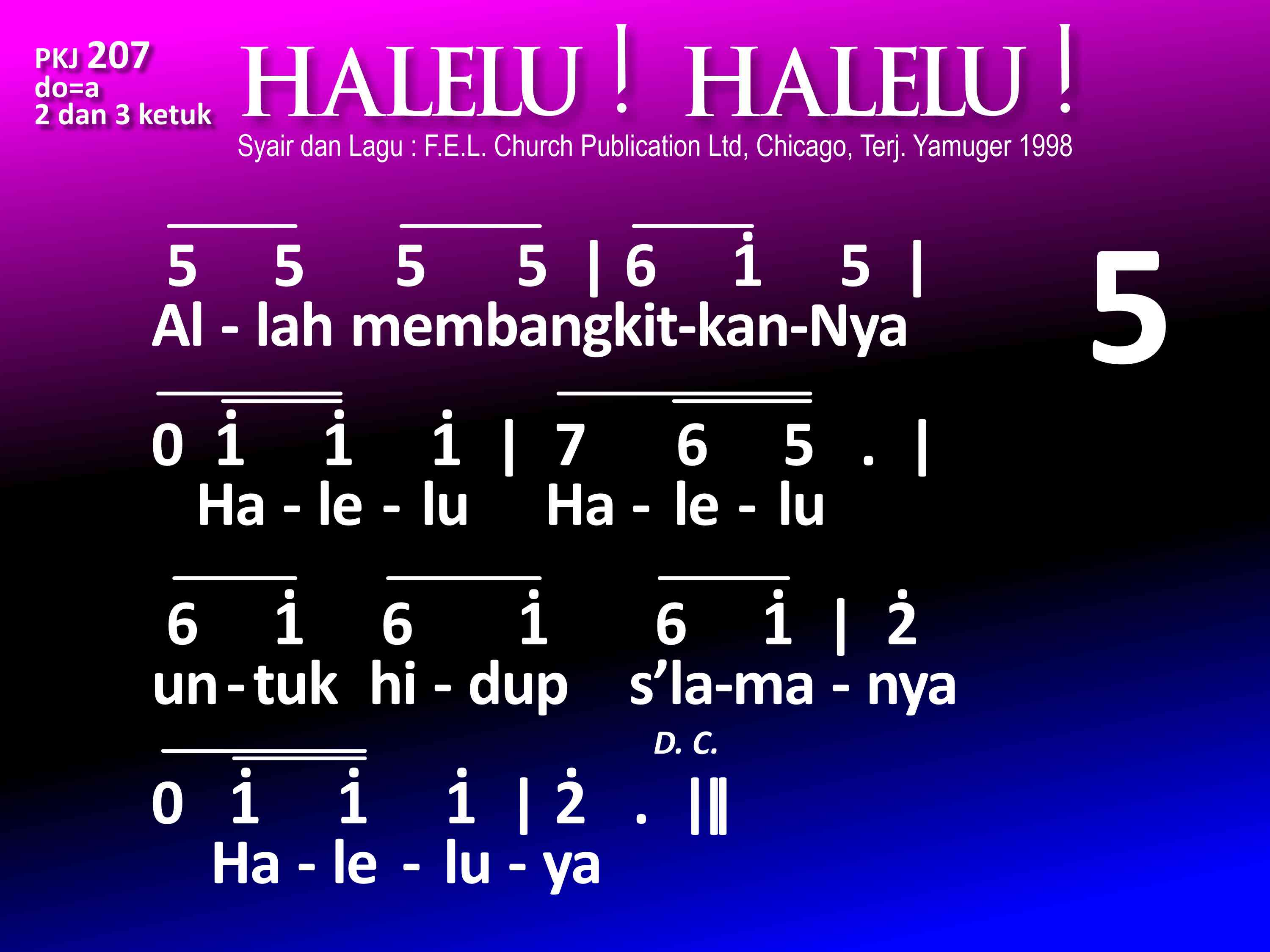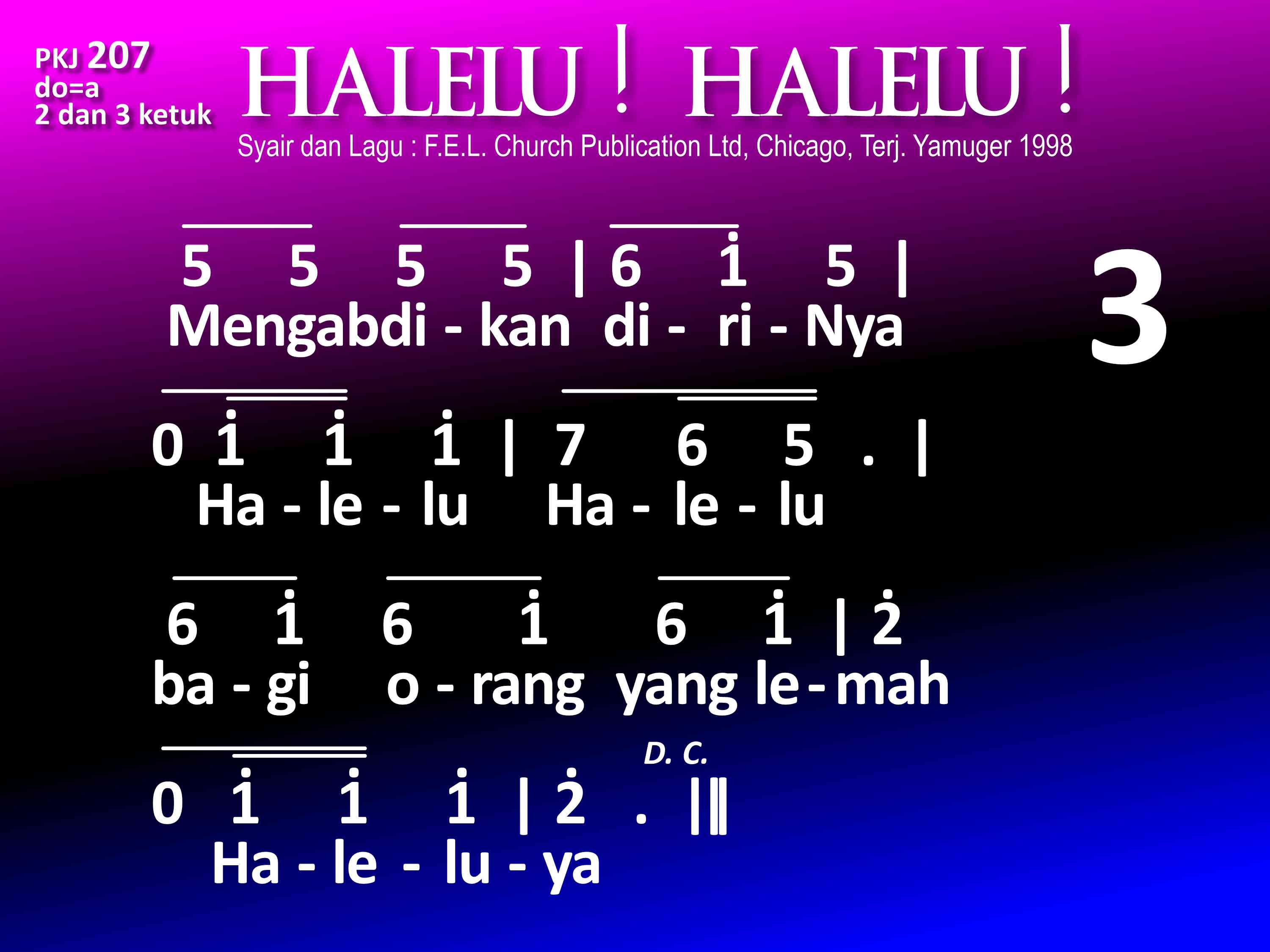 PKJ.207 HALELU! HALELU! Syair dan lagu: Dari buku "Hymnal for Young Christians" by F. E. L., Church Publications Ltd, 22 East Huron, Chicago, III, Terjemahan: Yamuger, 1998 do = a 2 dan 3 ketuk Refrein: Halelu! Halelu! Mari nyanyilah Halelu! Kar'na Tuhan bangkit, ya benar! Mari nyanyilah Halelu! luya! 1. Allah utus Anaknya, Halelu, Halelu! Jurus'lamat dunia. Haleluya! 2. Kristus lahir di dunia, Halelu, Halelu! dalam wujud manusia. Haleluya! 3. Mengabdikan dirinya, Halelu, Halelu! bagi orang yang lemah; Haleluya! 4. DihapusNya di salib, Halelu, Halelu! dosa kita yang keji. Haleluya! 5. Allah membangkitkanNya, Halelu, Halelu! untuk hidup s'lamanya. Haleluya! 6. Bagi kita diberi, Halelu, Halelu! hidup baru abadi. Haleluya!